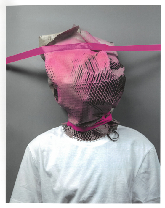 The photographs primarily depict individual human subjects in isolated poses, each person bound, swaddled and often smothered in a variety of wrapping and fabrics, which has the effect of transforming the figures into sculptural forms. Nickerson acknowledges in her conversation with Dan Thawley at the beginning of the book that she chooses her sitters for their ‘proportions, scale and height‚’ and, under her direction, the bodies indeed become another material for her to construct and control. The correlation with Nickerson’s editorial fashion work is clear – her subjects are models to be directed, not muses to inspire, objects wrapped in the leftovers of commercial consumption and linked by association to domestic articles.