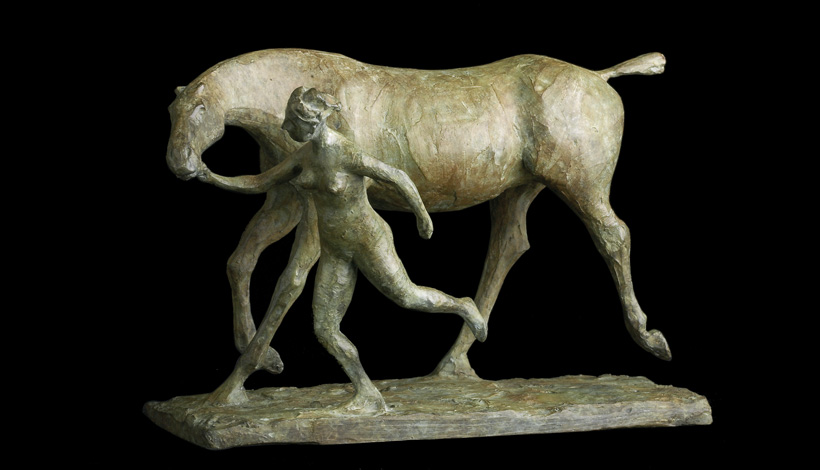 Born in Dublin in 1958, over the past thirty years Olivia Musgrave has become recognised as one of Ireland’s most accomplished sculptors, her work combining aesthetic sensibilities of the ancient and the present-day worlds. Happy to be described as a ‘Classical‚’ artist, Musgrave draws much of her inspiration from the ancient civilisations of the Mediterranean, from Etruria and the Aegean to Hellenic Greece and imperial Rome. Hers is an art based on tradition, but informed also in unexpected ways by contemporary popular culture and media. The stories that inspire her sculptures will be familiar to readers of Ovid’s Metamorphoses and include Pygmalion, Daphne, and Diana and Actaeon. She reads these mythic narratives on different levels, comparing them to opera, an art form which at first glance seems absurd, but which delves into enduring archetypes of the human psyche. The story of Europa and the bull, much beloved in the art of the Renaissance – including paintings by Veronese and Titian – is a recurring theme in her art. Perhaps because her mother is Greek and her father Irish, Musgrave has little difficulty in retelling and reiterating the language of sculpture from the ancient Mediterranean: Fates, Sirens, Amazons and Graces abound. She also taps into a long history of equestrian sculpture. Although not a horsewoman, she depicts these animals with enormous admiration, studying their anatomy and movement in detail. Combining this rich tradition with a sense of playfulness, hers are sculptures to which everyday audiences can readily relate.
