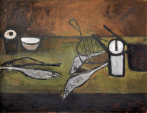 William Scott was a man who liked catching fish and eating them – especially mackerel and sardines. His son recalls him frying the fish he’d caught with the heads on in the French style while on holiday in Cornwall and Brittany. Scott himself has become one of the biggest fish in the market for Irish art and recent years have seen a steady rise in his popularity at auction. Bonhams have two works by him in its 20 November auction that should attract plenty of interest. Still Life with Fish was painted in 1955 and was bought by Cyril Mardell, a Finnish architect who settled in England. He was responsible for commissioning Scott to undertake his first large public artwork – a mural for the entrance hall of the Altnagelvin Hospital in Derry. The painting contains the usual kitchen utensils (pots and pans) that we associate with Scott’s work with the addition of a fish frying basket. The fish’s head hangs over the table in the manner of Chardin – a particular favourite of Scott’s. The table is tilted upwards, distorting the perspective in characteristic Scott fashion. The guide price for this superior Scott is £70,000- £100,000. A much smaller Scott painting, Two Forms, is guiding £15,000- £20,000. This was painted ten years after the fish painting and is a very contrasting work. It is rigorously minimal and abstract featuring two roughly geometric shapes – a white circle and a black inverted triangle against a grey background. There are three good-quality Paul Henry paintings on offer with Bog Pool, guiding at £60,000- £80,000 the most significant. Elsewhere, there is an unusual Daniel O’Neill, Seated Nude, where the figure is shown in a prosaic domestic background rather than against some heroic landscape as is his wont. Colin Middleton is nothing if not unpredictable in terms of style and at first glance you’d be forgiven for thinking Ardglass was a work by Jack B Yeats. However, this dark expressionistic painting was completed the year after the death of his long-ailing and dependent mother and, amongst the somber tones, the flashes of greens and yellow suggest feelings of liberation amidst the melancholy. This unusual Middleton is guiding £12,000 to £18,000.