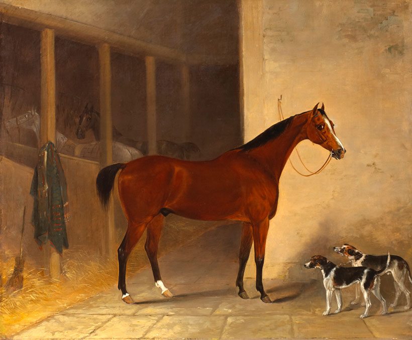 Roller, a Bay Hunter with Hounds Jolty Boy and Jackey Boy in a Stable