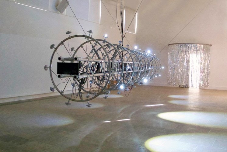 The courtyard of the Centre Culturel Irlandais hosts Andrew Kearney’s ‘Mechanism’, a light and sound installation developed by the artist during a residency at the centre in 2015. Through a veil of silver marks, visitors are drawn into the natural stage of the courtyard where a silver orb will perform before them, and their footsteps animate a light and sound installation. This installation reflects Kearney’s fascination with the built environment, and the ways in which it can inspire memories, desires, or dreams.
