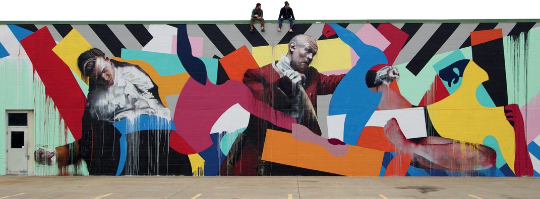 Unusual among street artists for his often abstract work, Dublin-born Maser is rarely removed from his origins in graffiti, often characterized as the hieroglyphics of rats, precipitating urban collapse. But whilst more mature Irish street art is often deployed to brighten up slums or prettify hoardings, it has exploded in ambition in recent years, with Maser as one of its ambassadors, city-hopping across Europe, the US, Canada and Australia to mount ever larger murals, psychedelic mazes and candy-coloured labyrinths. It’s all fun, pop, retro, vibrant, and makes people smile; eclectically dipping into post-war American Geometric Abstraction – particularly Hard Edge, Colour Field or unashamed Op Art; from Ellsworth Kelly and Frank Stella to Bridget Riley.