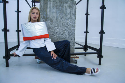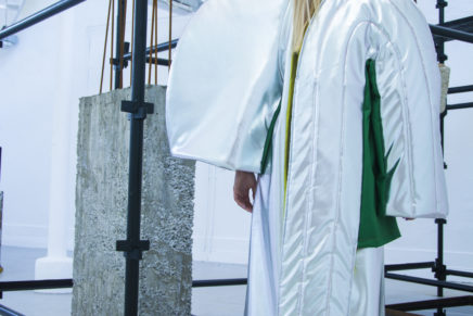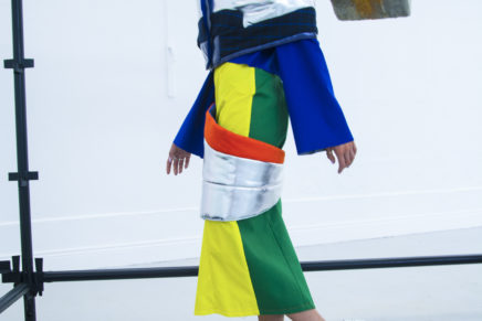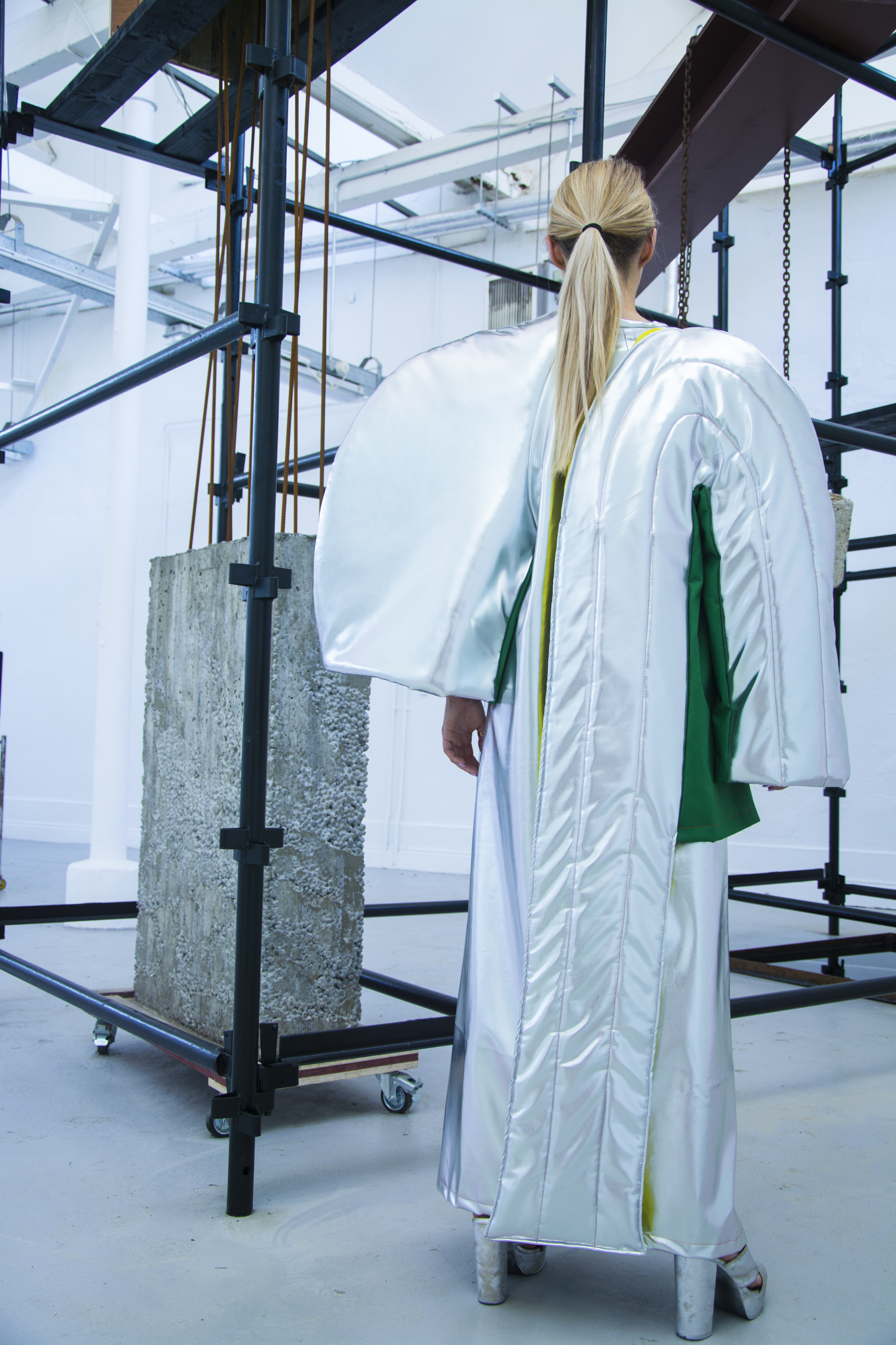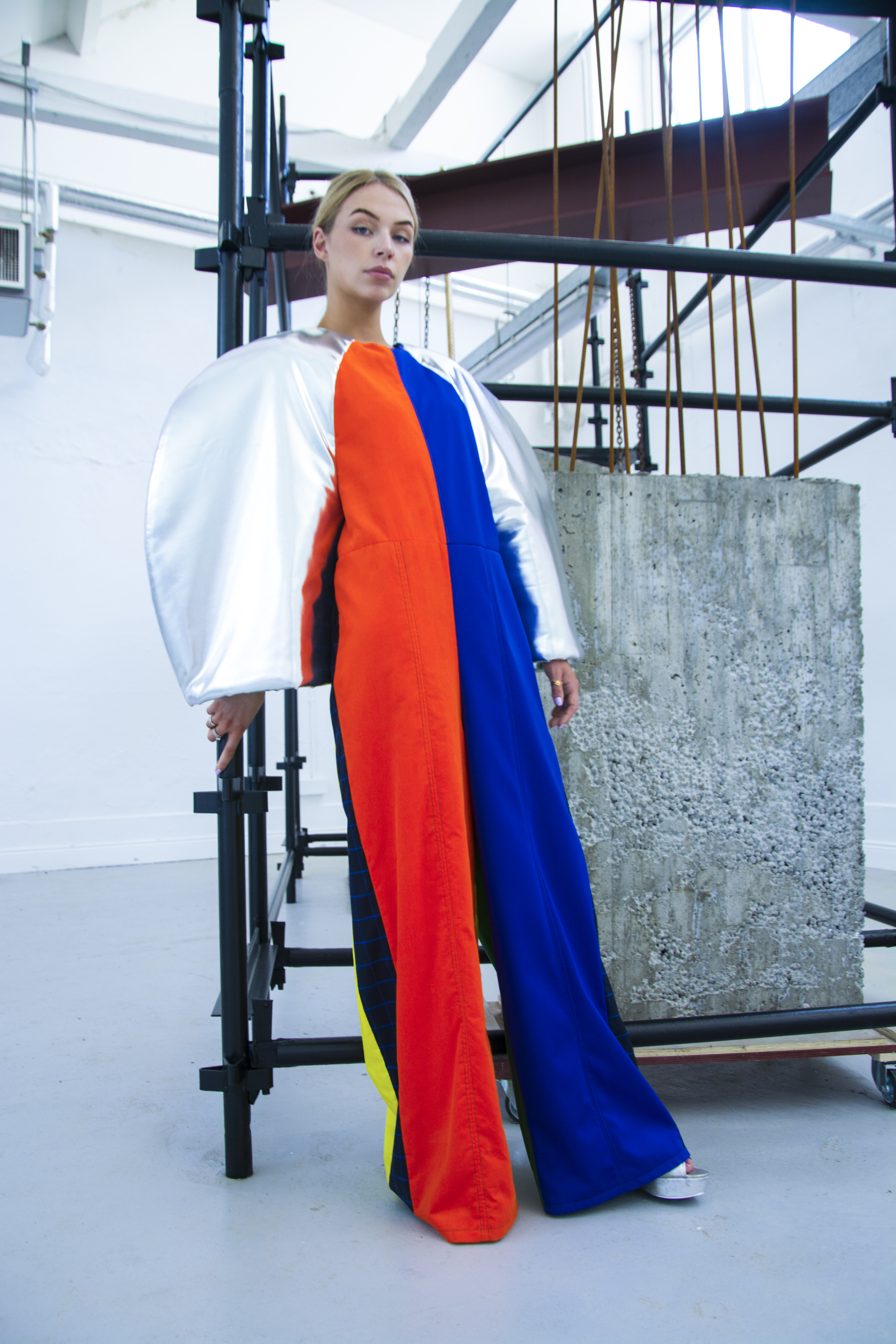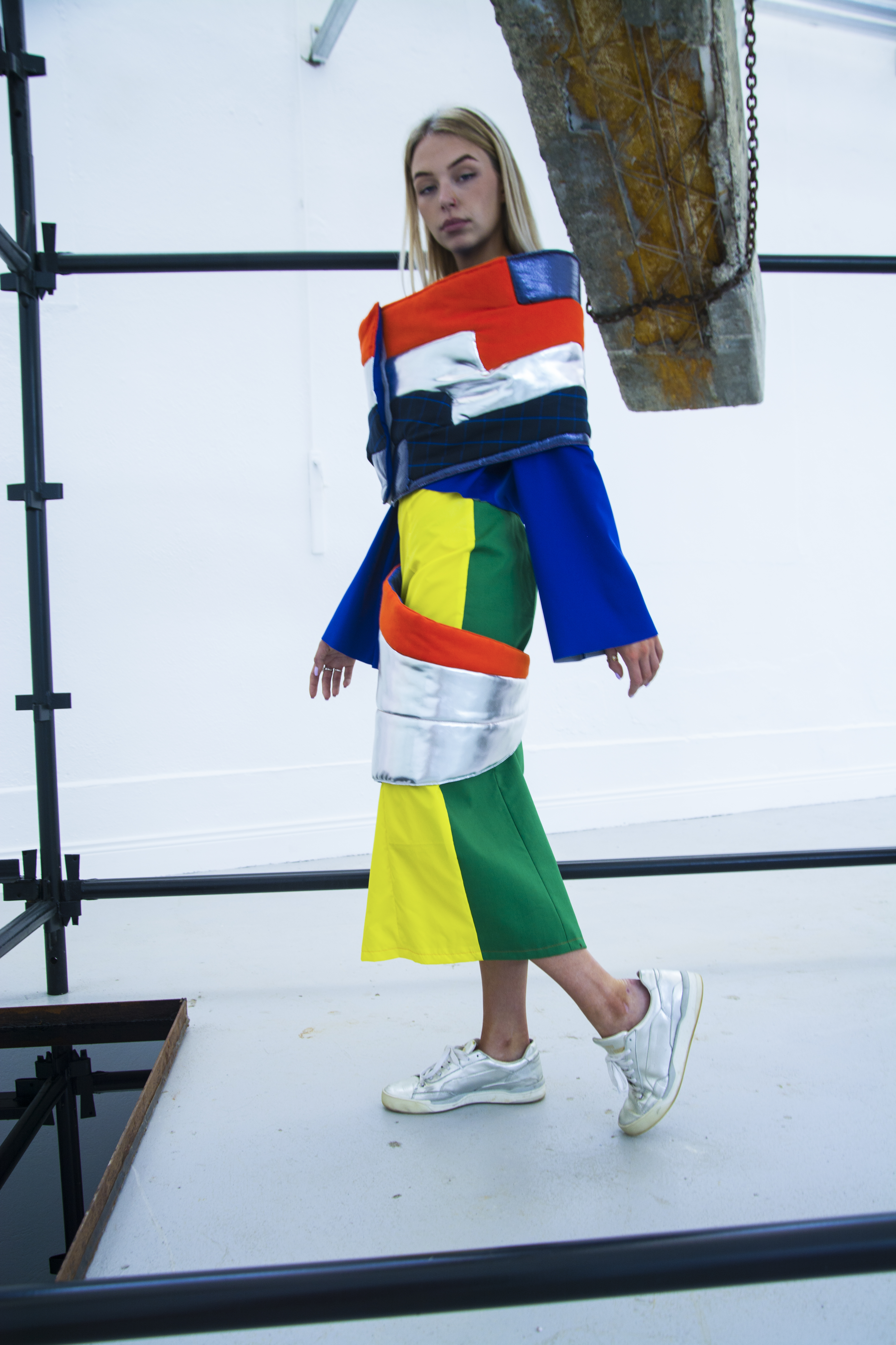 The art of construction and architecture influences and inspires my work. ‘Linear Connection’ was inspired from one of the ‘Heatherwick Studios’ buildings. It is made from a metal foil material with the function of the building to be an Art Studio.I have constructed a functional wearable collection with a cool contemporary twist using creative pattern drafting.