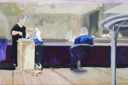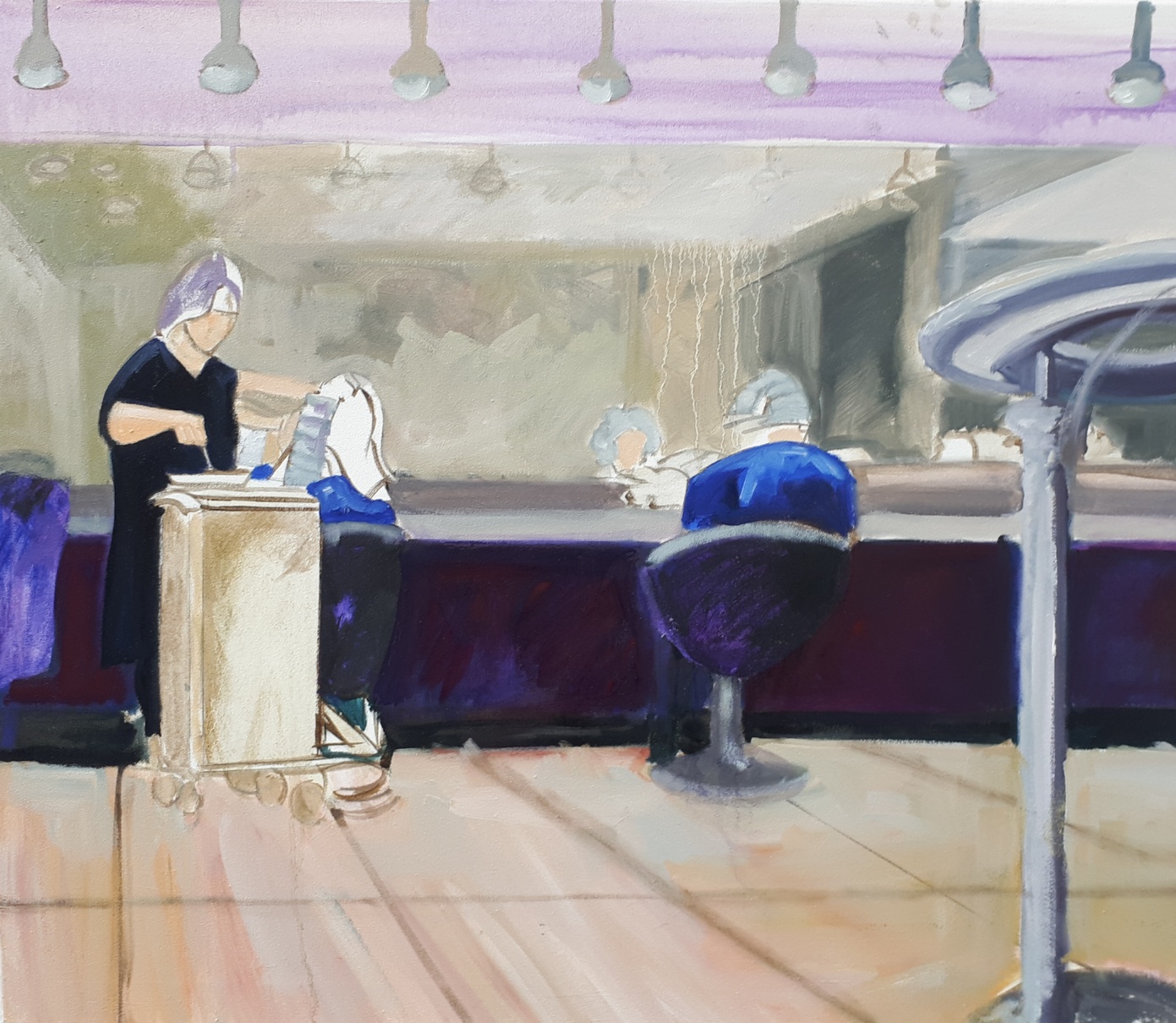 My current work explores the subliminal world of gendered spaces through the lens of both male and female beauty. My work invites the viewer to enter the imagined and constructed spaces of the beauty salon and the barbershop, while considering the permeable boundary between the inside and the outside. Using collage and photography the work is executed in Oils on Canvas.