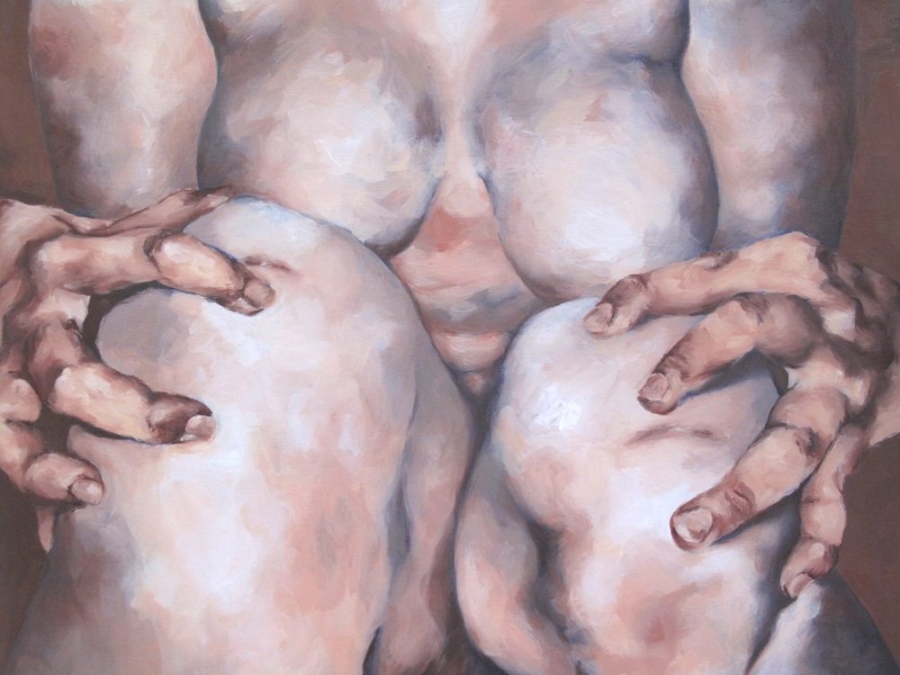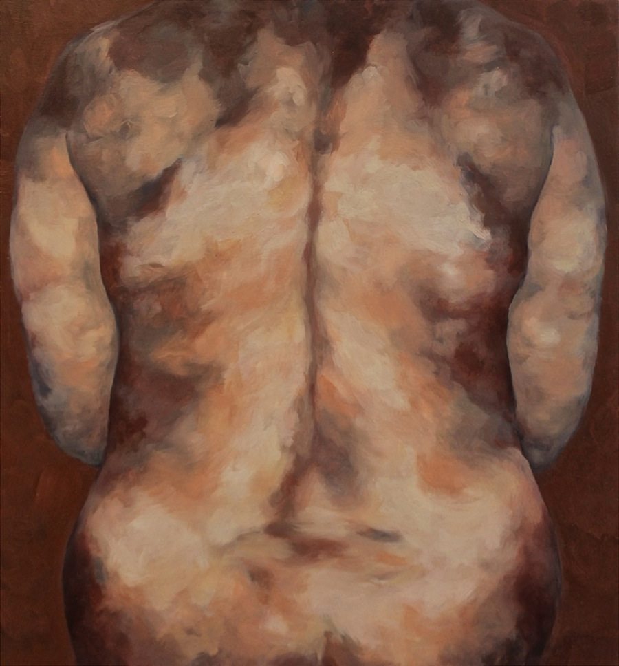 These works are selected from a series titled “Thin Skinned”. The figure is the primary subject of her paintings with a focus on treatment of skin and distortion. She is interested in the idea of embodying issues of abuse that are usually not noticeable on the surface through skin, which is a fragile surface itself that tends to be covered and protected.