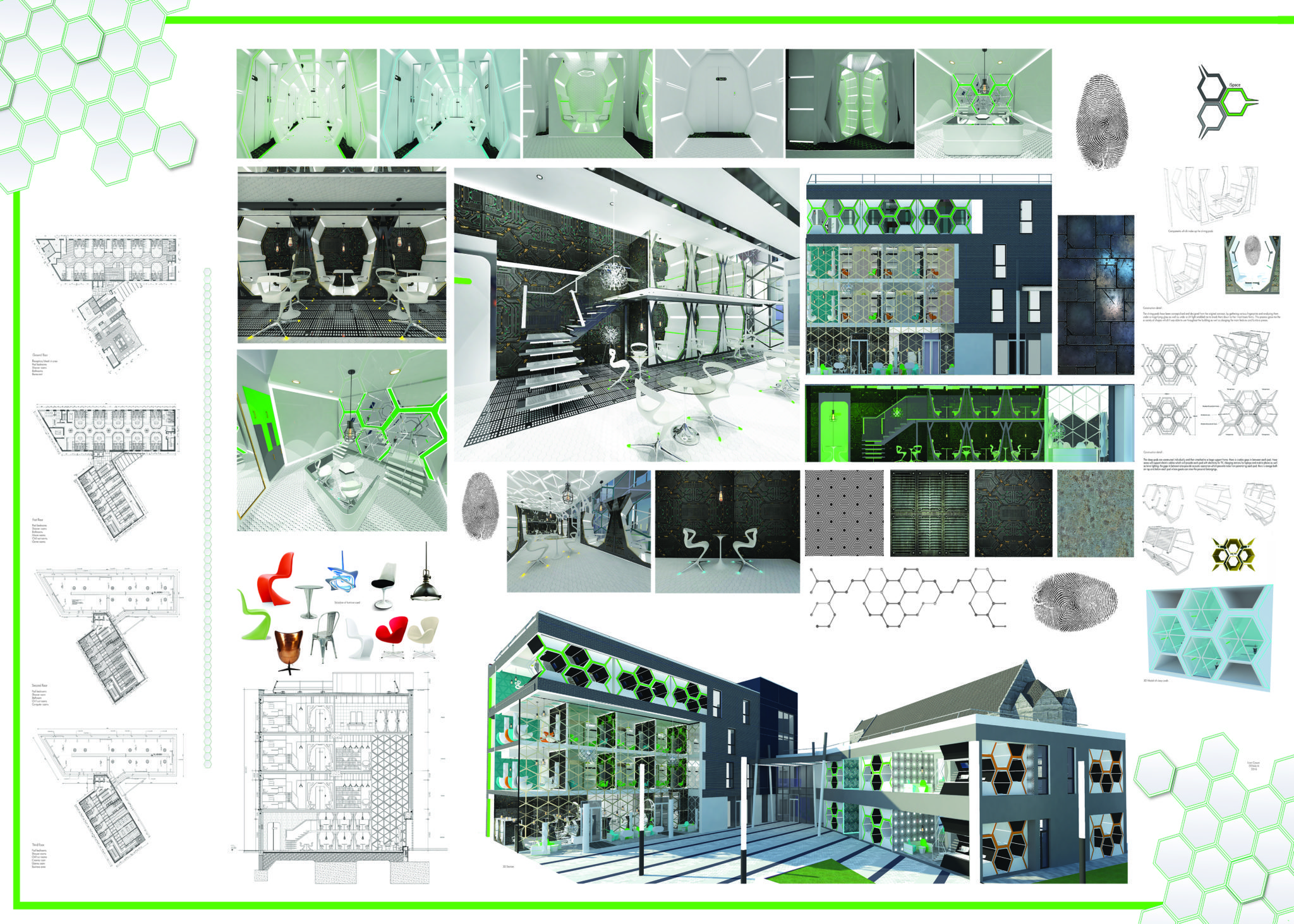 The aim of my final year design thesis was to take an existing building and convert it into a unique pod style hostel. The overall concept for the design throughout the interior is based on analysing various fingerprints under a magnifying glass as well as under UV lights. All of the major elements within the hostel are bespoke designed from the sleep pods and dining pods to the shower pods.