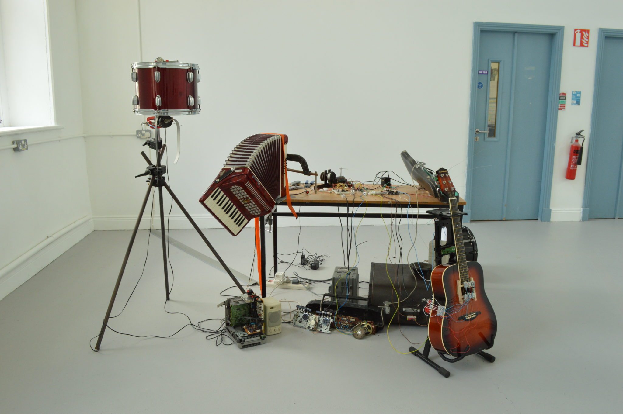 A musical instrument is perceived as an object devised for purpose as an extension of the human body and cannot function without its other body. Through the process of manipulation and hybridization of musical instruments and electronic media, my work interrogates the utilitarian hegemony associated with composing music and causes a shift in the sensorium, dislocating the instrument from tradition
