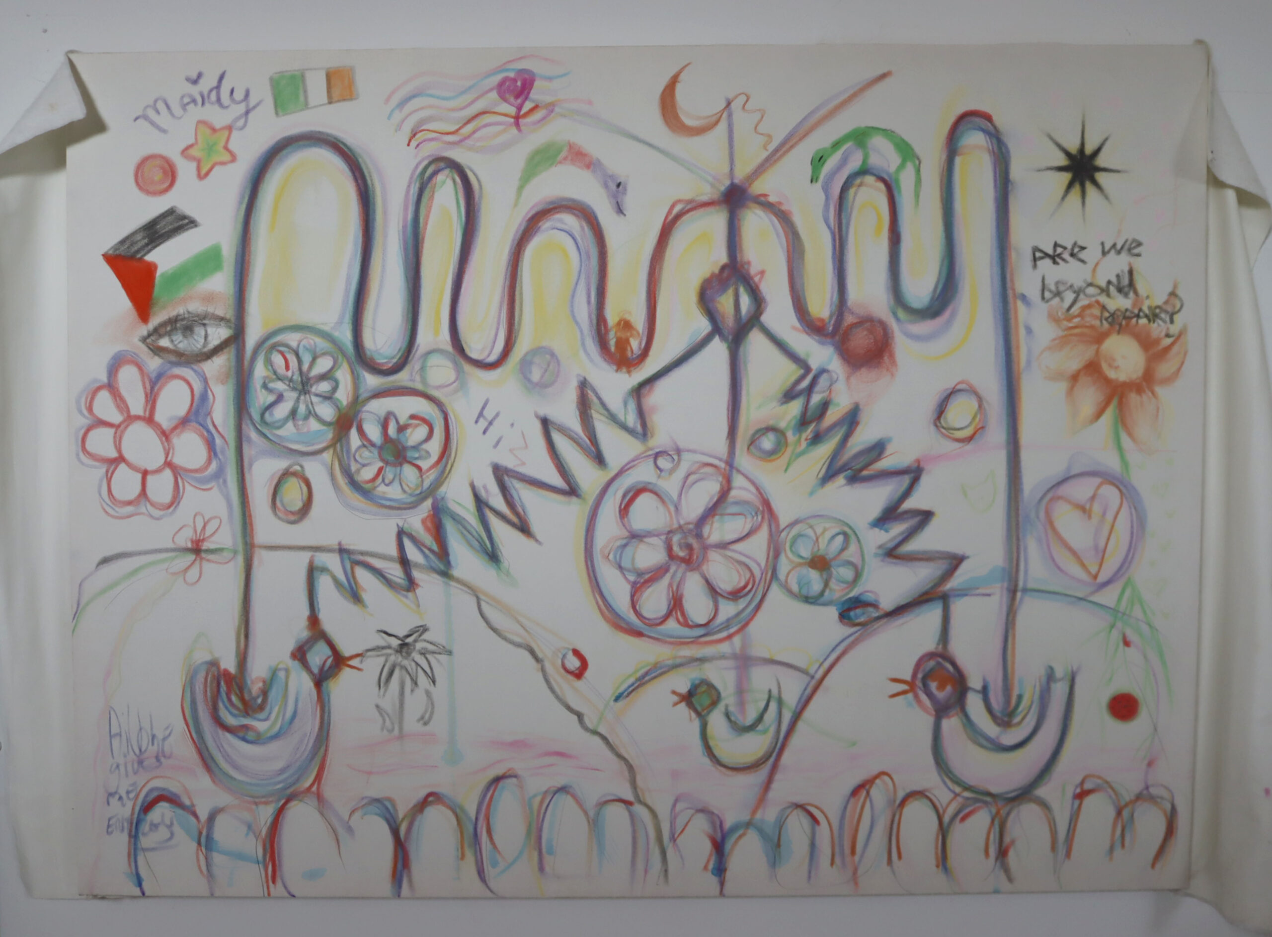 I am an interdisciplinary artist based in Cork. My work explores imaginary realms through installations involving drawing, moving image, and sound. I am inspired by music and traditional storytelling to create artworks which welcome the viewer into playful and contemplative journeys. I focus on the idea of the individual within a collective, exploring patterns of movement through animation and performance. I am motivated by these explorations to keep a flexible practice which can share ideas through process-based artworks. My latest practical project has focused on creating an ‘interactive’ animation. I drew my animation in the traditional frame-by-frame method, and created a back projection screen that could simultaneously be used as a canvas, allowing myself and viewers to ‘trace’ the animated shapes as they move around the screen. Taking inspiration from Seanchaithe and megalithic Irish sites such as Loughcrew, it has been my intention with this project to create a mythological story which thematically and visually echoes these aspects of Irish culture. I use the visual language found in Cairn T, Loughcrew, to track movements of emotional growth. Through my drawing practice I connect with ancient practices of communication and modes of visual expression which are intrinsic to us as humans. I hope that my work can interact with the public similarly to Irish folklore - evolving slowly over time, while fundamentally remaining the same.