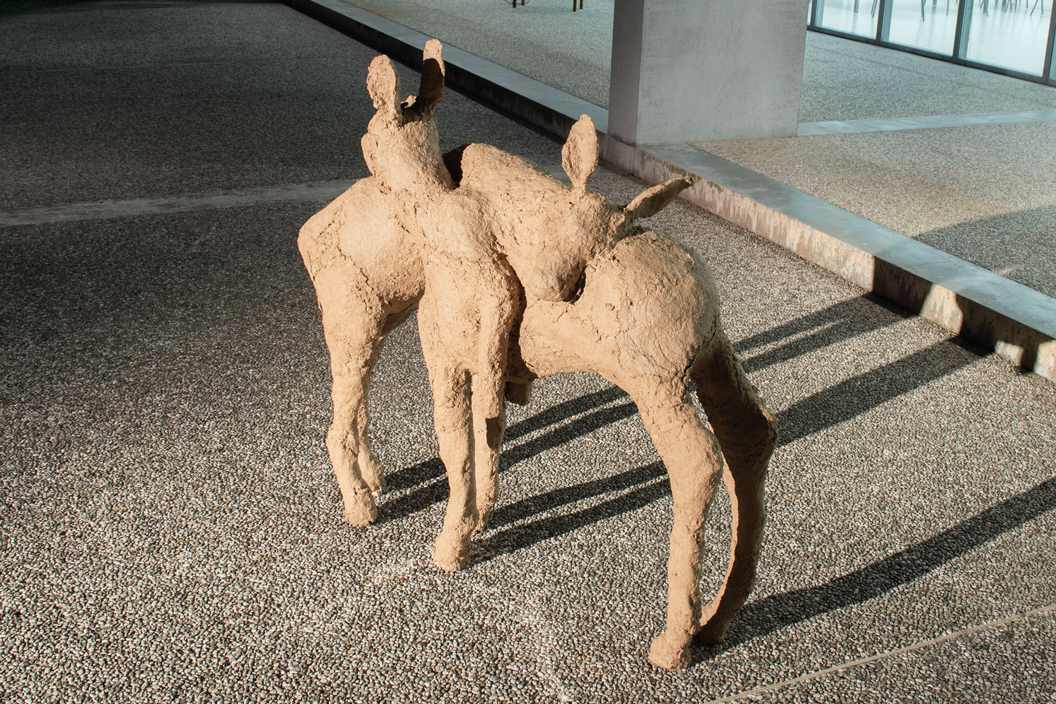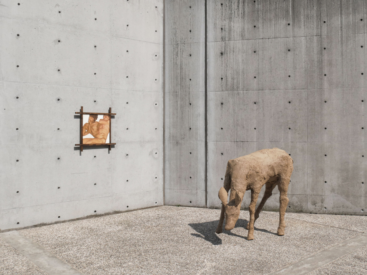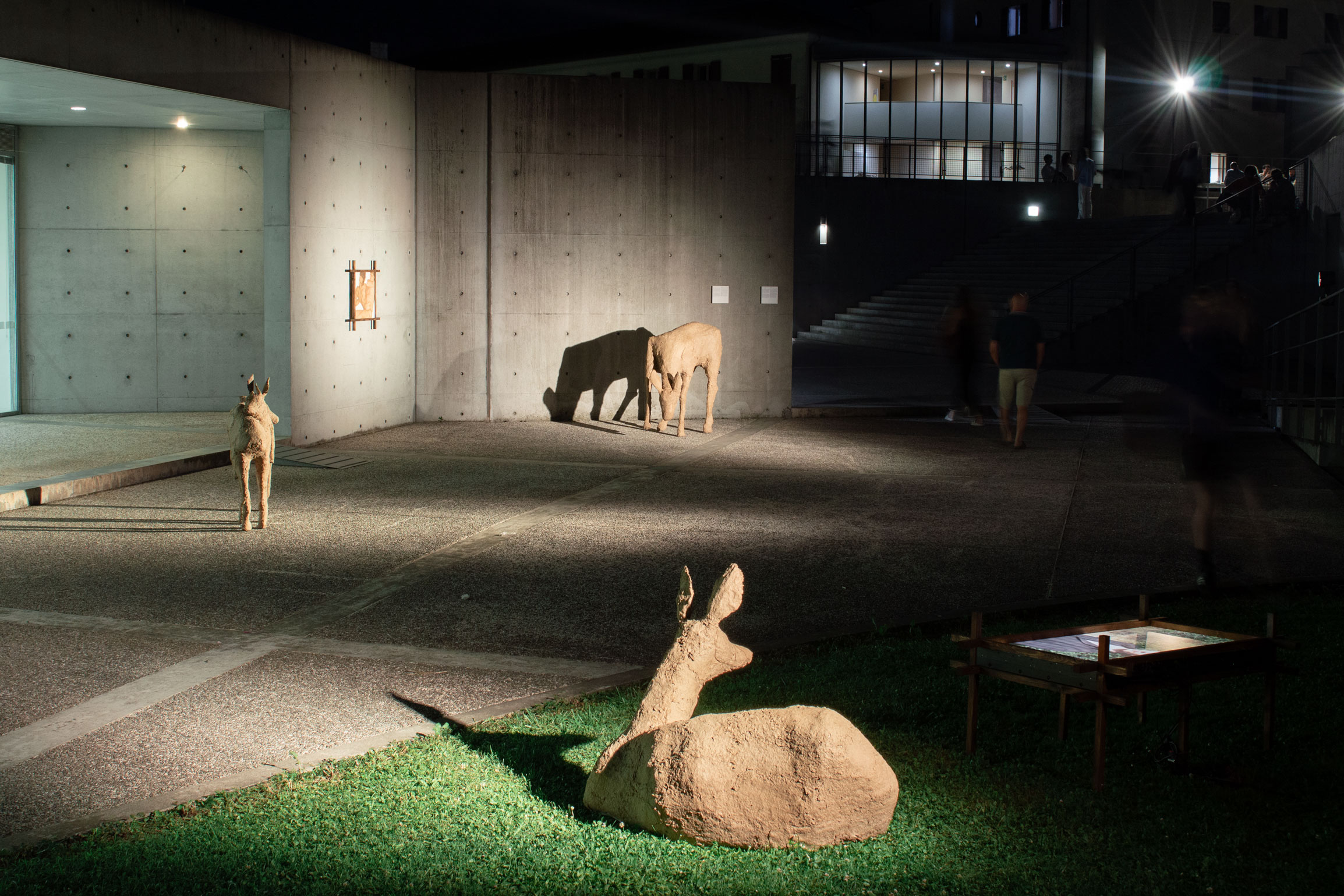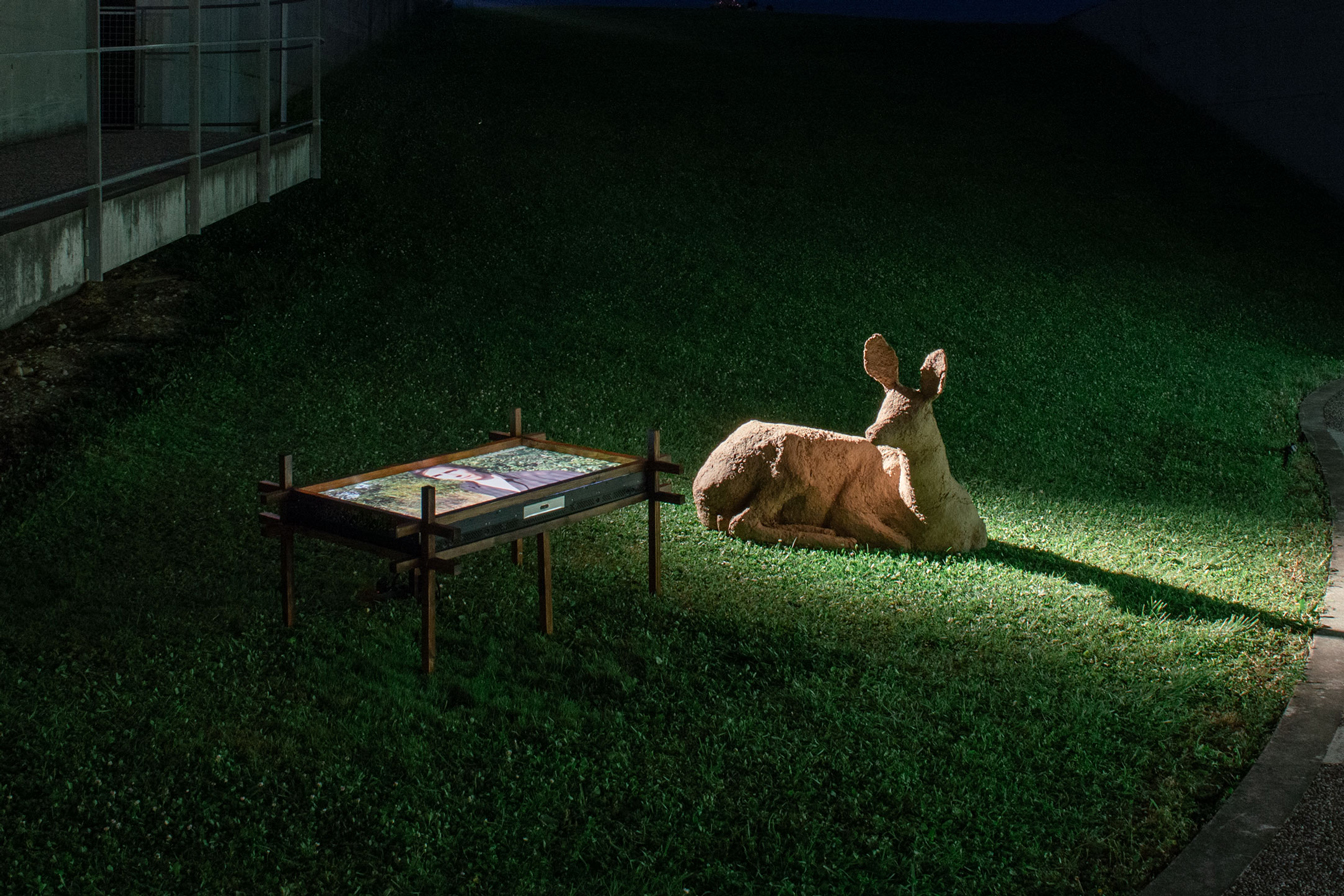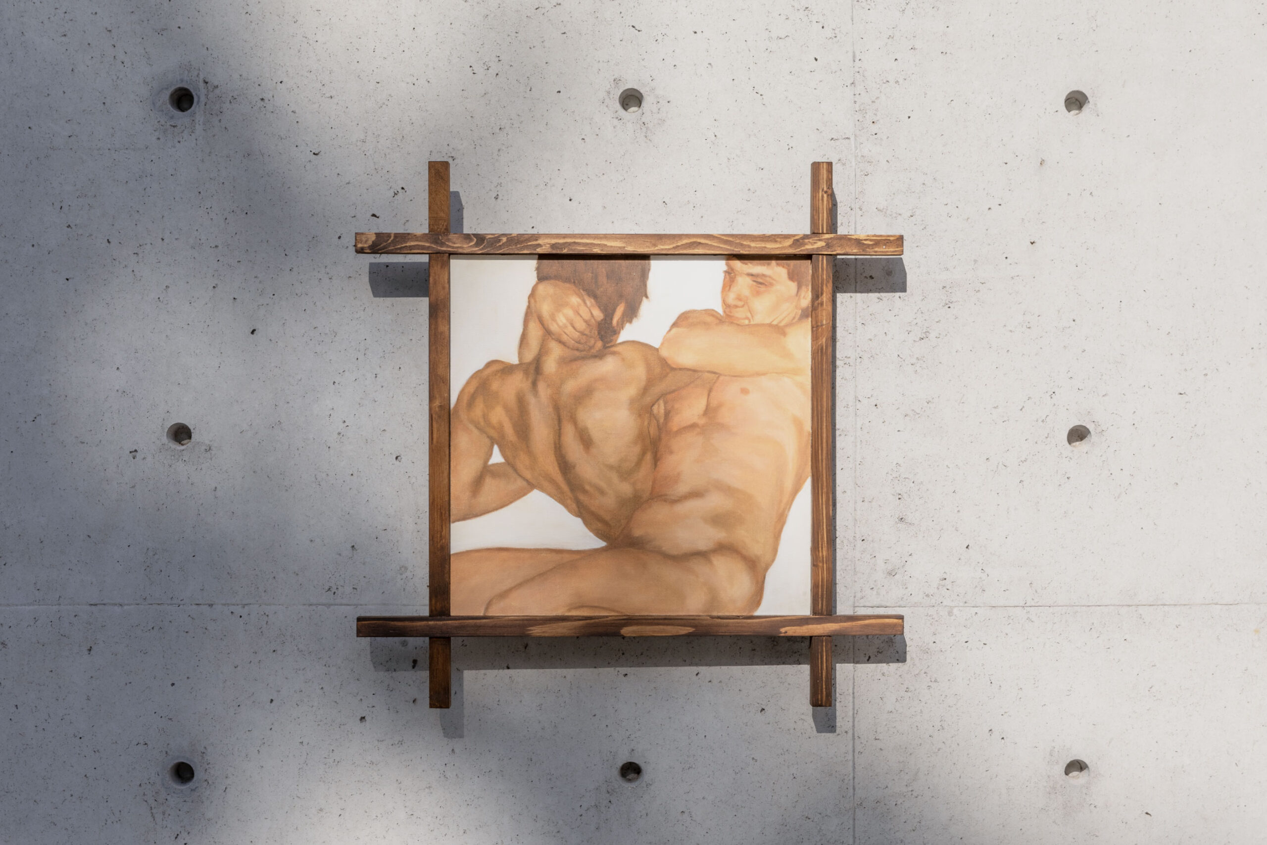 Closed Set is a continuation (reimagining) of my NCAD degree show, exhibited just one year ago. In this iteration, the work explores feelings of emotional dissonance concerning gay pornography. While aware of the pitfalls in the industry and the issues with consuming porn, it is often where sexuality is first explored, constructed and exercised. Meaning, there is a complicated intimacy and memory attached to this material. Closed Set attempts to re-contextualize gay pornography from the artist’s past, removing explicit or inappropriate content and allowing it to be viewed with this level of intimacy. Processes of minimising and amplifying gay pornographic material, produce a work in four parts. A database film using clips from popular gay porn ‘Czech Hunter’ to endlessly generate converging storylines. An audio piece compiling soundtracking and clips from director Joe Gage’s ‘Heatstroke’. An oil painting depicting two young men taken from an image posted to ‘hotwrestlingguys.com’ and finally four life sized deer sculpted in paper-mache. To display the works, a television, a set of speakers and a canvas are housed in dark stained wooden frames, and placed outside in a natural setting. Amongst the deer, the content is given the agency that comes with being innocent or neutral, to be viewed as though part of the landscape.