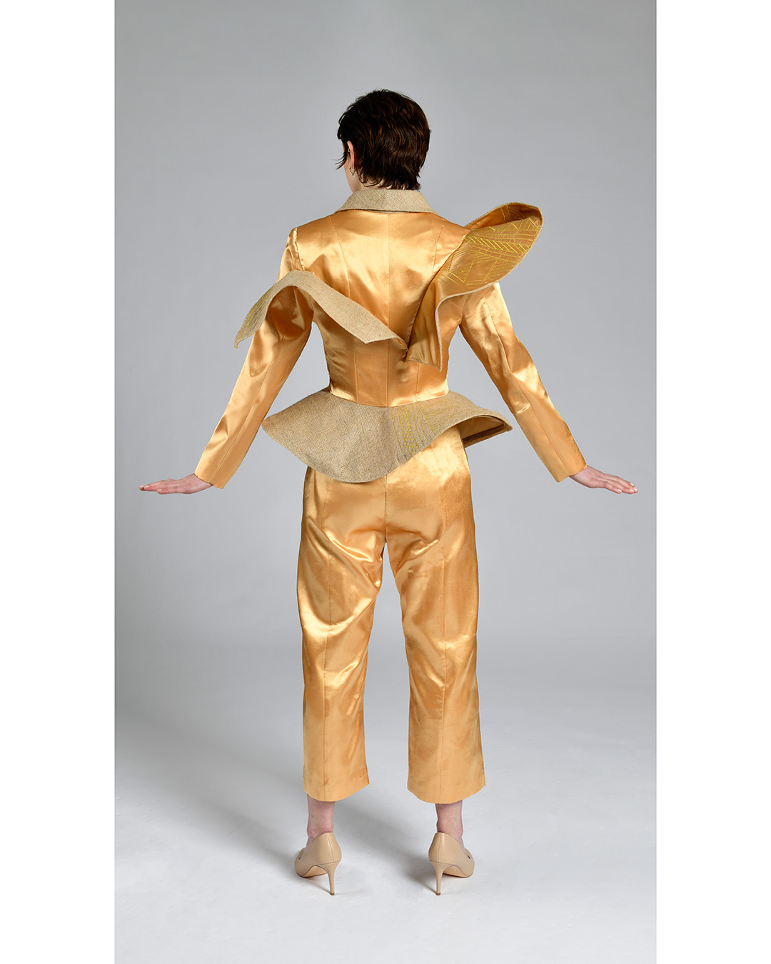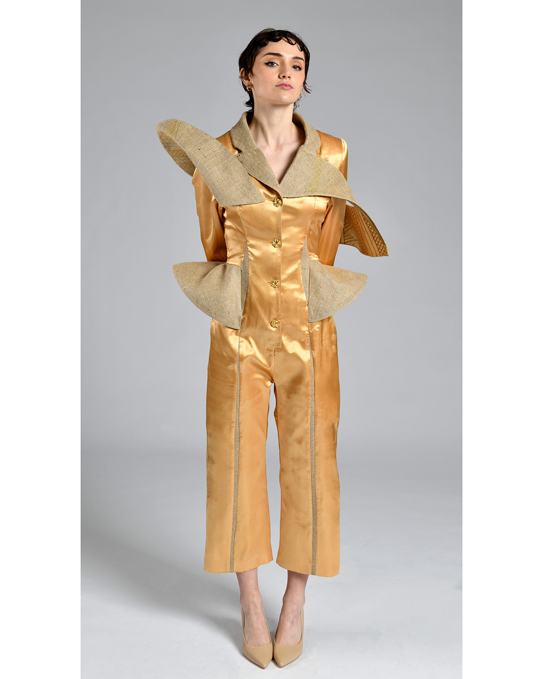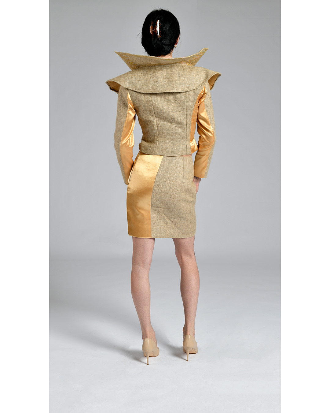 My collection, titled 'Gold and Clay', explores the contrast between the burial status of the rich and the poor during Bronze Age Britain and Ireland. During this time, it was common for people to be buried with various artefacts that they believe they can take with them to the afterlife. The most common artefacts found in graves include clay pottery, bronze tools, and gold jewelry. The higher their social status and the wealthier they were, the more gold and bronze they were buried with. I explored this divide between the rich and poor through two different fabrics – rough hessian and shiny satin. Hessian is known for being a cheap fabric used for rucksacks. Its rough texture resemble that of a Bronze Age clay cremation pot. In contrast, satin is associated with expensive gowns and luxury. Its smooth and shiny surface resemble the gold artefacts found in burial sites. The richer the person, the more satin in the garment, the poorer the person, the more hessian in the garment.