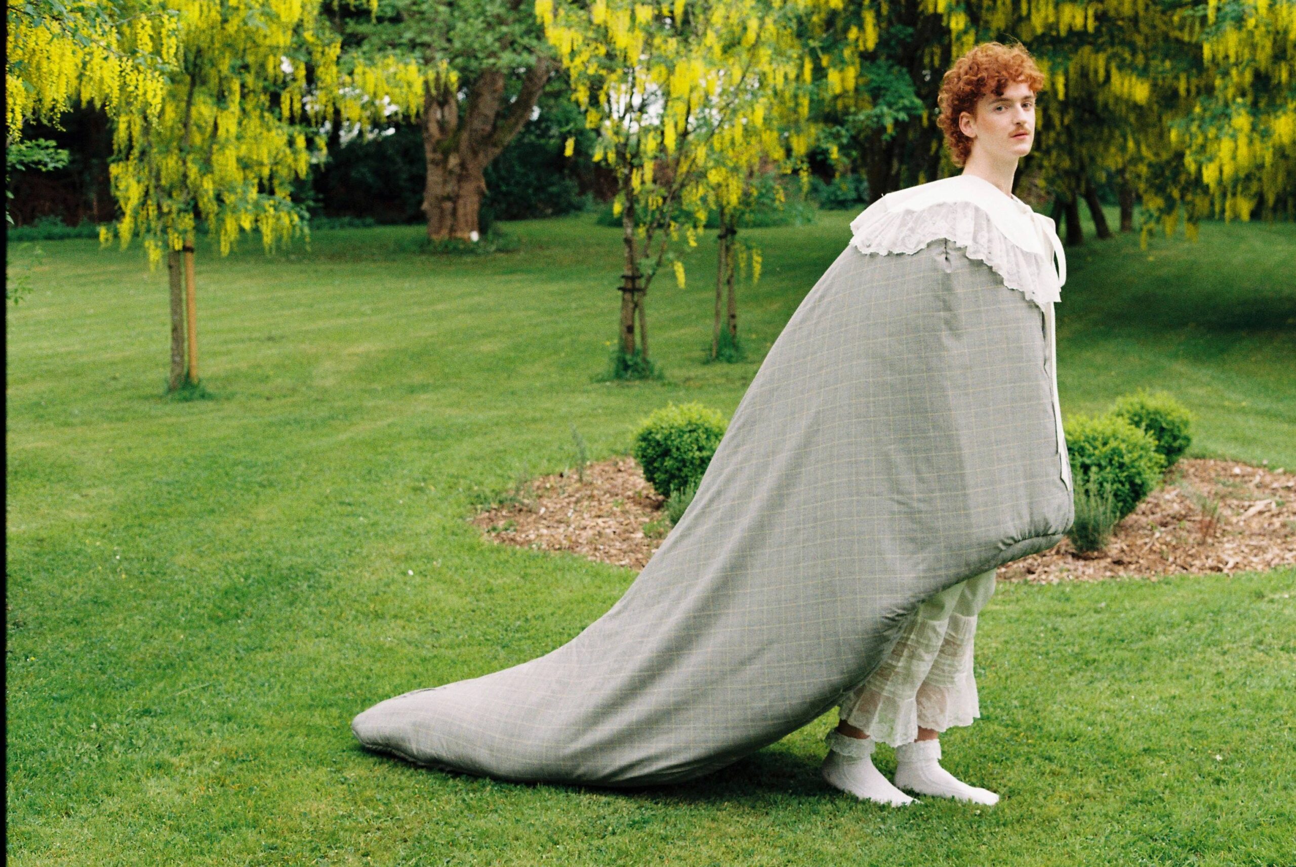 This collection is inspired by a sense of nostalgia for an upbringing online. The work is inspired by the absurdity of meme culture and the overwhelming amount of digital references that we witness on the internet. Playing with the memories of these digital references, and blurring them with real-life experiences, I have created stories and characters that embody the space between these two memories; the online and offline. Simultaneously glorifying the absurd humour of cyber spaces while appreciating the romantic and beautiful aspects of traditional fashions, the characters, or line-up, personify the uncomfortable familiarity of living through the digital age.