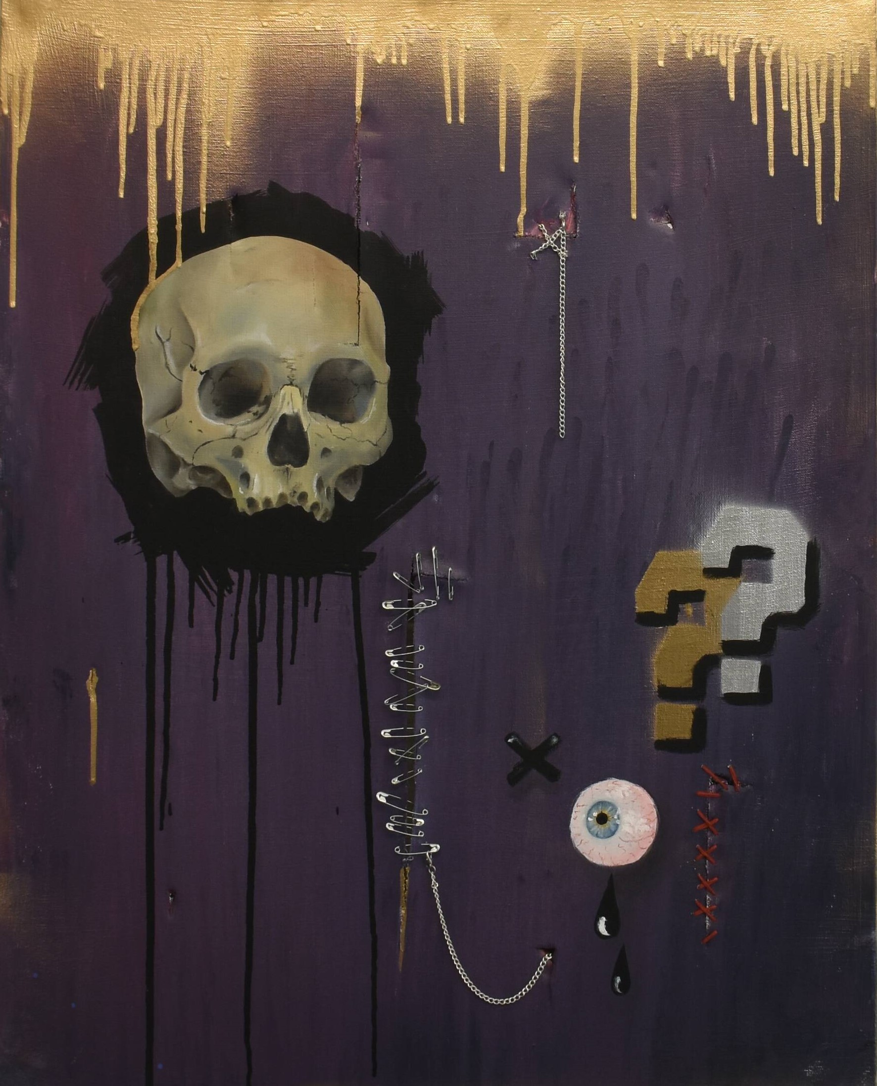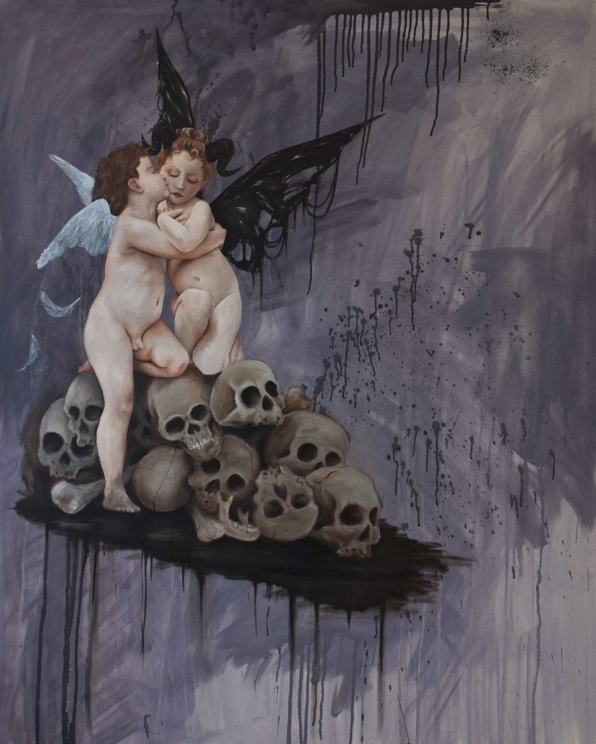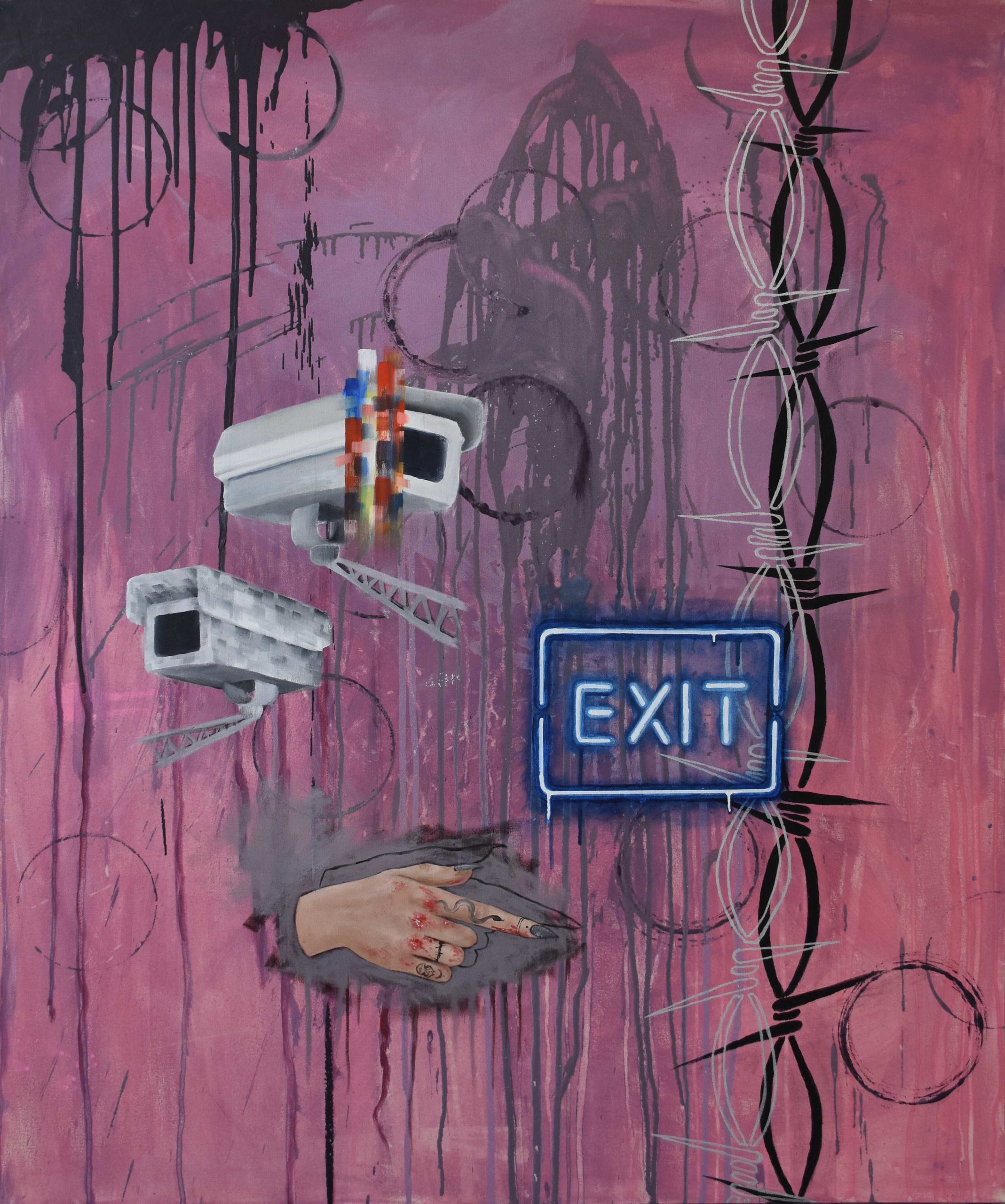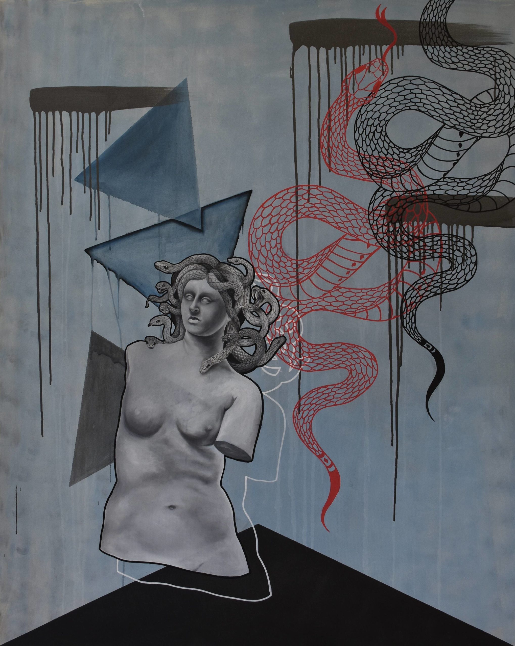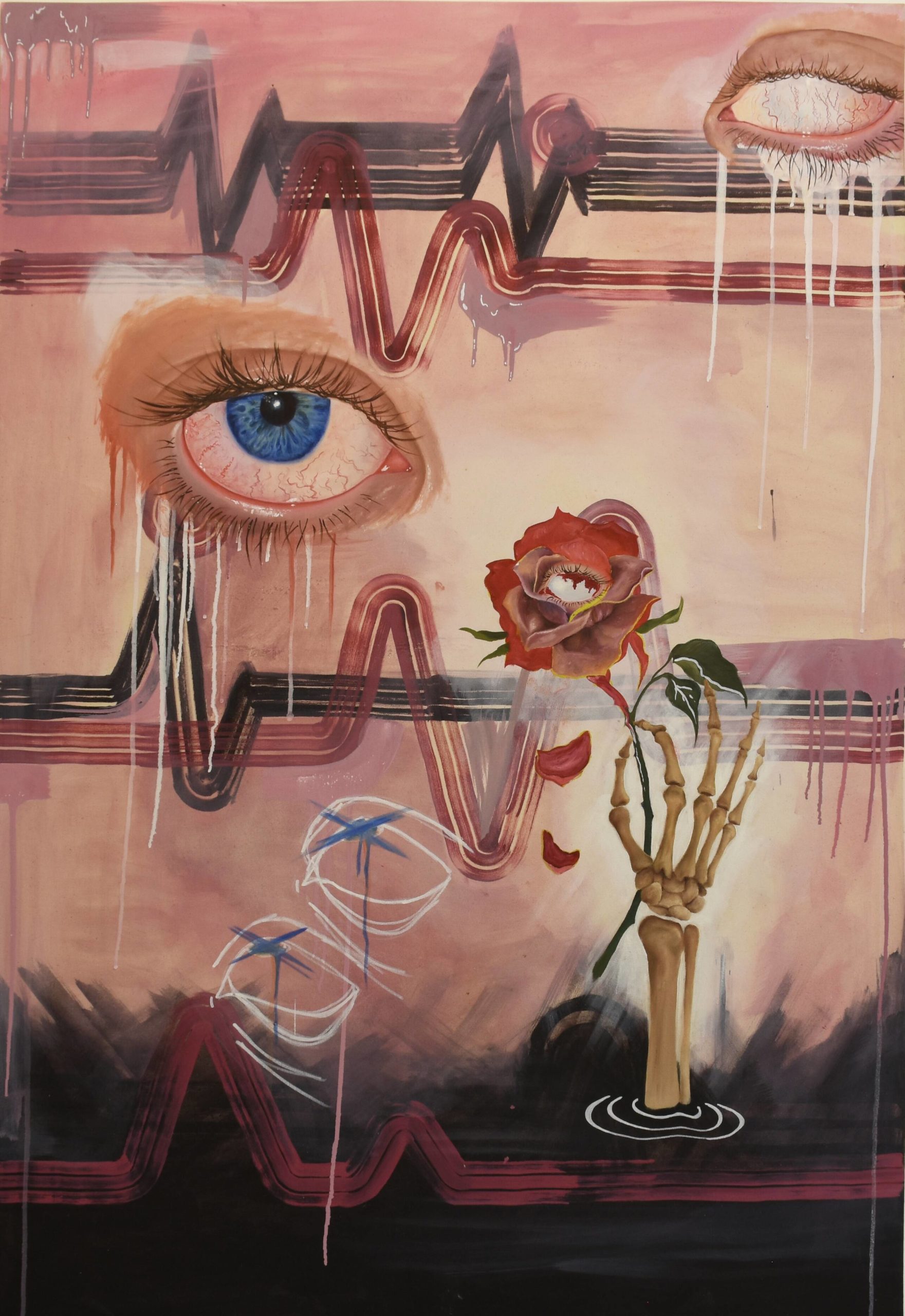 My current practice revolves around the idea of excess and explores various uses of imagery and compositions. The refined subject matter chosen for each piece hovers in front of an organically chaotic background creating a sense of balance. There is a somewhat sardonic atmosphere across the work, as if to have an attitude towards the viewer. The ambience of teenage angst may awaken memories of a younger self with drawings dispersed across their schoolbooks. For some, these paintings and their oddly familiar imagery might even have a nostalgic feel to them.