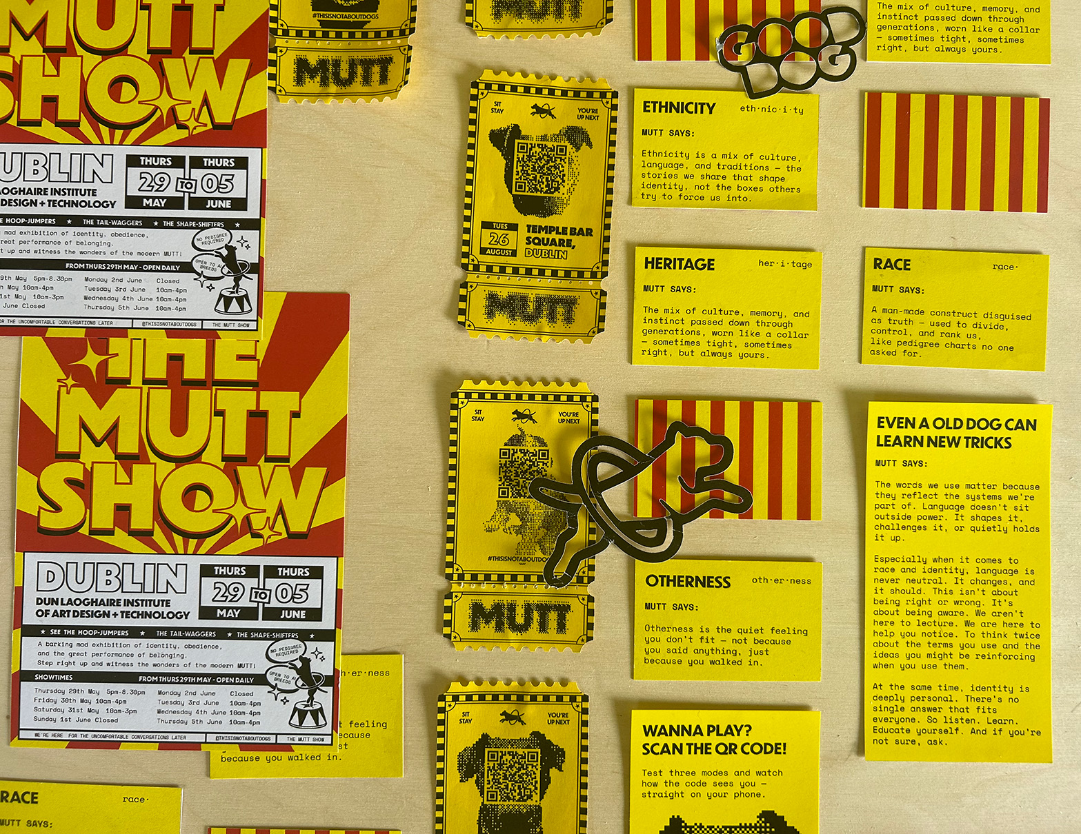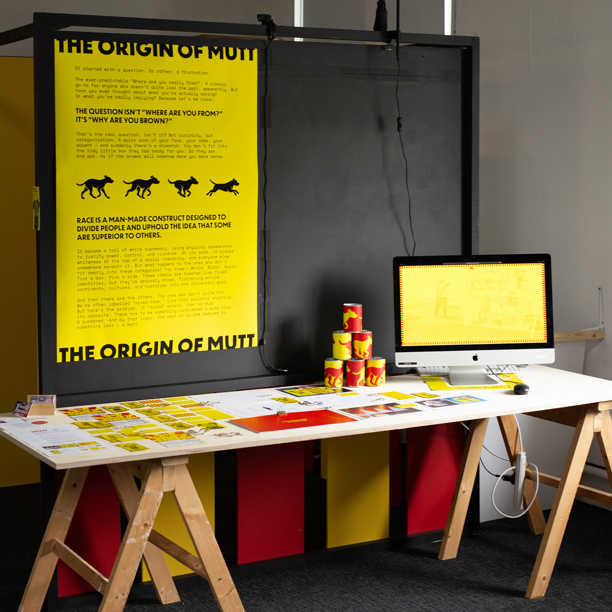 MUTT is a multi-platform project exploring race, identity and belonging. It began with a question I’ve been asked all my life: “Where are you really from?” and grew into a critical response to how society demands categorisation, especially from those of us who don’t fit neatly into racial or cultural boxes. The project takes its name from the word “mutt” and repurposes it as a metaphor for how ideas of racial purity are constructed, valued and policed. If we accept the term “mixed race”, we also have to confront the uncomfortable truth of a so-called “pure race”.Using the visual language of circus acts and dog shows, MUTT satirises how people are made to perform identity. At its core is an interactive installation that turns viewers into live ASCII-generated video feeds, stripping away obvious identity markers while leaving the body recognisably theirs. It explores perception beyond the usual social, cultural or racial cues. Surveillance, play, and absurdity converge to challenge how we’re seen, judged and displayed. I wanted to make people laugh before they realised they should feel uncomfortable. My approach isn’t moralising, but it is confrontational. MUTT refuses to explain itself and invites viewers to ask why they ever expected it to.Outside of MUTT, I work as a multidisciplinary designer at the intersection of design, art and technology. My practice uses visual language to provoke, interrupt and complicate. Whether I’m building an installation or designing a poster, I’m asking the same thing: who made the rules, and what happens when we stop playing by them?