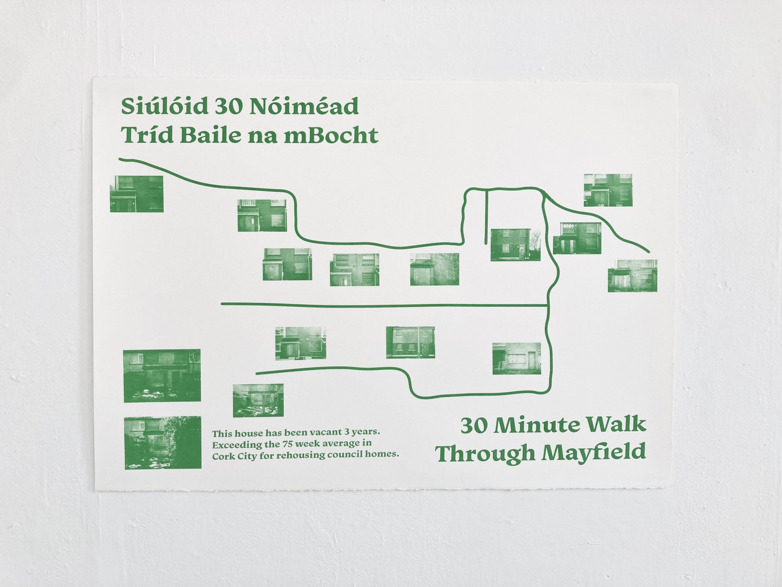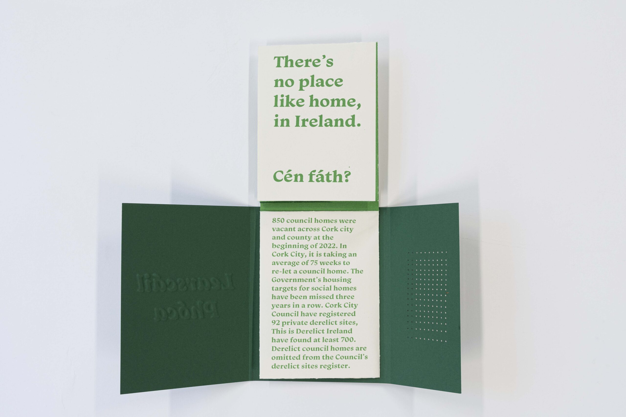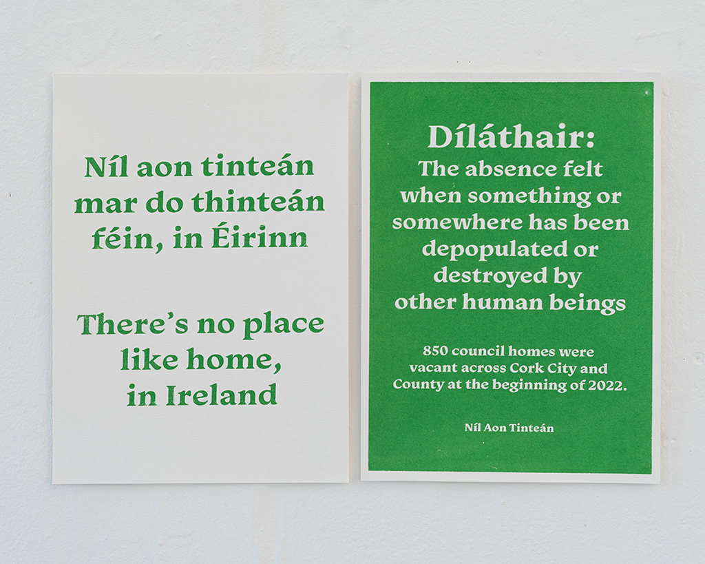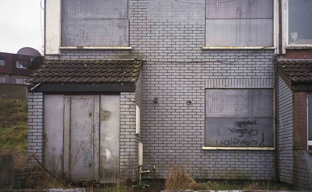 Currently in my work I am exploring Ireland’s housing crisis using photography and text-based work. As a young adult in Ireland emigration feels inevitable and through my work, I would like to explore Ireland’s derelict and vacant spaces as a result of the housing crisis. Within this work I can also reclaim lost parts of the Irish language. I currently use screen-printing for my text-based work, and I have been exploring bookmaking to explore this work further and archive my work. The socio-political landscapes I am documenting are local to me and predominantly working-class areas. I am specifically documenting the irony and classism of the use of steel to board up vacant council housing during a housing crisis. Using photography and installation I confront the viewer with these landscapes and derelict spaces they normally would not be faced with.