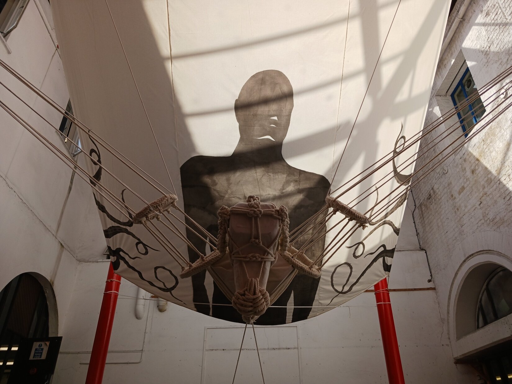 Freedom from the influence of others, freedom of expression, is worth the risk of chasing. In this work I have restructured different parts of a ship to represent the oppressive power structures we are subjugated to in contemporary society, aiming to create a source of counterpower. The installation consists of the sail, the figurehead and the gaze. The sail acts as a domineering force acting upon the suspended figurehead, restricting it yet relying on it for support. We as the audience are subject to this power dynamic as we are under the weight of these structures. "Look at What I've Done"is an installation which uses the architecture of the building along with heavy influences from 17th century pirate culture and queer culture of today, used to express a direct mocking and reimagining of these powers at play. In my work I aim to discuss what both power and freedom from it are, how something can be influenced or the chaos of which cannot be. A "pirate" is defined by the systems which are larger than them, but I would define them as a person seeking individuality, becoming something other than what they are expected to be. The norm is not there to be upheld and rules will inevitably be broken.