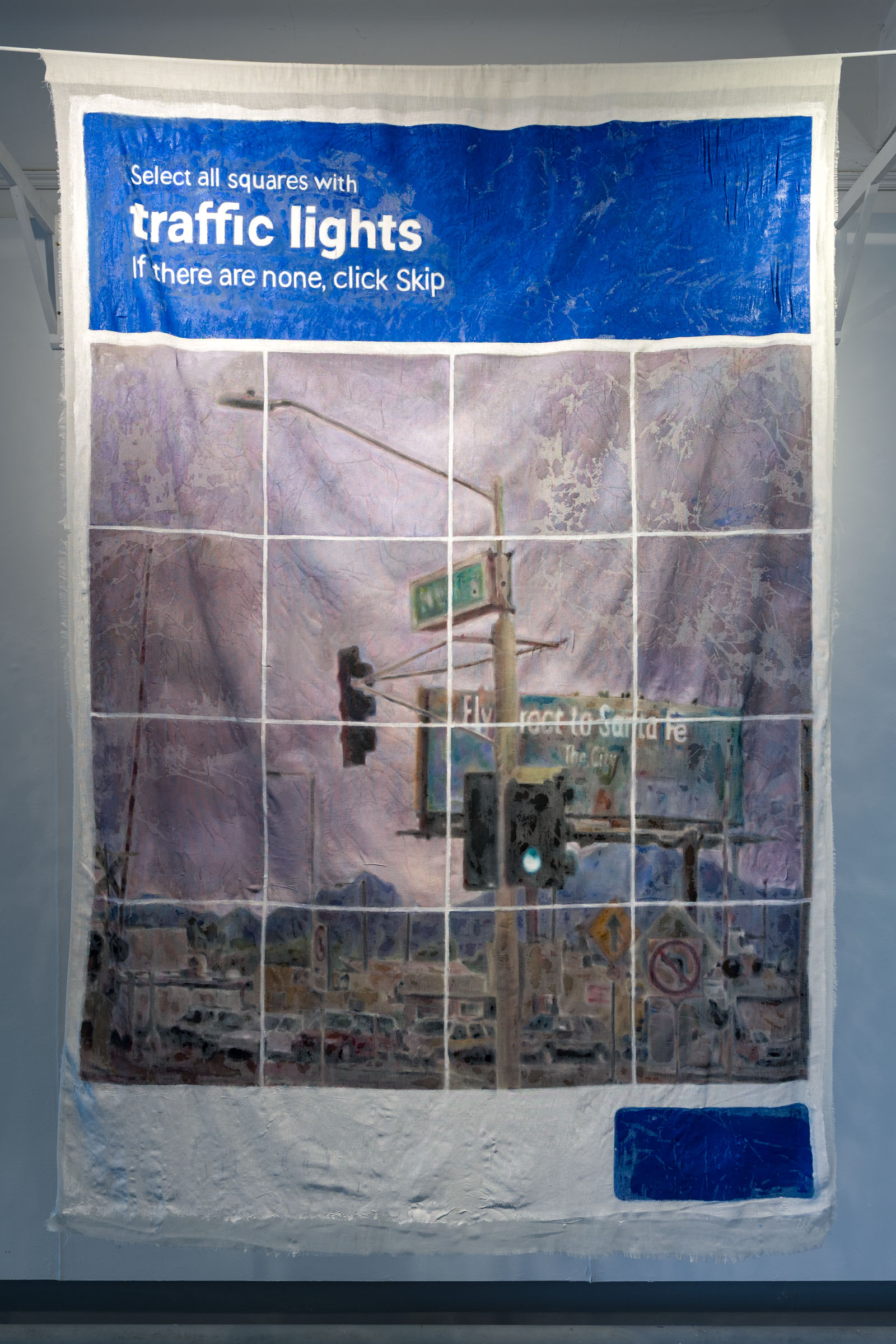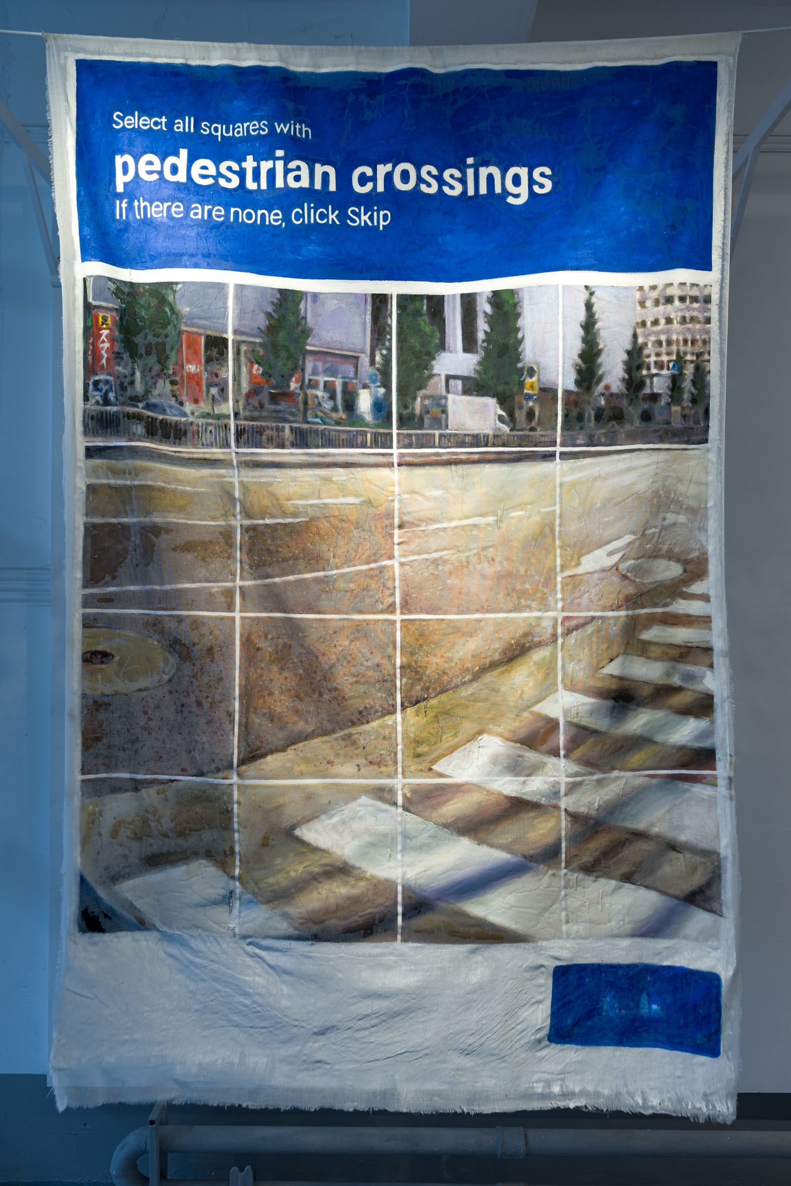 In my final year of university, I became increasingly interested in the use of paint to play with perception. "You Are Not A Robot", my most recent body of work, challenges our cyber-stained present by bringing into reality elements which are only found on the internet. CAPTCHA pop-ups are of particular interest due to their illicit collection of individuals’ data to turn a profit for technology companies. By bringing into reality elements which are only found on the internet, I encourage the viewer to slow down and critically consider these overlooked forms. I give these re-appropriated images a texture and physicality not found on screens using oil paint on unprimed cotton muslin. My work uses time as a partner, not an obstacle. Pop-ups, like the digital landscape at large, are fleeting, while oil paint insists on slow deliberation. Echoing the digital decay, link rot, and online moderation which erase information we often deem eternal, the oil paint will slowly degrade the fabric over time.