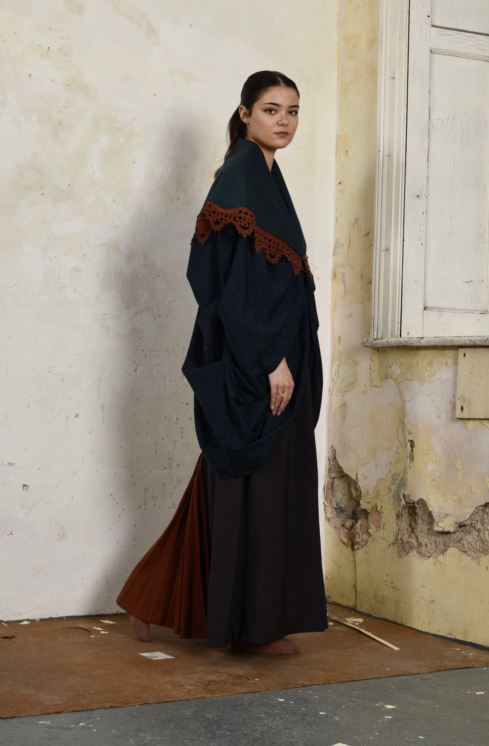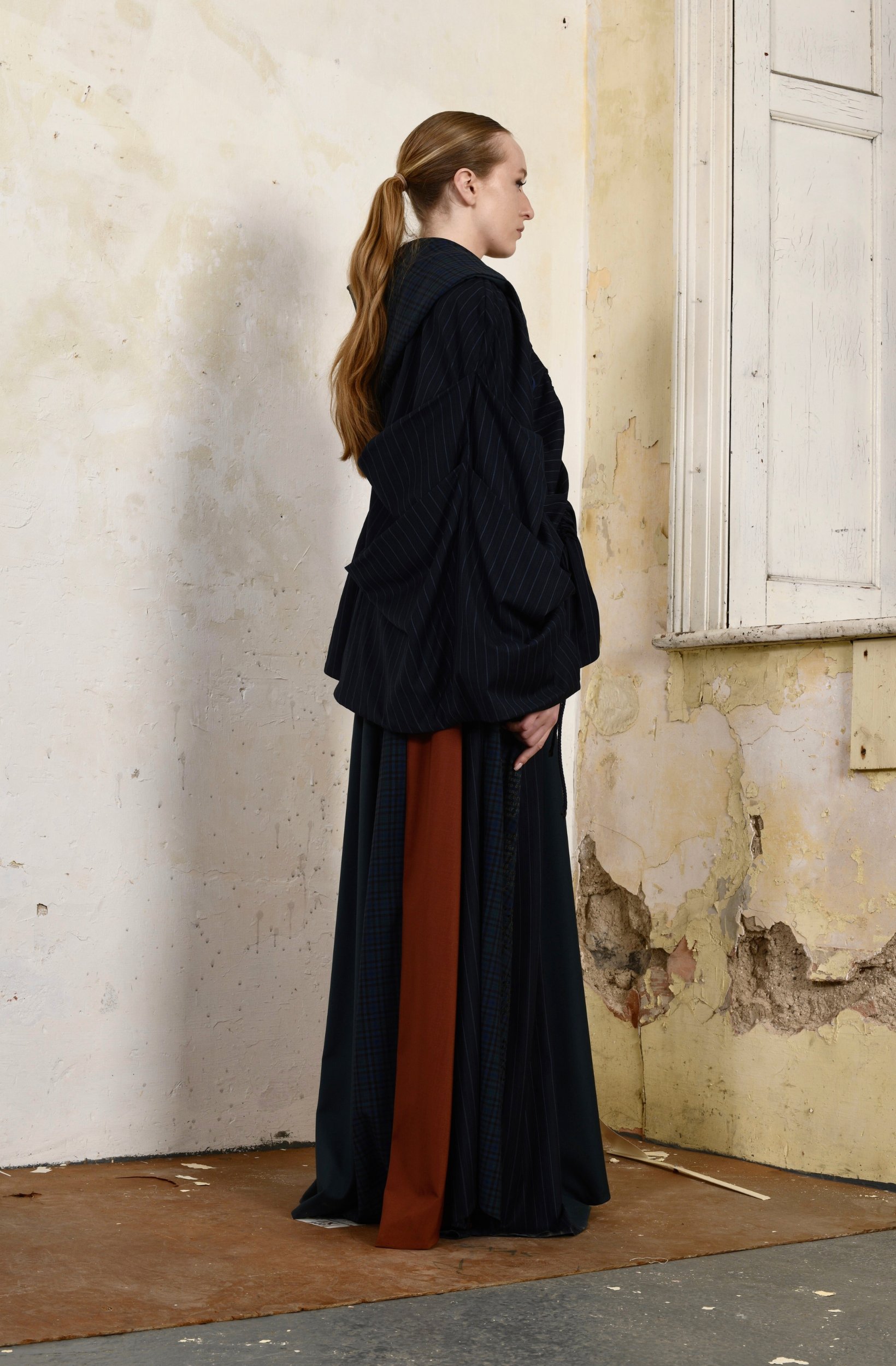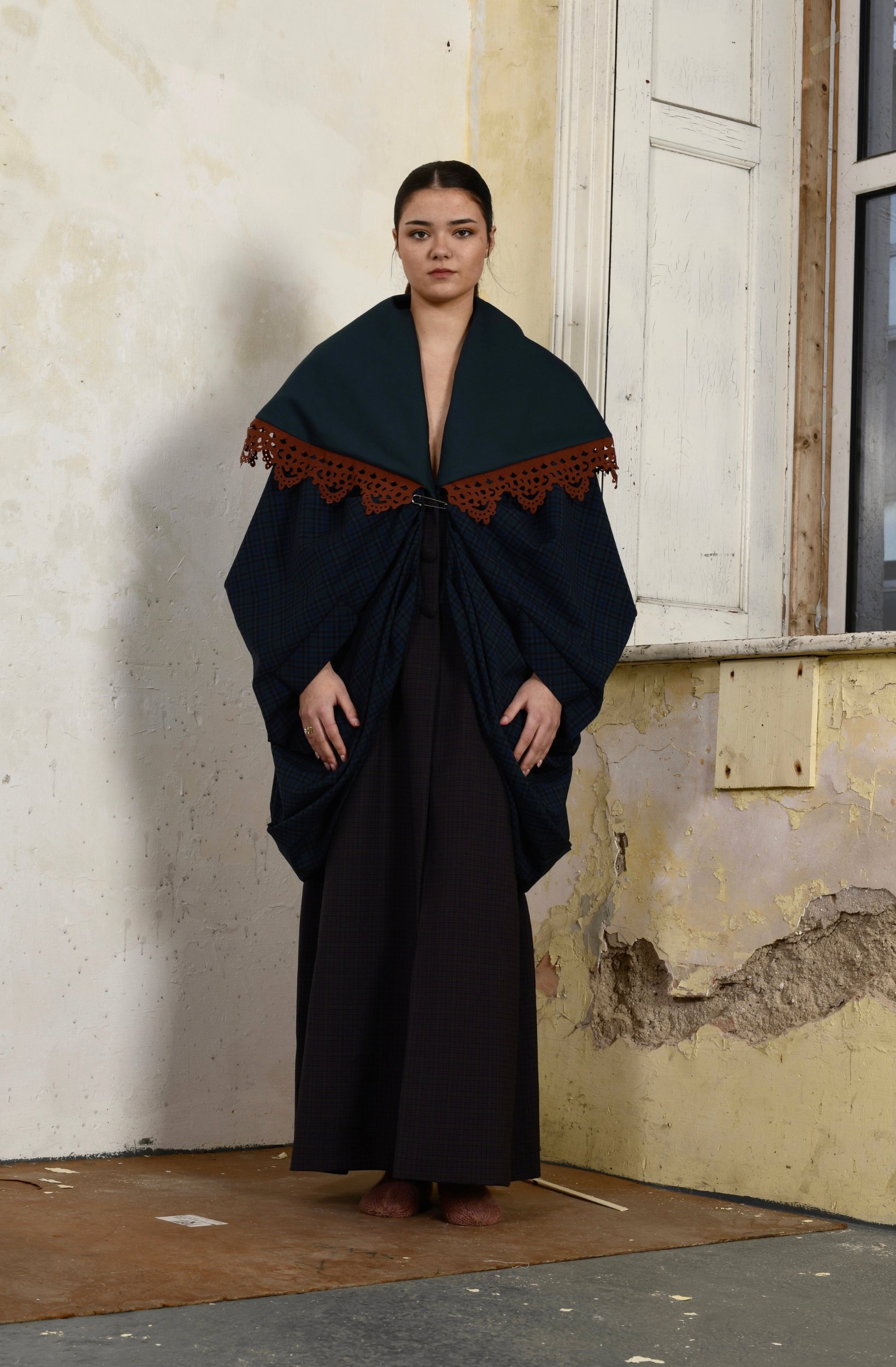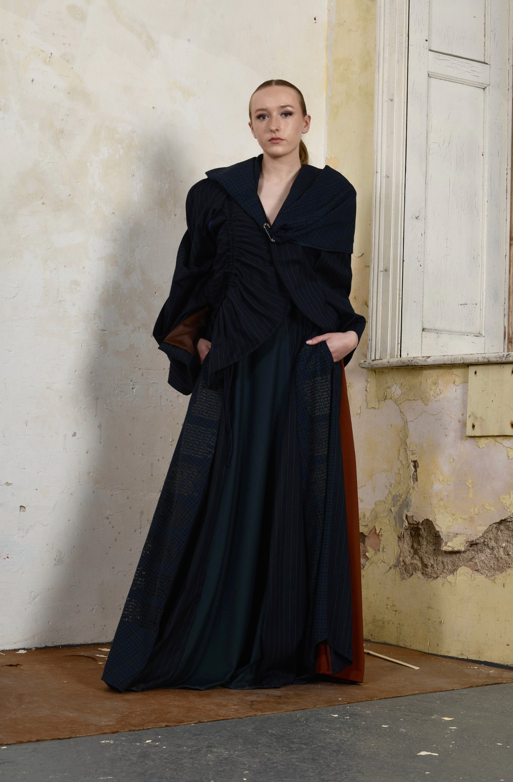 Growing up in Ireland with a keen love for fashion and art, but also a deep love of my home and heritage, has meant that Irish culture and history have always been an integral part of my creative identity and process. Much like the Irish traditions of storytelling, designing with narrative and emotional intent is something I strive for in my work. This shines through in my graduate collection ‘Taoidí Dóchais’ (Tides of Hope) which is rooted in the rich, longstanding history of Irish emigration to America. This narrative is one that resonates deeply with themes of identity, resilience and transformation, inspired by my desire to connect with my cultural heritage and its emotional weight. In doing so, I could explore how displacement and adaptation shape both personal and collective identities. My objective was to create a collection that both evokes and commemorates the emotional turmoil and complex identity of the Irish immigrant experience. This collection translates the physically and emotionally challenging journey of emigration through silhouette, structure, fabric manipulation, and movement. I was drawn to contrasting forms to reflect the duality of identity experienced by immigrants and the tension between old and new, belonging and alienation. The silhouettes are both fluid and chaotic, structured yet fragmented and are manipulated to express the fragility, tension, and complexity of this experience. I chose to work with wool-blend suiting in this collection not only for its relevance in Irish heritage but its versatility in both tailoring and drapery. These materials allowed me to create garments that move between fluidity and structure, echoing the interchange of control and vulnerability. Central to my process was the use of laser cutting and engraving, both techniques enabled me to embed visual storytelling directly onto the fabric. I combined contemporary laser-cut lace and inscribed text, with contrasting drapery and tailoring, further expressing the emotional duality of the immigrant, whilst intertwining tradition with modern technology. Ultimately, this collection is a personal reflection of my Irish heritage, one which resonates deeply through my familial connections to New York and America. But most importantly It is a homage to the resilience, complexity, and enduring spirit of those who undertook this turbulent journey to America, which I have expressed through silhouettes, movement, and materiality. In all, it is a broader recognition of both the hardships and beauty that defined the Irish immigrant experience.