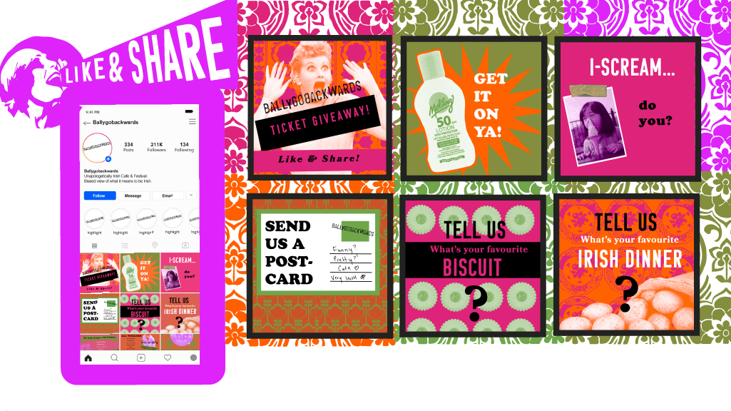 The brand uses humour and nostalgia to communicate its theme. The design combines Irish – Kitsch with punk and contemporary design. Just like some questionable retro fabrics and patterns, the Ballygobackwards brand is flamboyant, playful and ‘unapologetic’. Through the whole process, I feel the brand has managed to communicate what I set out for it to do. It’s bold and funny without being offensive or insincere. It’s reminiscent of the old but has a contemporary and fresh design.