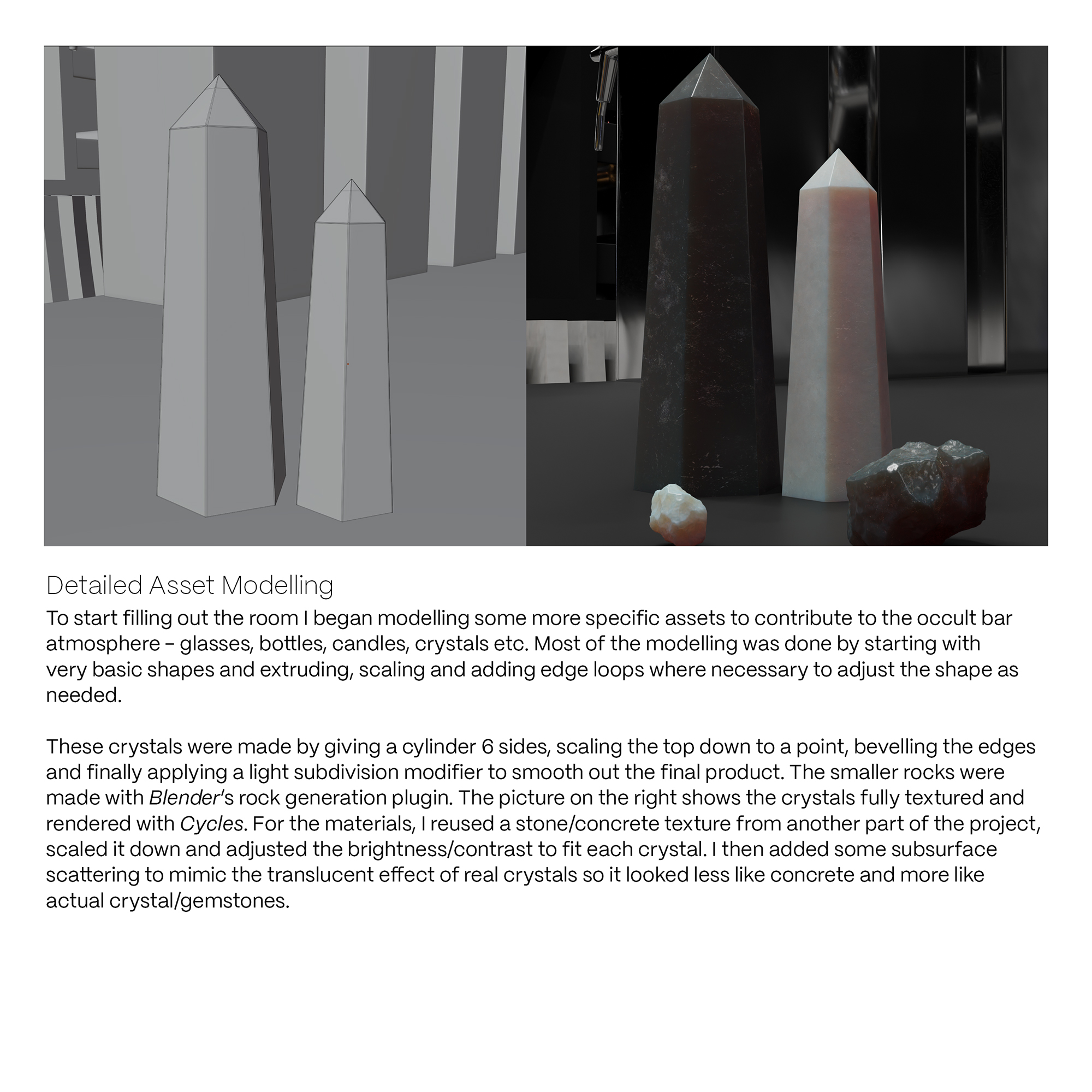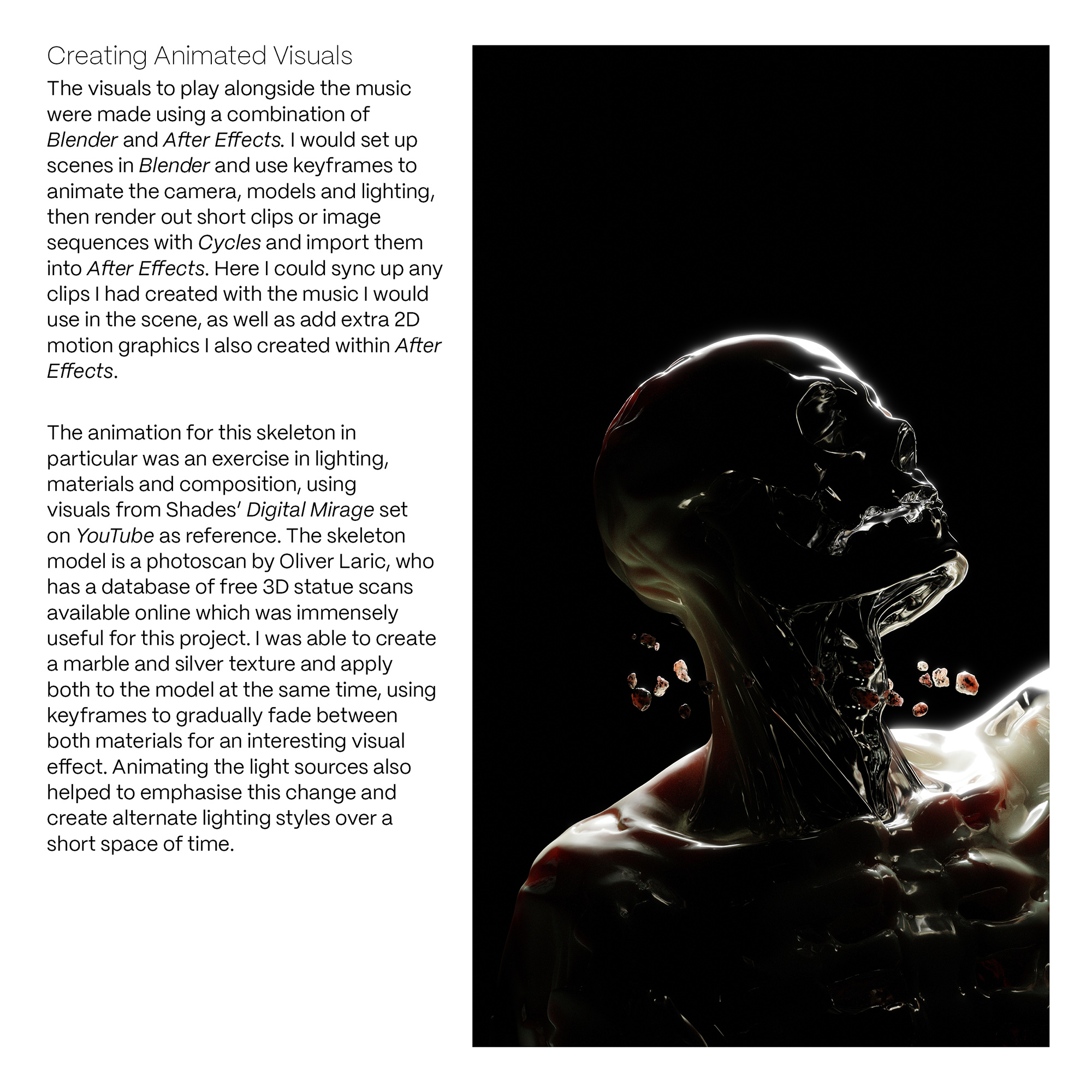 The 3D modelling was all done in Blender, where I also rendered any still shots of the scene. I created textures/materials for these models in Substance Designer and Painter, then transferred the whole scene into Unreal Engine 5 where it could be explored in real time, like a level in a video game. Lastly, I added looping music and animated visuals I had created in Blender and After Effects to complete the nightclub feel.