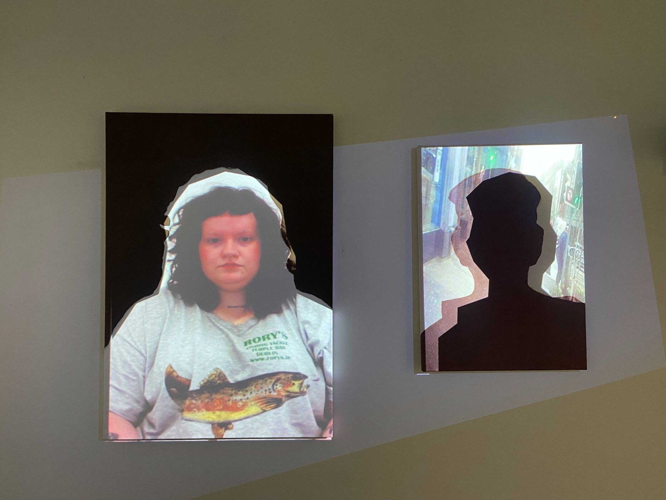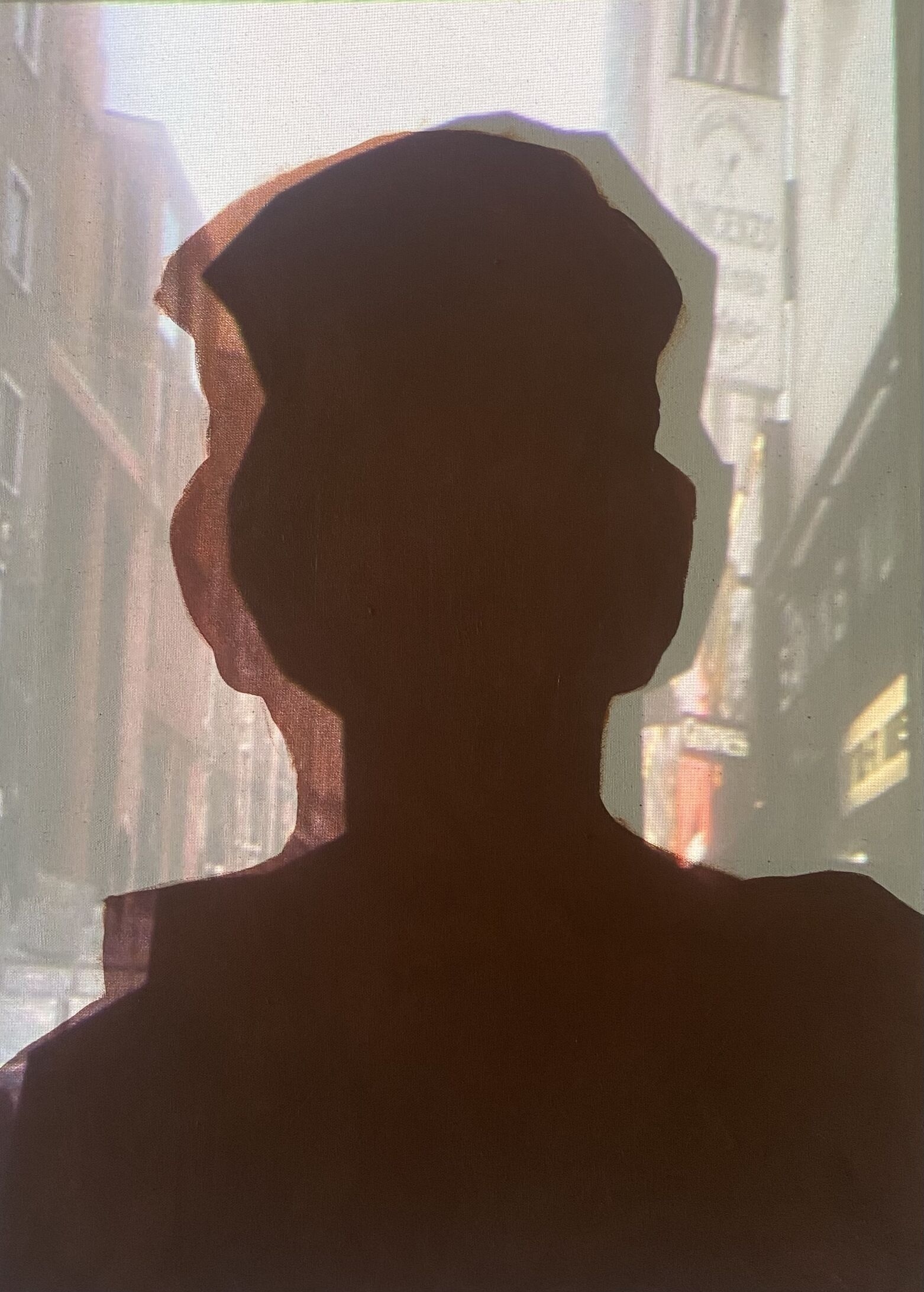 My work explores the politics of surveillance, using video, projection, and painting to examine how people are watched, recorded, and made visible by technology. My practice centers on identity and self-representation. I question how surveillance impacts both public and private life. I film Limerick City with a hidden camera, recording everyday moments. My role shifts between observer and participant, blurring the line between the person watching and the one being watched. Paintings of silhouetted figures layer into this work. These silhouettes are based on footage I take of myself and others. The figures are stripped of detail, becoming outlines or shadows. Placed alongside video footage are paintings of silhouettes, the tension between stillness and movement adds another layer to the work, reinforcing the unease of being looked at without consent or context. Through large-scale projection, I transform the footage I collect with my paintings into immersive installations. The physical scale pulls the viewer into the space, making them aware of their presence and role in the act of looking.