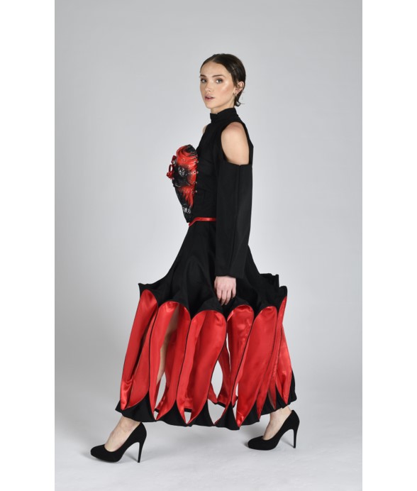 ‘Grianstad’Throughout this collection I explored the Irish Celtic pagan festivals and the historic ritual sites where stories of ‘The Otherworld’ come from. I blended themes of ancestry, ritual, and culture with the work of Irish sculptor Joseph Walsh whose contemporary pieces are streamlined and largescale. Comparing and integrating these sculptures to the Megalithic stonework art, such as stone circles and dolmens, establish monumental, structured shapes. The garments created within my collection are fitted with sculptural silhouettes. I have adorned these pieces with textural designs such as a built-up sculpture inspired by a ram’s skull, or line drawings which were reactionary to Drombeg Stone Circle in Glandore, Co. Cork which then were digitised, and 3D printed.‘The Otherworld’ in Irish folklore is where deities and fairies (An t-Aos Sí) dwell, making it is a key component within Irish Mythology. It is said that the colour red represents An t-Aos Sí in these folktales and that is why red is one of the two main colours I used in this collection. Taking inspiration from these ancient rituals and ritual sites has led me to create a collection which is a personal interpretation of my own contemporary Celticism.