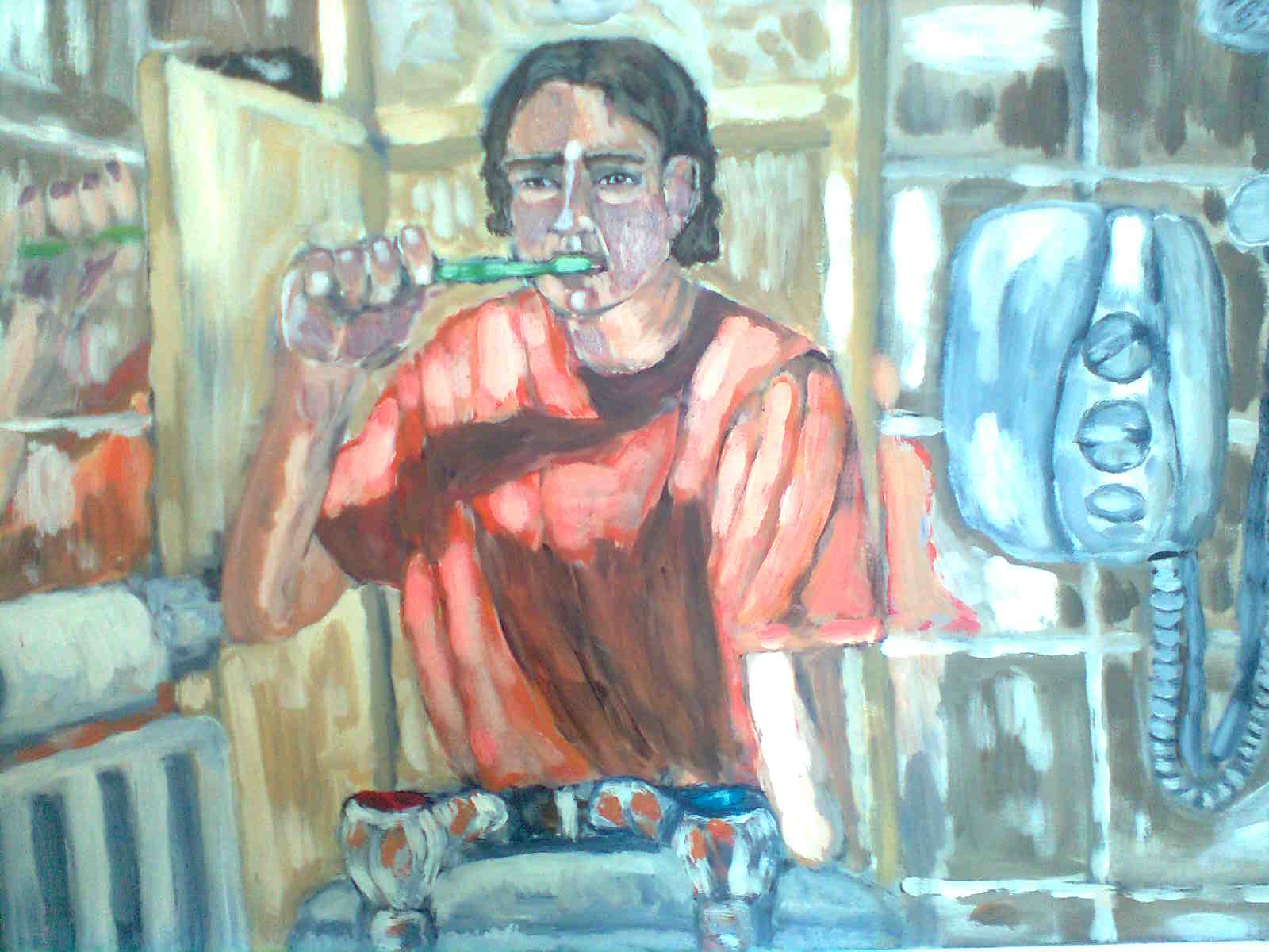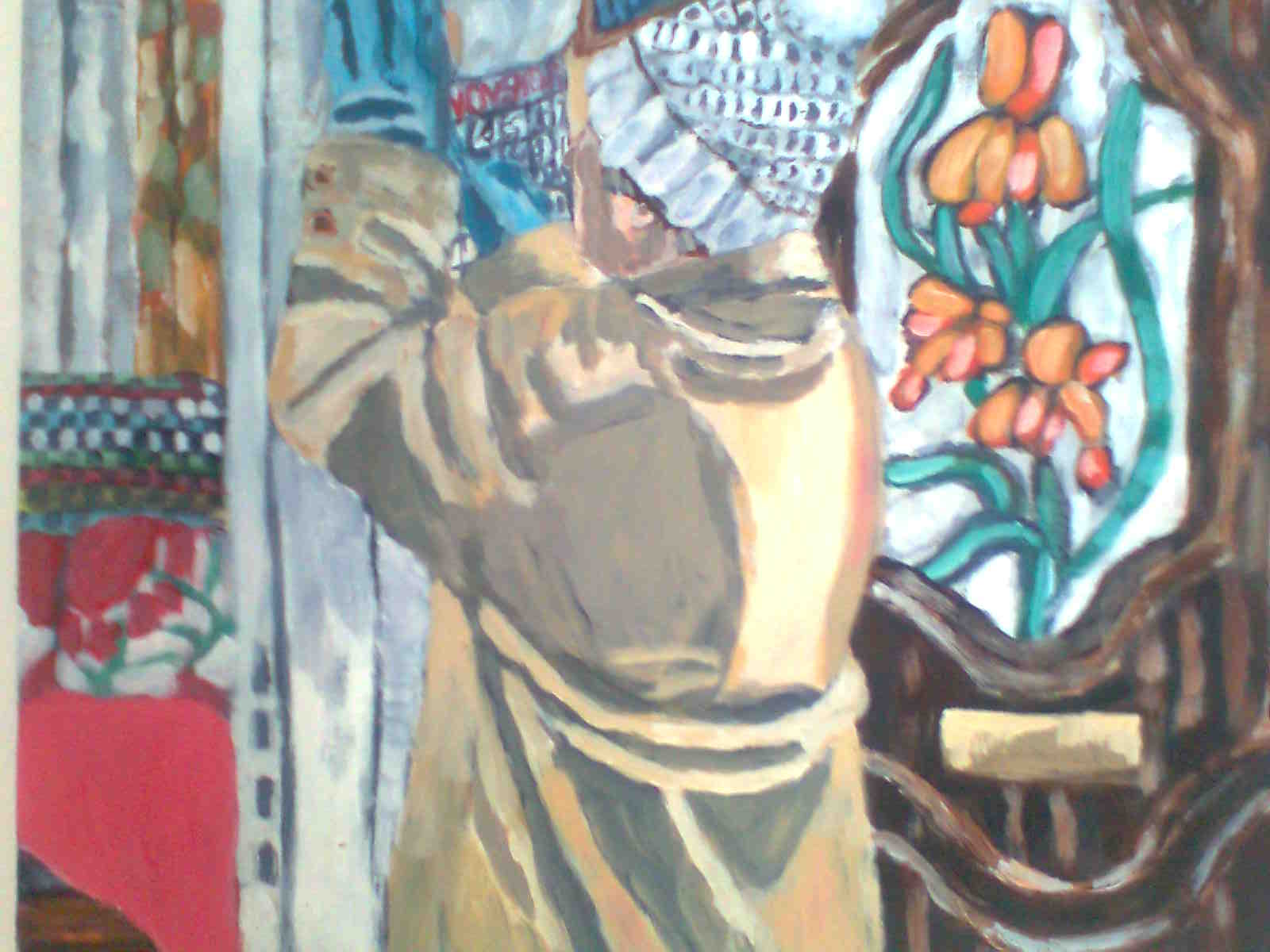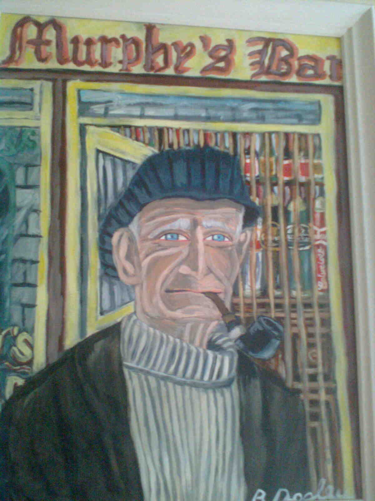 I like to work in acrylics, painting mainly from photographs that I take using my camera phone. The main subjects that I use in most of my paintings are my own parents, along with myself and my dog. I also like to paint from photographs of different people that I see around different parts of Galway City.