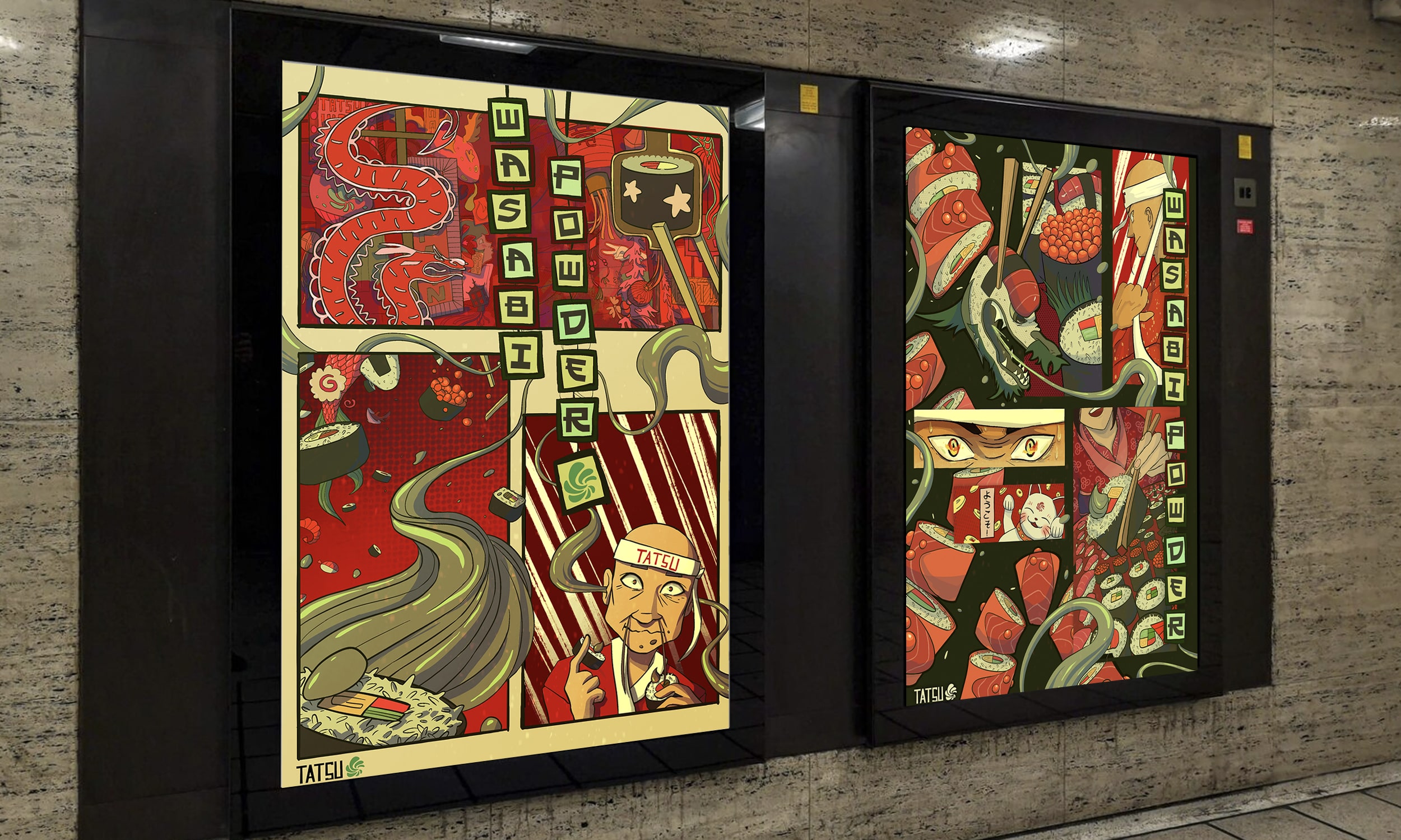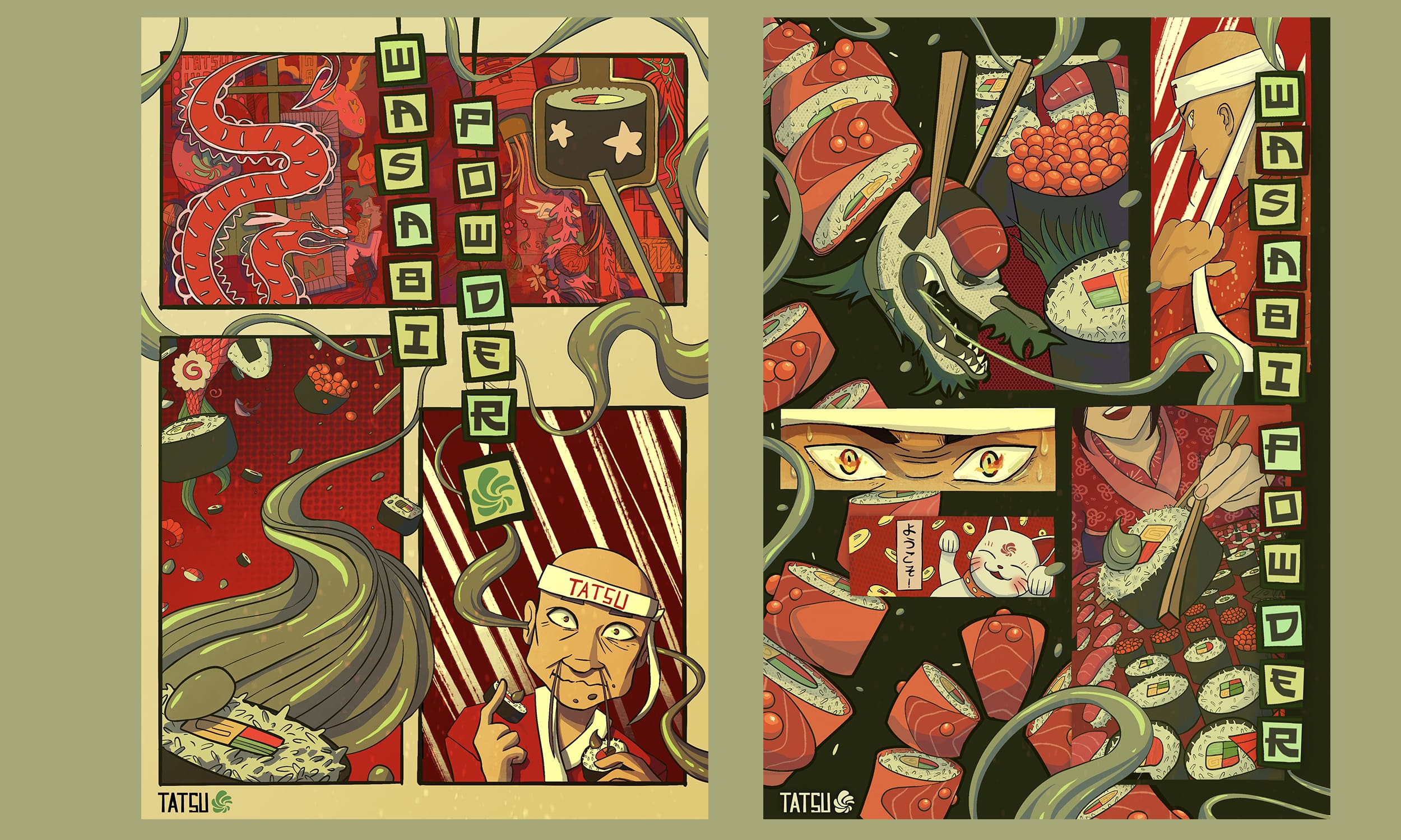 The aim of the project is to create a new brand, packaging design and campaign for wasabi powder, behind the brand ‘TATSU’ with a slightly higher price budget of €14. My childhood love for reading manga and watching cartoons has been a major source of inspiration for me. My passion for drawing and consuming media from Asia has shaped my creativity, allowing me to produce more imaginative and energetic work. I hope to bring more of this vibrant influence into the industry.The target audience are tourists or people with a general interest in Japanese culture. Primary audience would be in the airport but this product could potentially be located in supermarkets or tourist gift shops. The primary audience are tourists leaving Japan or general enthusiasts of Japanese culture. Tourists leaving have just explored a new country and are eager to carry a part of their adventure back home. Seeking a last-minute souvenir or gift at the airport, they find ‘TATSU Wasabi Powder.’ It allows them to share the unique flavours and experiences from Japan with others. Individuals passionate about Japanese culture, particularly anime, manga, and related art forms, will find the wasabi powder packaging, inspired by ancient Japanese watercolours, appealing. Posters with manga-inspired designs enhance the product's appeal, bridging their love for anime and traditional Japanese art. This brand offers a unique experience as both a culinary delight and a cultural artefact. ‘TATSU’ means ‘dragon’ in Japanese and represents our brand of wasabi powder. The name symbolises power, energy, and a bold flavour experience that our wasabi brings to your dishes. The dragon is drawn after the wasabi root, decorated with the axillary buds on the root. The logo, inspired by traditional Japanese stamps, uses the blocky 'Hashi' font to maintain an authentic feel. For posters, the playful 'Okami' font provides a dynamic and engaging style, enhancing Tatsu's spirited nature. The two posters are illustrated in manga-like panels. There are motifs or full dragons incorporated in both posters to refer to the name ‘Tatsu’. Additionally, a string of wasabi runs through the borders of the posters, symbolising the continuous and flavorful connection Tatsu has with its roots and cultural heritage. This design bridges the gap between traditional art and modern anime influences, creating a unique and captivating visual experience. Tatsu marries Japanese cultural heritage with contemporary design, delivering a flavorful and visually captivating experience.