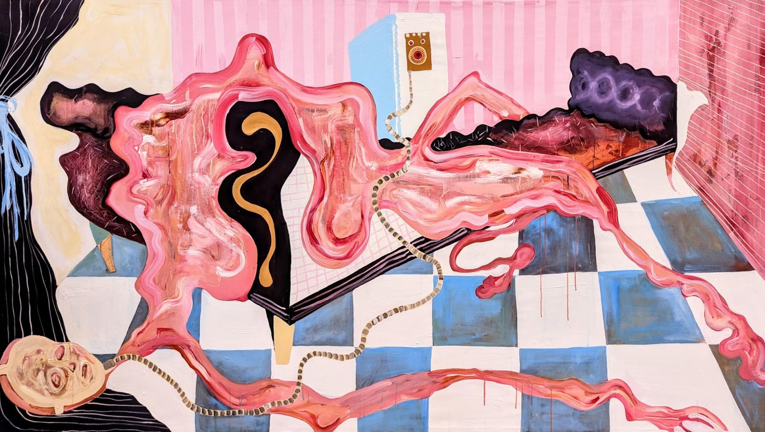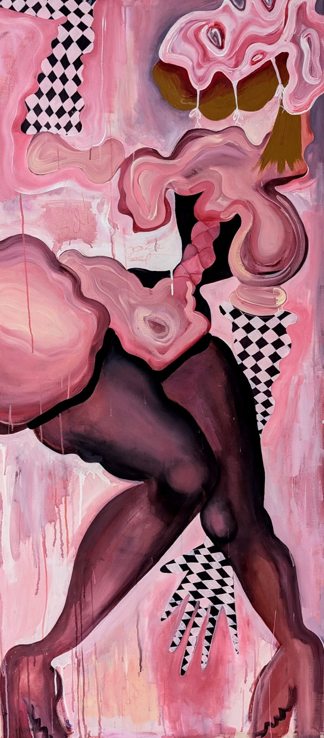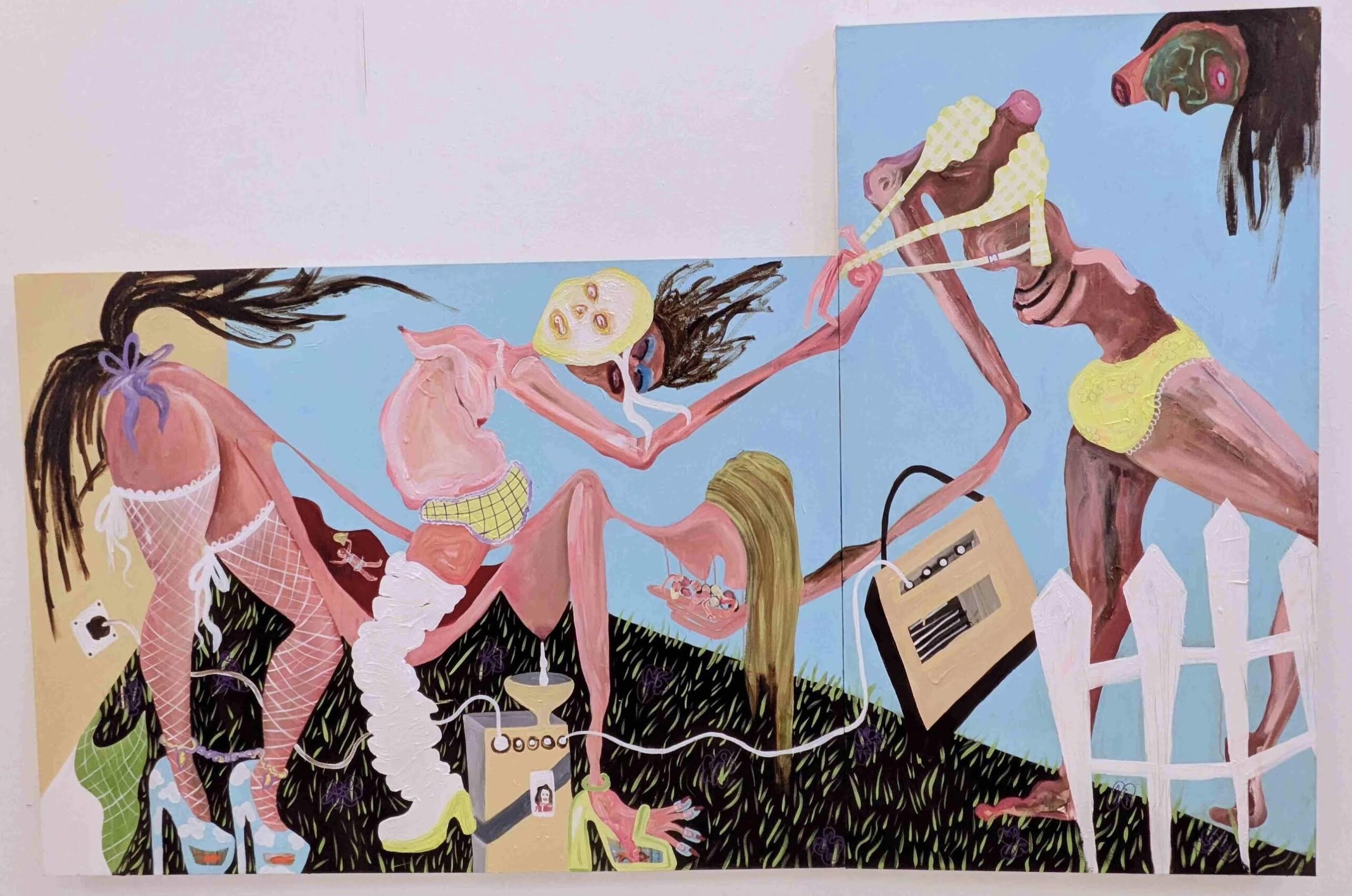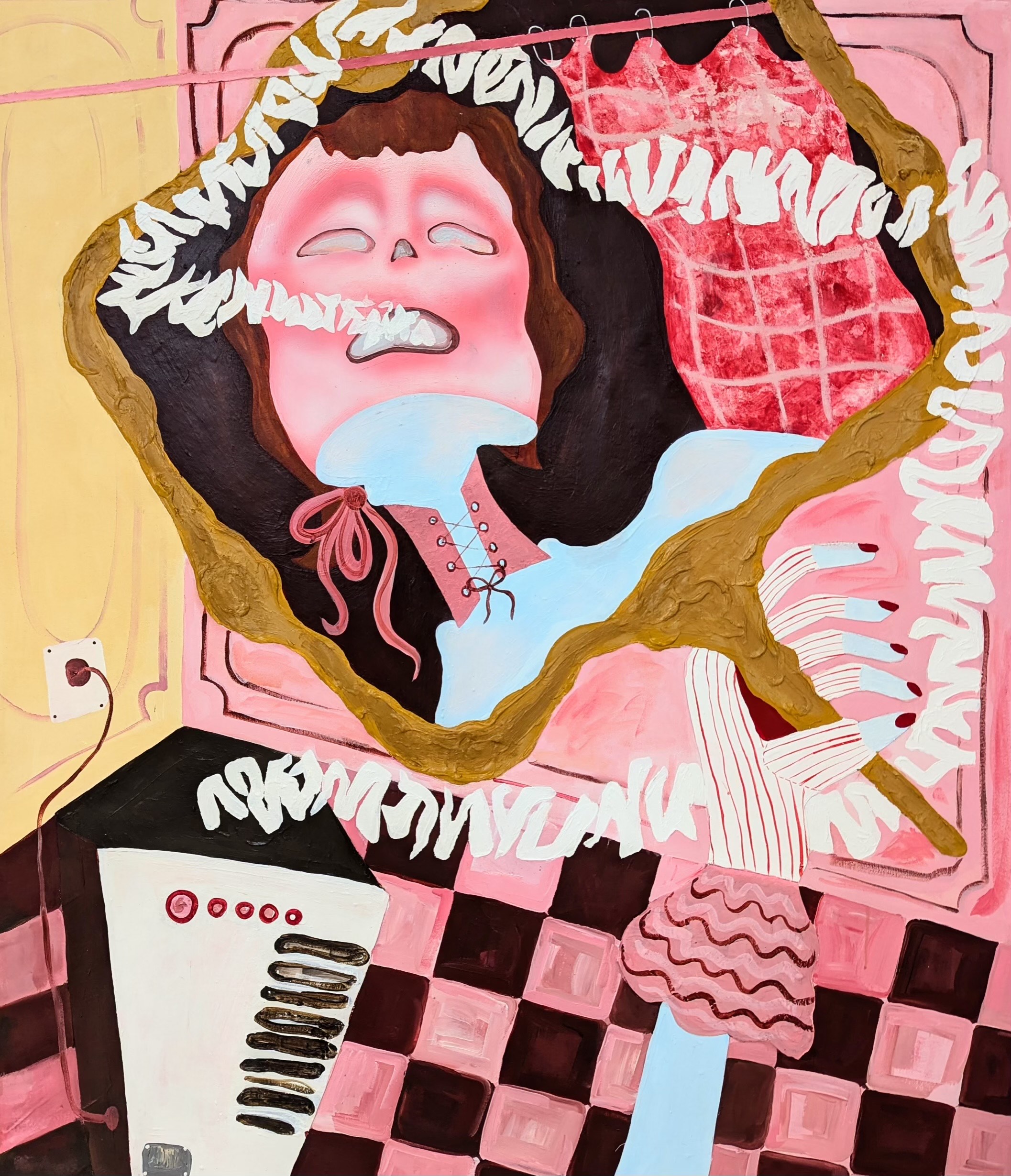 My work is both a celebration of femininity and an act of defiance against patriarchal constraints. Drawing from grotesque theory and the monstrous feminine, I use exaggerated, amorphous female forms to challenge and subvert beauty standards, and reclaim the body as a site of power and transformation. Influenced by the occult, cinema, sci-fi, campy vintage horror aesthetics, and strange beauty contraptions from both past and present - I construct eerie, timeless, suspended realities that expose and subvert oppressive ideals. The theatrical aspect of my work aims to satirise notions of performative femininity, and the absurdity of beauty as ritual, transforming symbols of objectification into rebellion. Through macabre humour, monstrous forms, and fragmentation, I create space for the unruly and untamed body and spirit. The alchemy of paint itself becomes a messy protest, creating leaking, sutured forms that resist containment and reflect multiplicity of identity. In this chaotic interplay I create bodies that emerge not as passive objects of beauty, but as autonomous and ever-transforming forces of resistance.