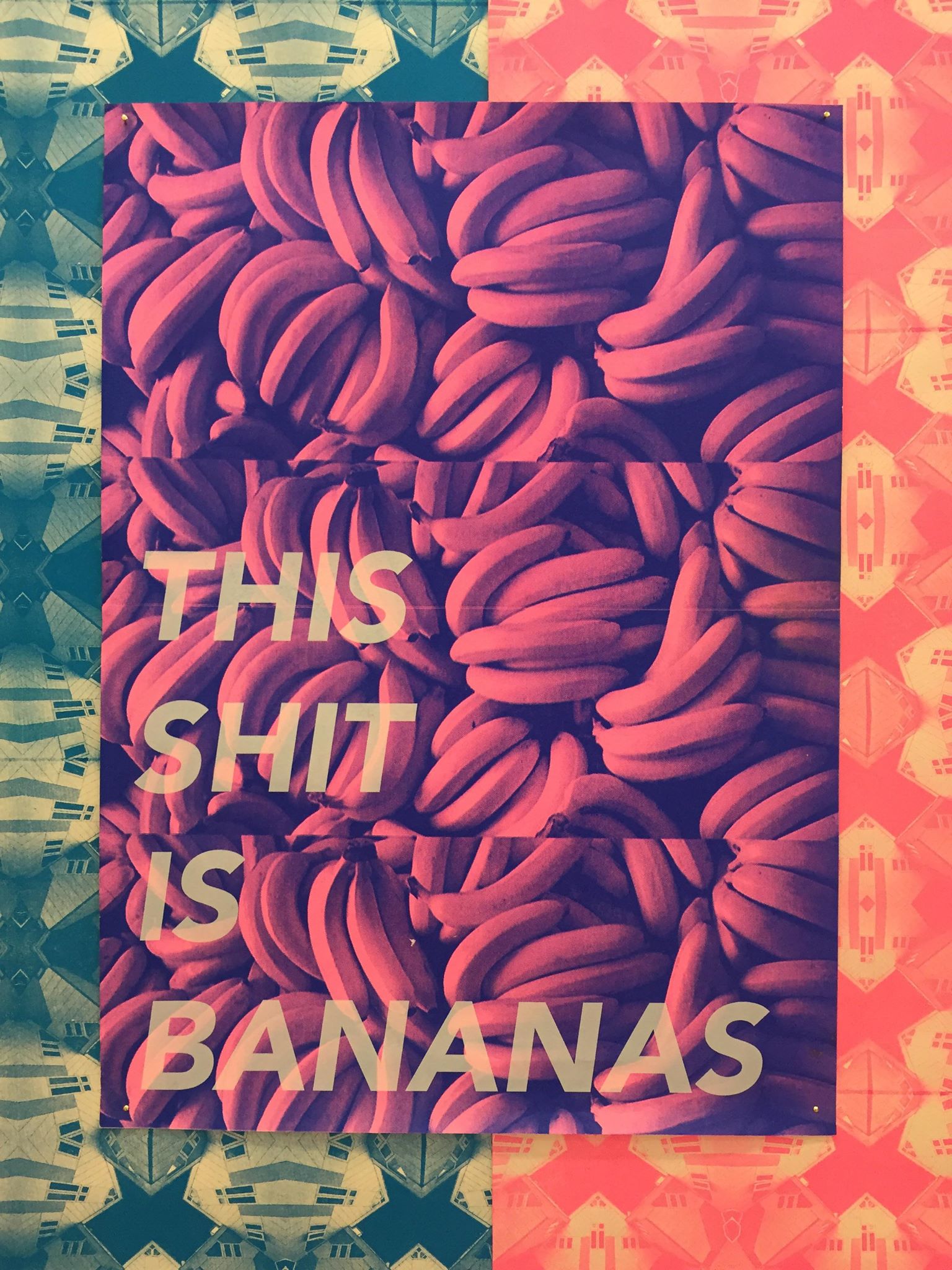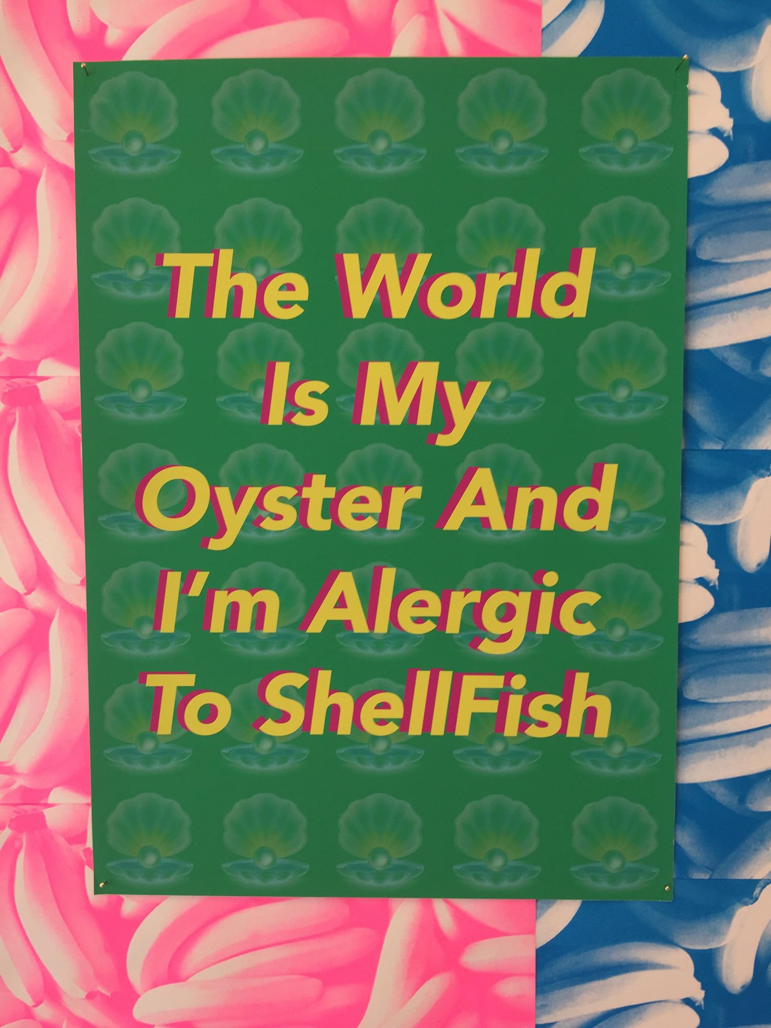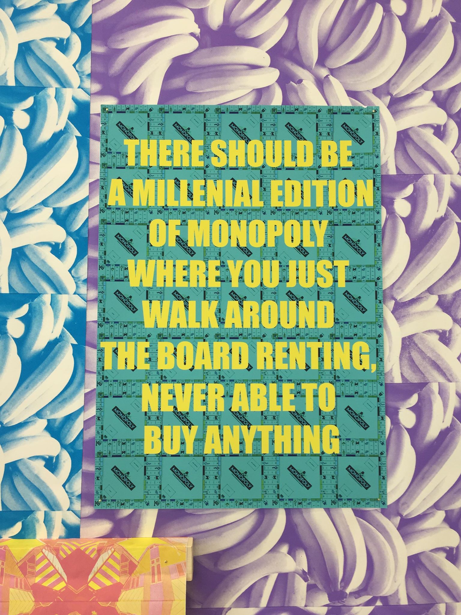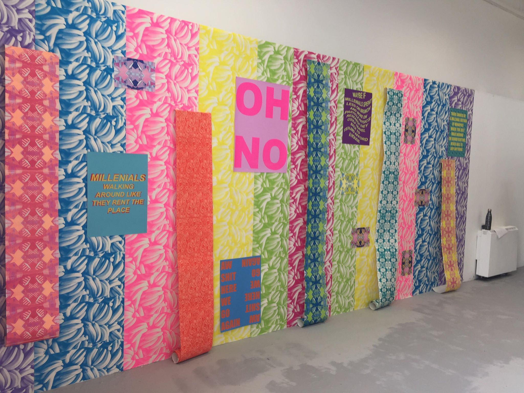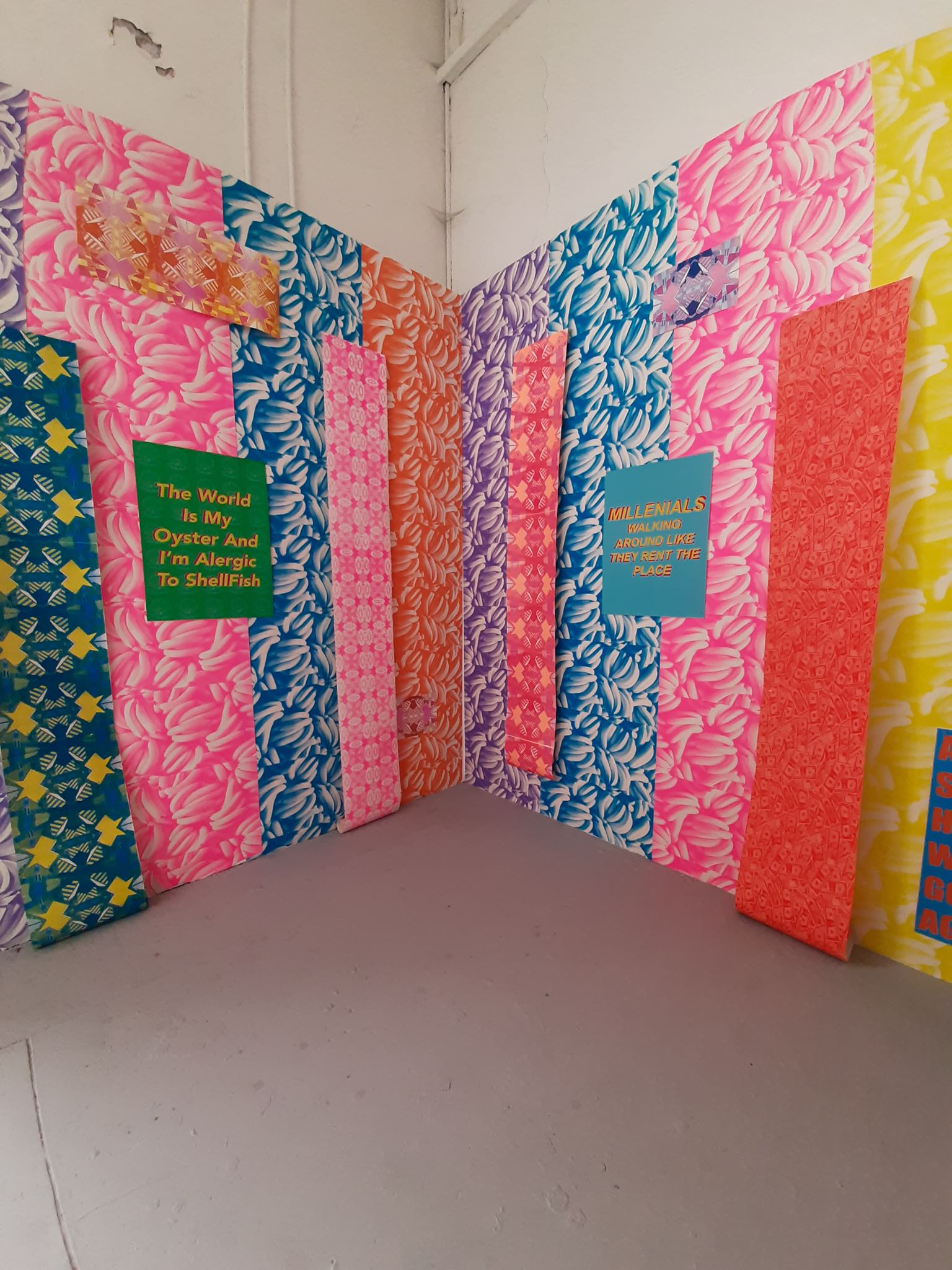 The work is a response to the millennial absurdist humour in regards to todays social issues. The use of repetitive patterns and ironic humour creates relevant content which is relatable to viewers. The work aims to engulf the viewer in an erratic visual energy whilst quite obviously making one aware of consumerism, power, economics and other social issues.
