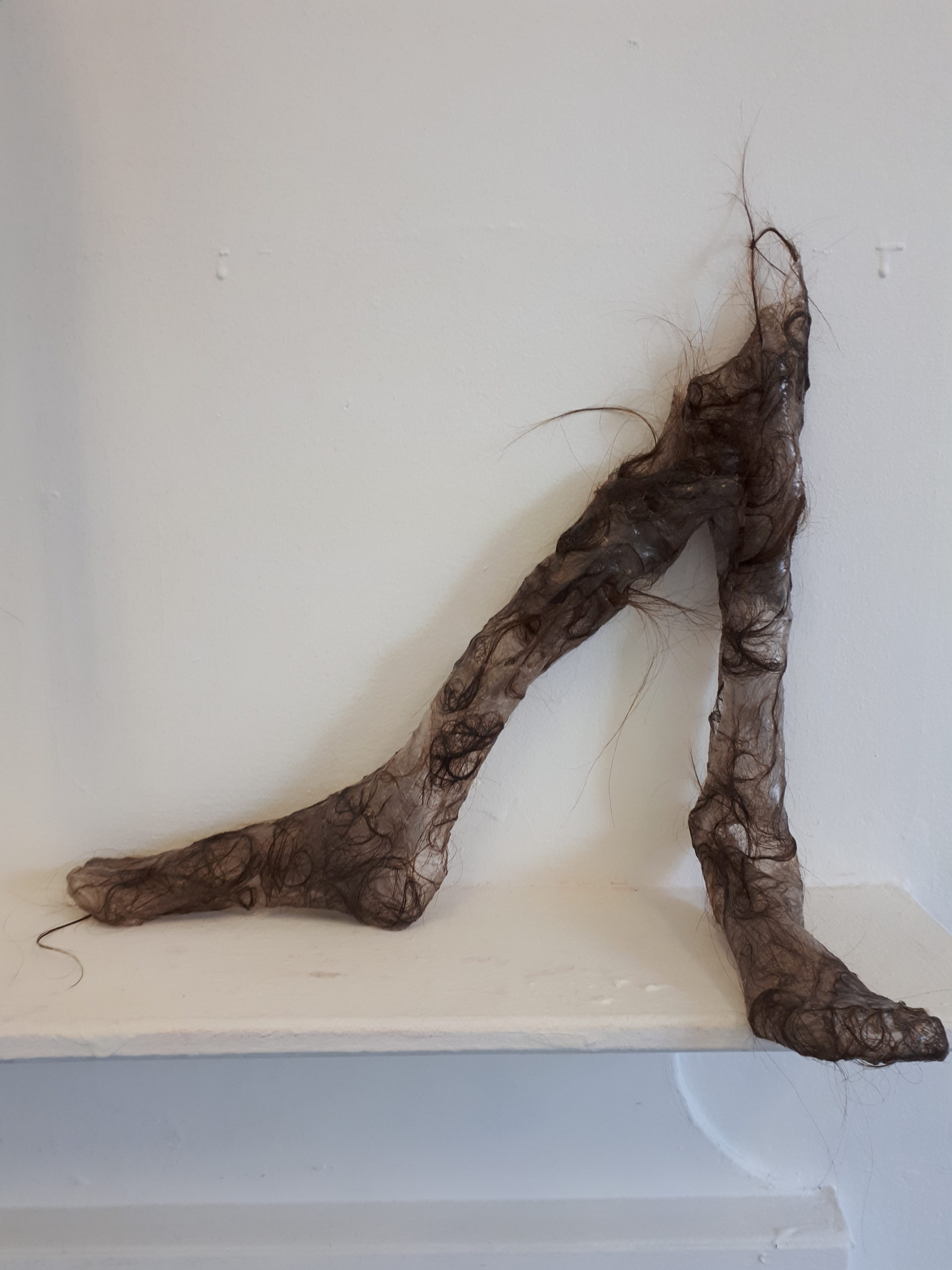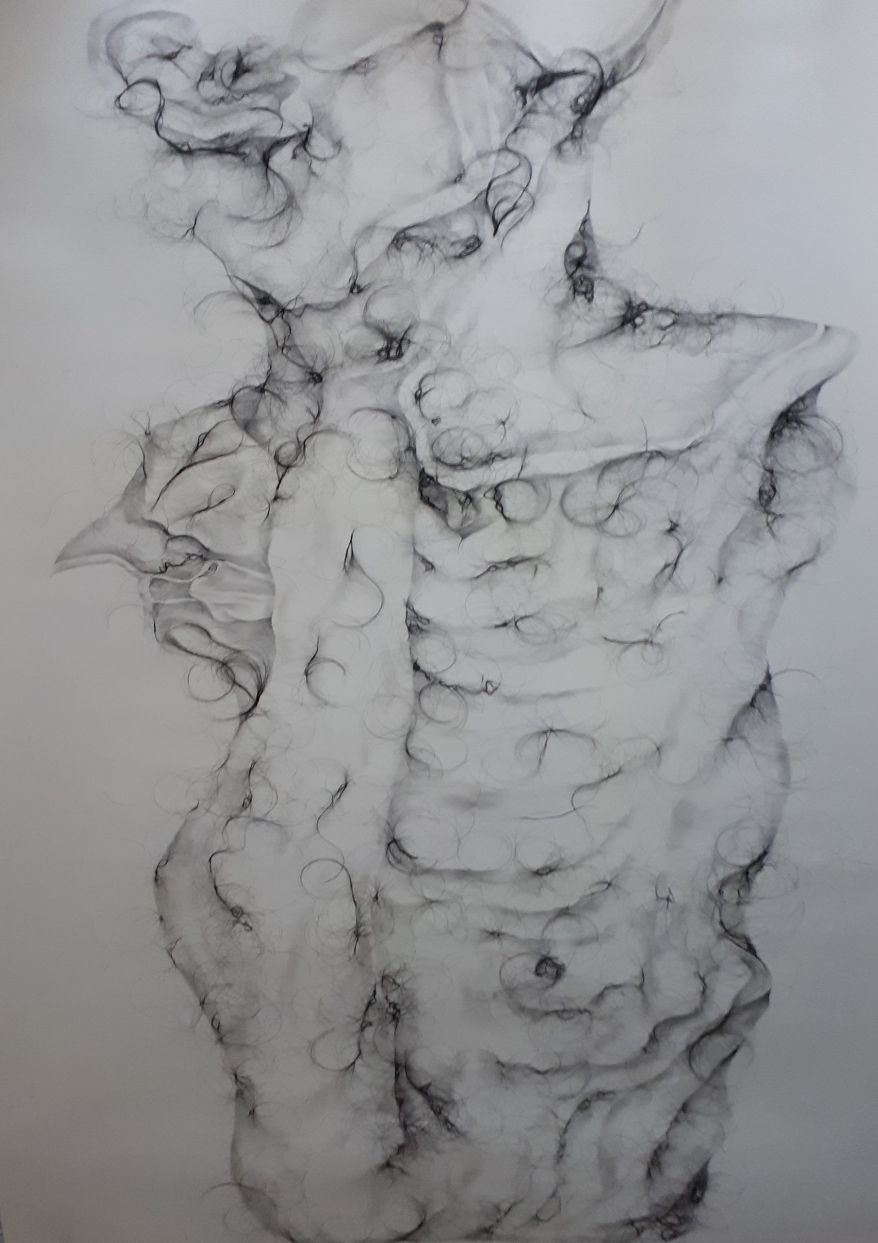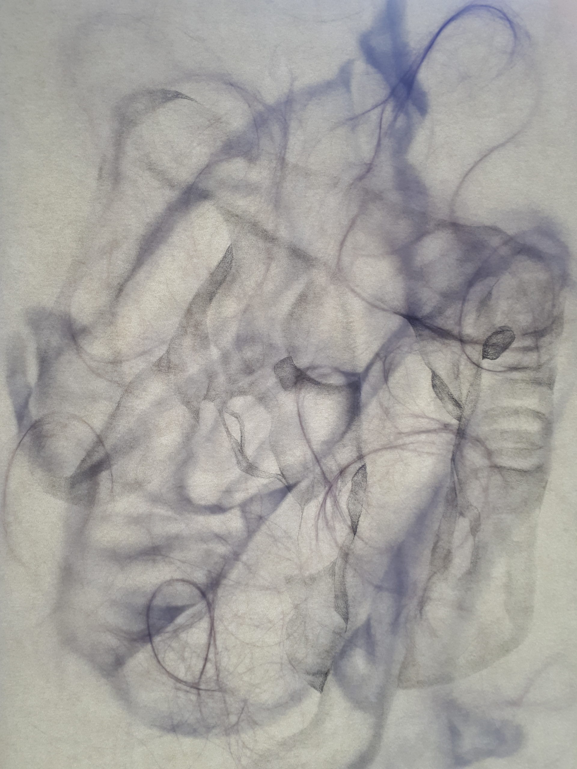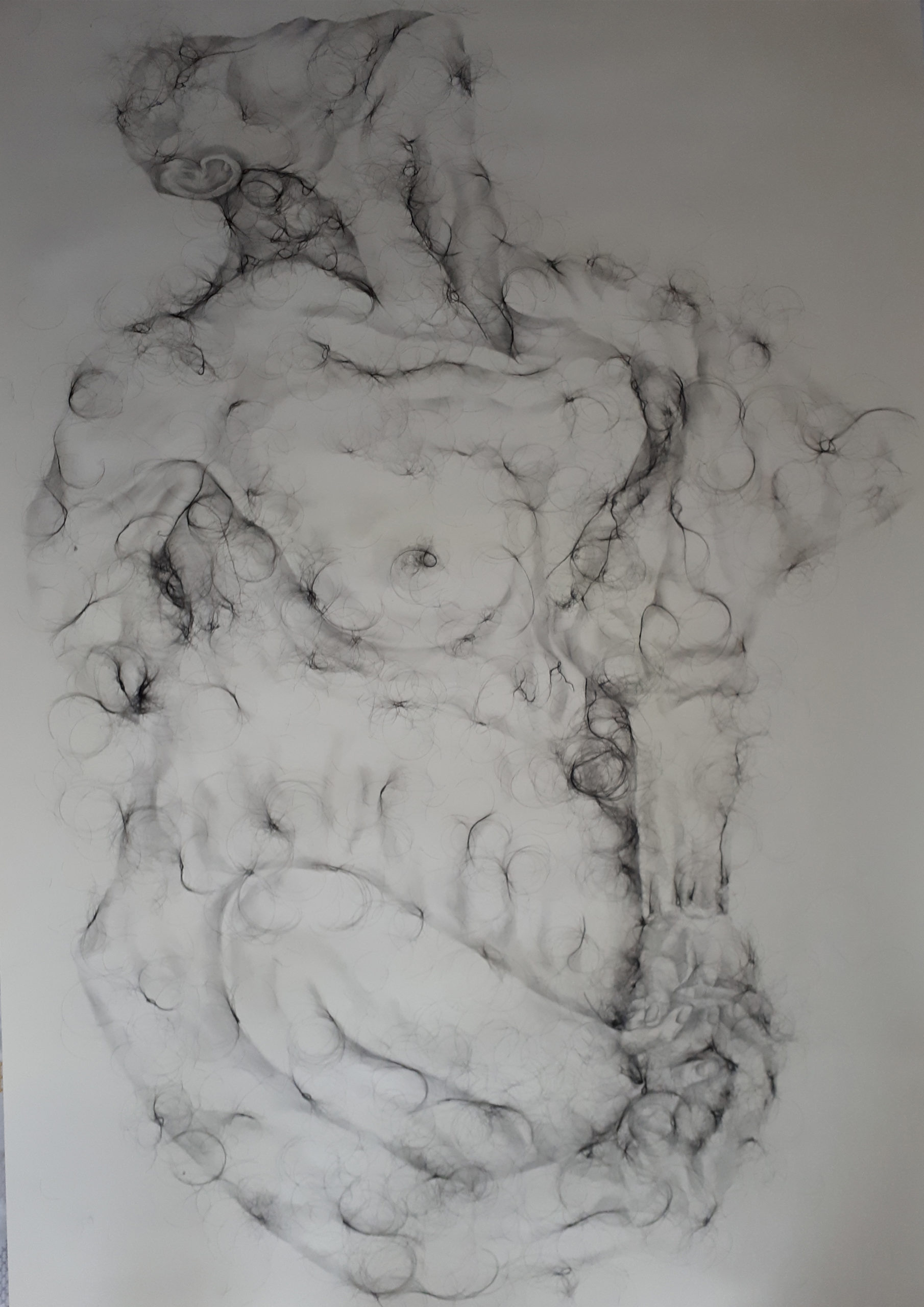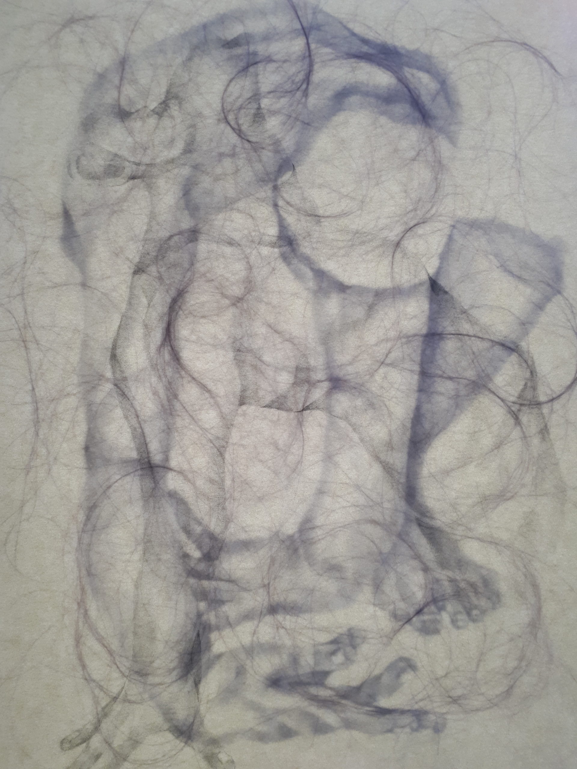 Depicting occurrences of when one is physically present compared to its absence and what happens when traces of identity are visible, removed, fragmented, or left behind is key to my art practice. Incorporating anonymous and gestural anti-portraits along with distortions of what we consider the norm human anatomical structure. Materials include graphite pencil, vellum, human hair, and gel.