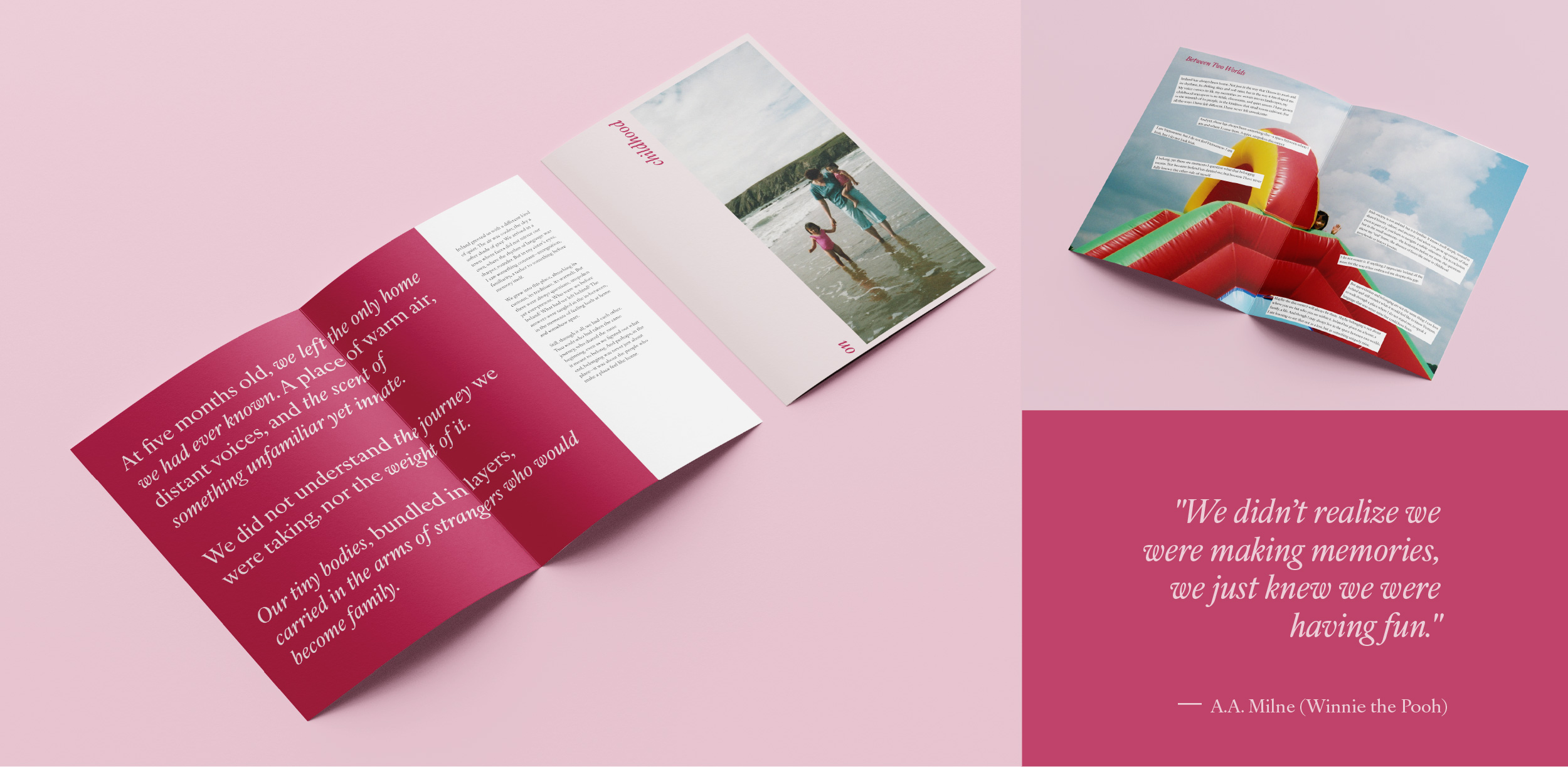 As a designer, I believe in the power of storytelling and emotional connection. Focusing on thoughtful, detail-oriented work, I strive to create design that feels personal and meaningful—crafting experiences that resonate deeply with audiences. 'The Story of Us' is a series of personal reflections on identity, family, and childhood, framed through the lens of adoption and the bond I share with my sister. It explores what it means to belong—to a family, to a place, and to oneself. Moving between quiet, everyday moments and deeper questions of difference and identity, the project speaks to the complexities that often go unspoken. It’s about growing up, finding home not just in others but within oneself, and the unseen threads that bind our lives together. Created as my final year project, this collection both explores and celebrates sisterhood and the many ways adoption has shaped us. Through carefully considered typography and photography, I documented our shared history, reflecting on where we’ve come from and where we might go next.