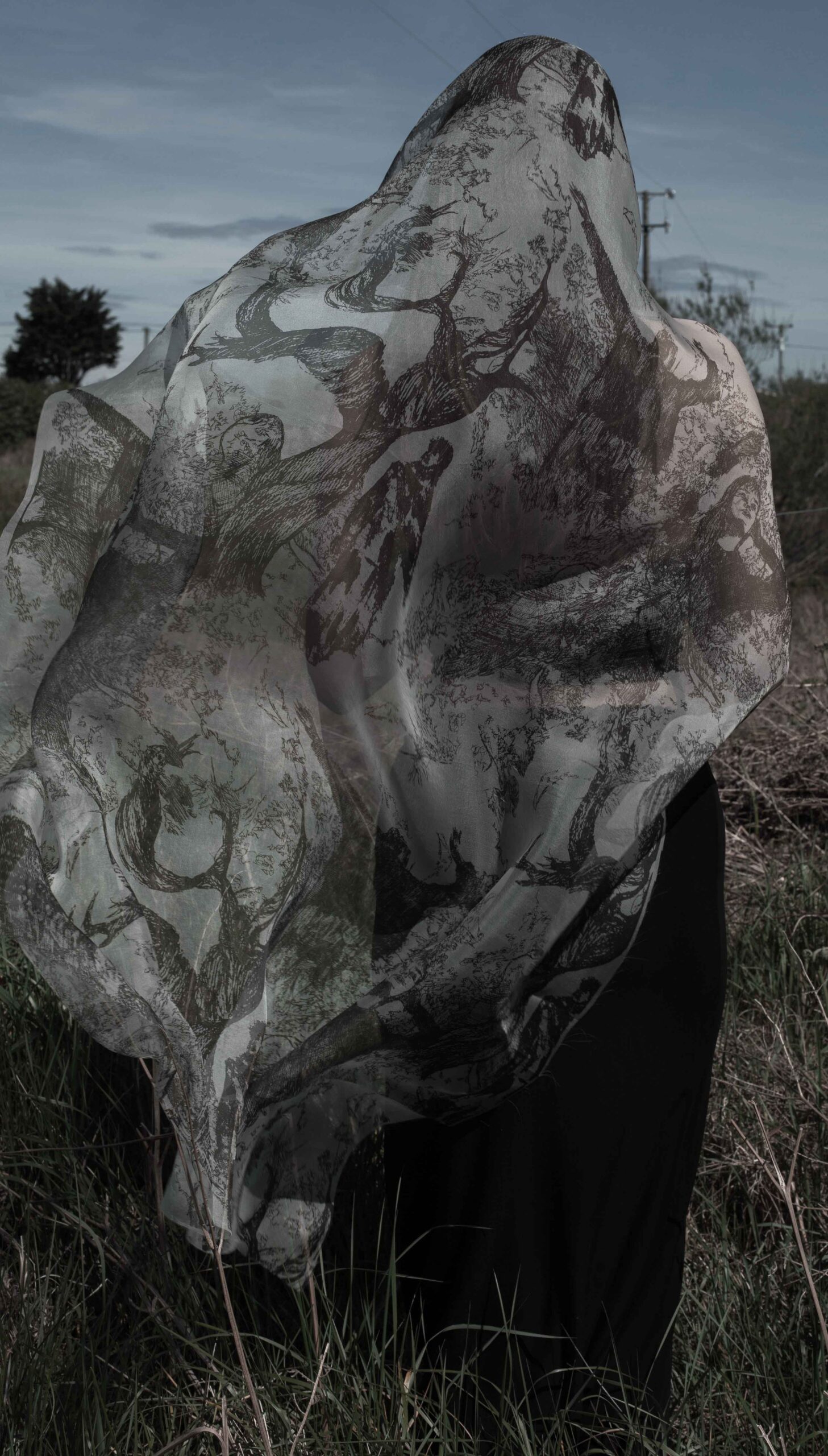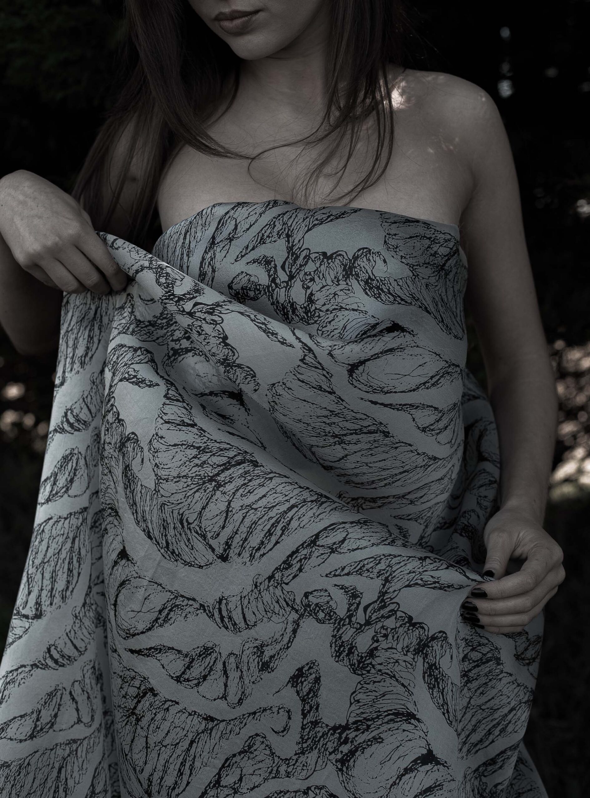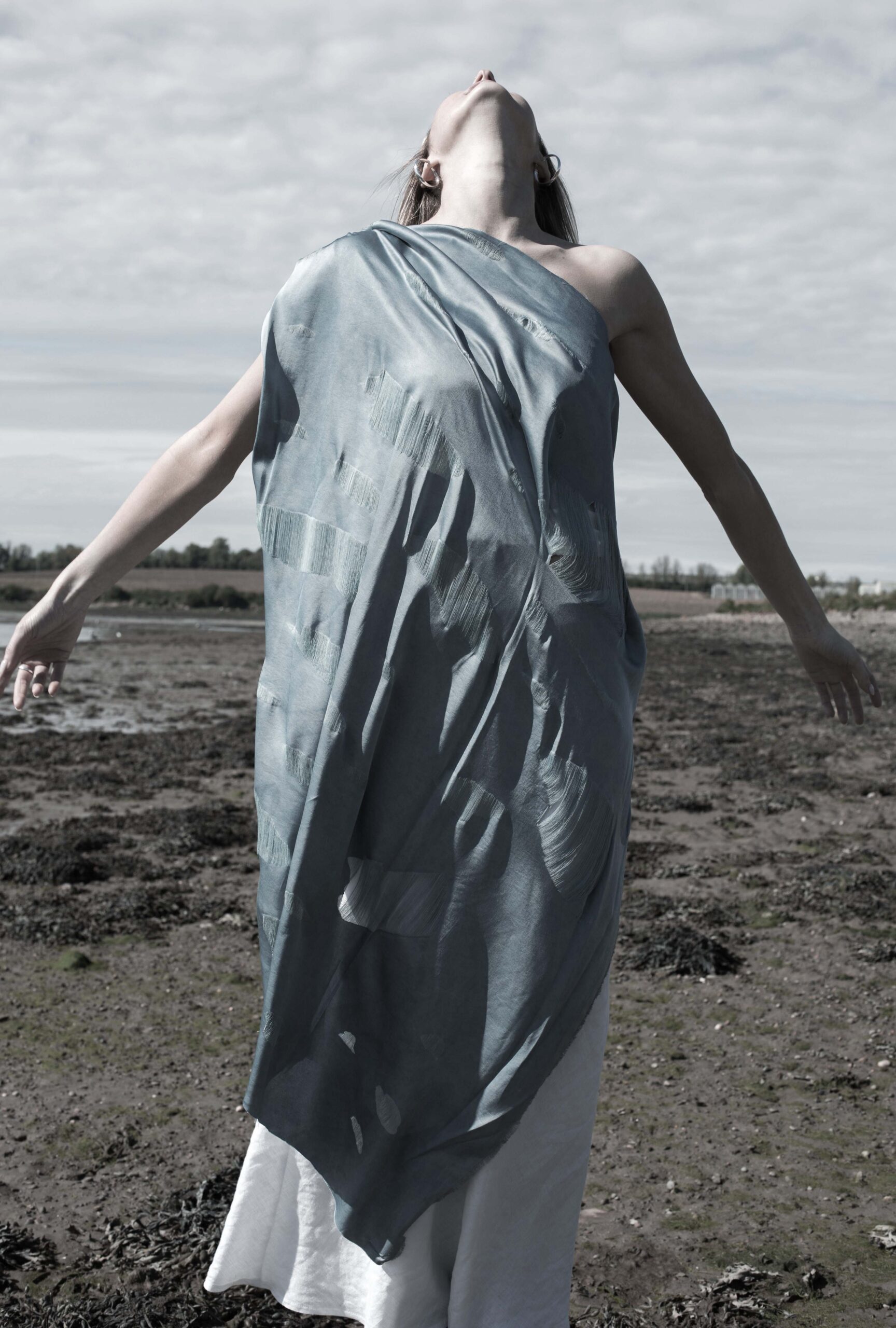 Faoi Dorchadas Tagann Solas (There’s No Light Without Dark)This textile fashion collection pays homage to two prominent female figures in Irish folklore: the Banshee and the Cailleach Bheara who foresee the coming of death and winter, two dark but essential elements of life. In screeching her prophecy of death, the Banshee brings new life. Unleashing fierce storms, the Cailleach Bheara balances the weather while her energy shapes our beloved coastline. However, these powerful characters are more well-known for their darker presences, typical of the culture surrounding female power. This collection delves into these strong characteristics whilst simultaneously addressing feminist issues in Irish identity. The overall colour palette contrasts light and dark, while greens of the Banshee’s forest and blues of the Cailleach’s sea distinguish between the two characters. Designed for the modern woman, this collection allows her to express her views through the clothes she wears.