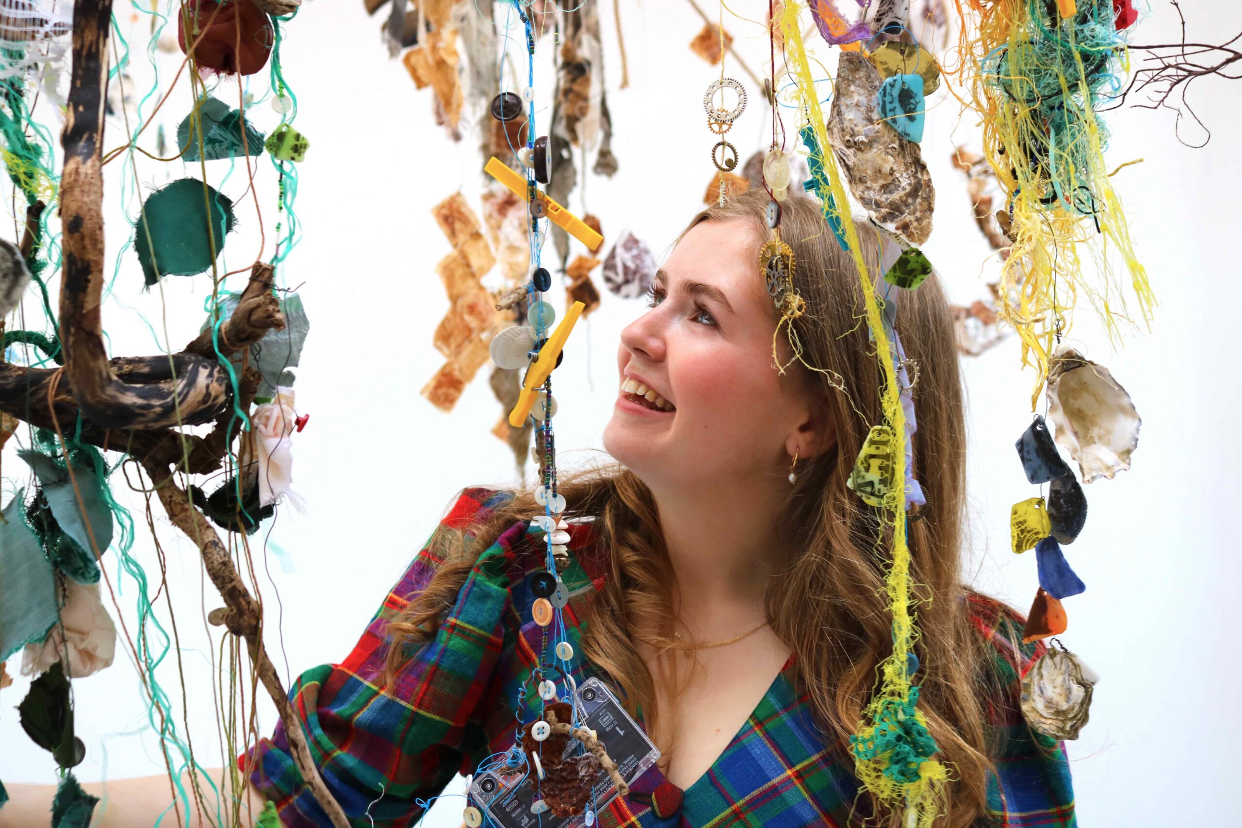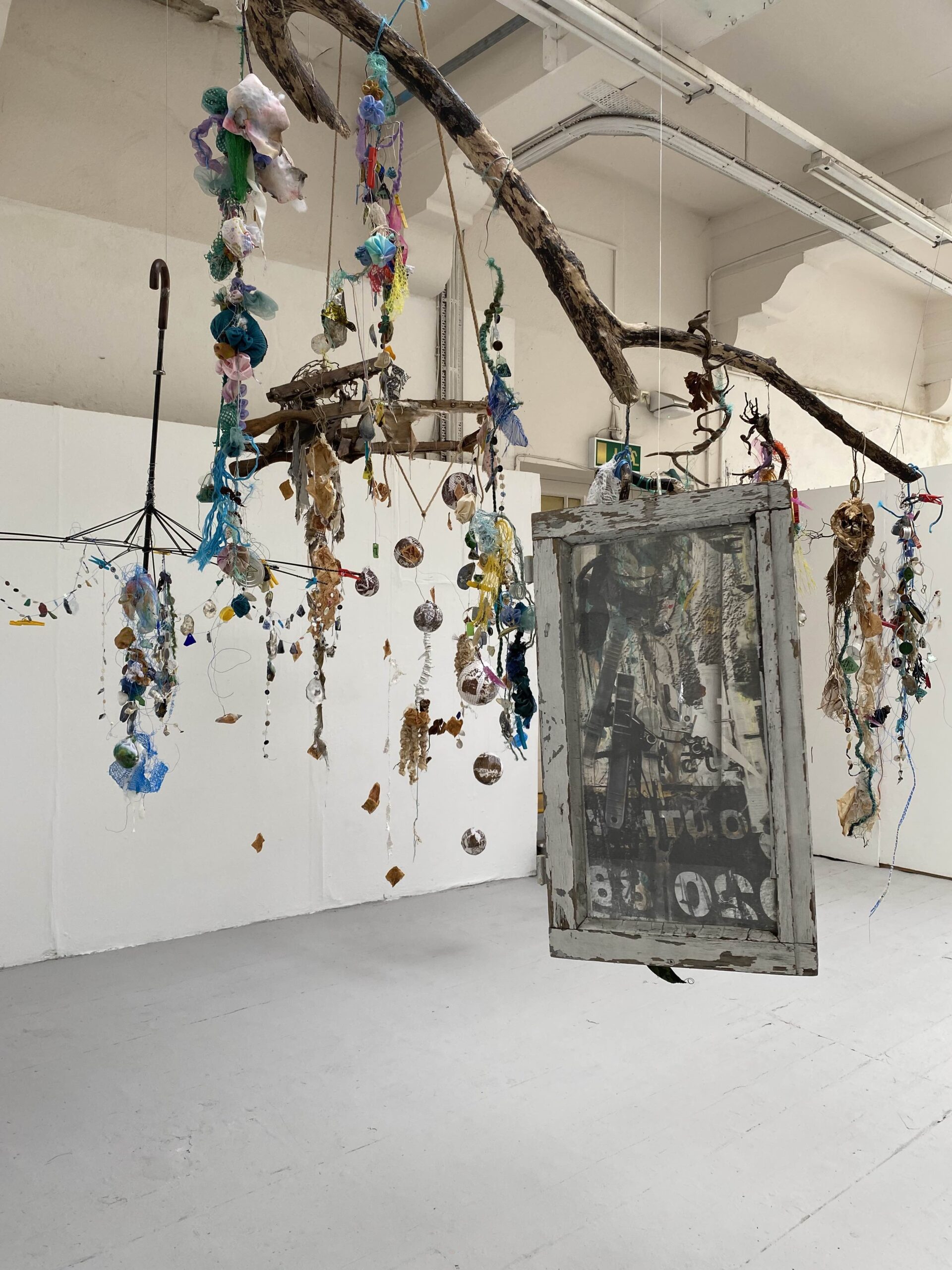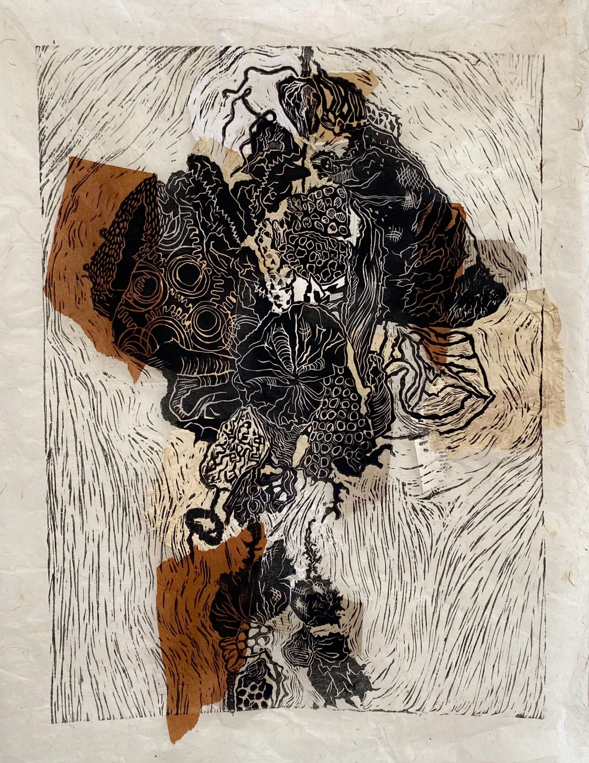 My work is a window into the connections between found materials and my internal experience of fragmented connections. I explore the subluxed connections of a defective structure and the vulnerability of the human form. As someone with a condition affecting the structural protein in my body, I gain a sense of empowerment through the work. I am inspired by collecting found materials which resonate with me, acting as keystones to represent physiological elements. I experiment with ways in which I can connect pieces together to act as a mechanism to bind tissues into a structure. An intuitive process of knotting, stitching and interlocking demonstrates a fragile, lax, disjointed internal connection. I photograph the objects and collage them together using print to transfer the imagery onto various materials. My lino prints act as a structural code like a DNA pattern. I have used screen and lino print to transfer my imagery onto found materials in my installation. This has allowed me to create a language that connects my work together. I have also used my print work in my moving image using mixed media animation to make my lino prints come alive.