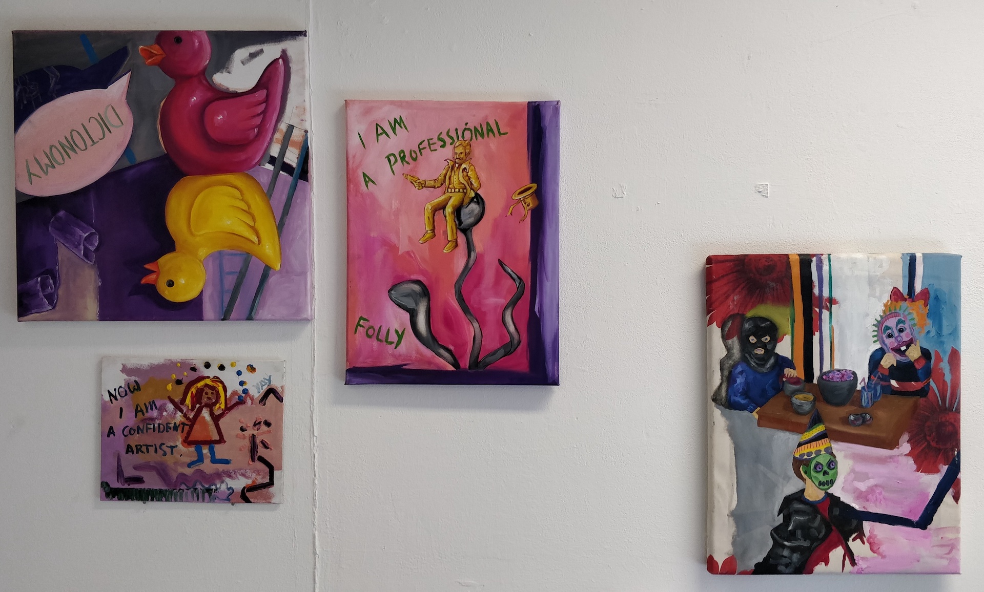 The body of painting work is an introspective and idiosyncratic commentary of the contemporary world. It unveils ironic humour in the societal expectations imposed on women and the oxymorons that surround our everyday lives.