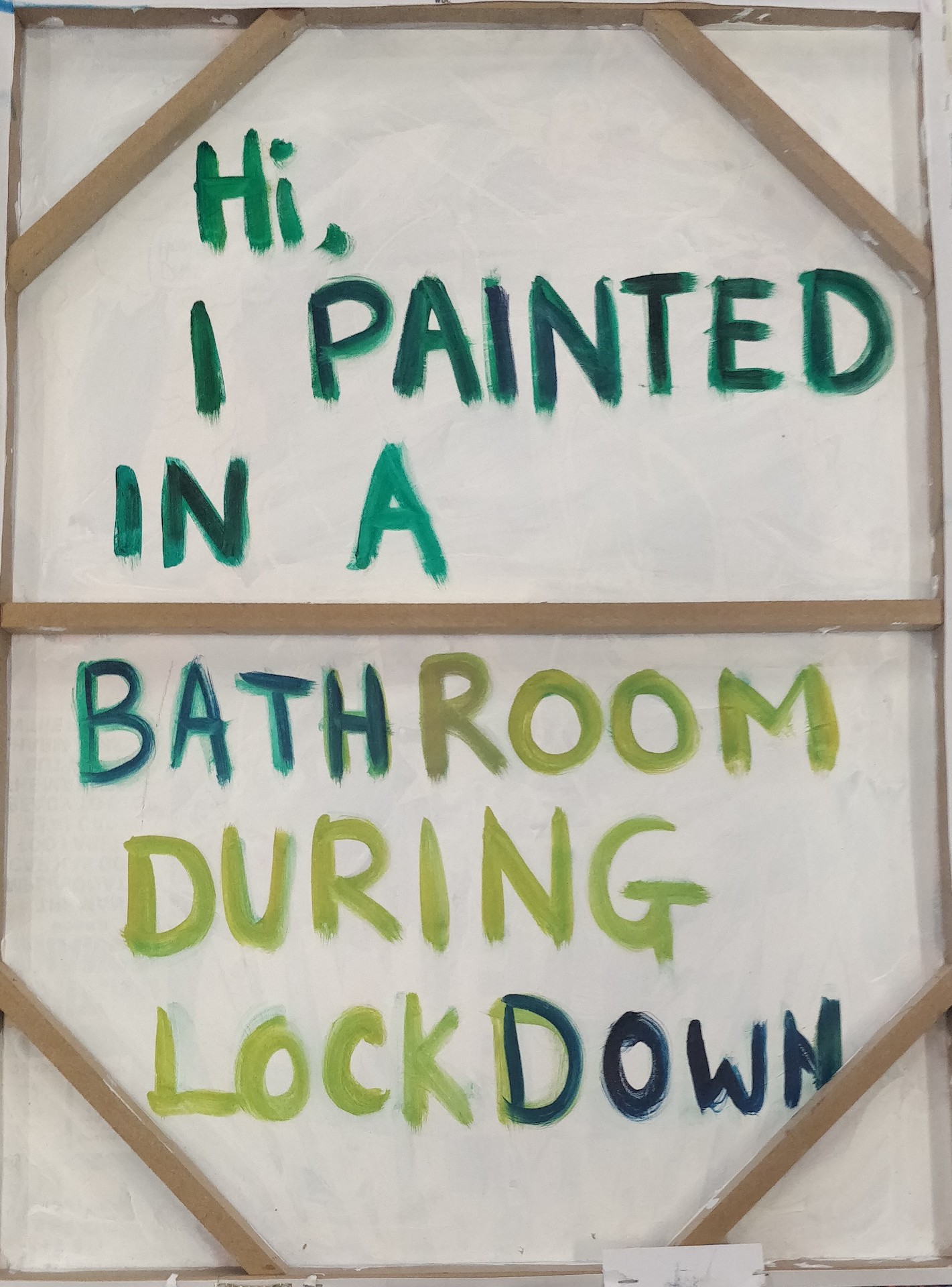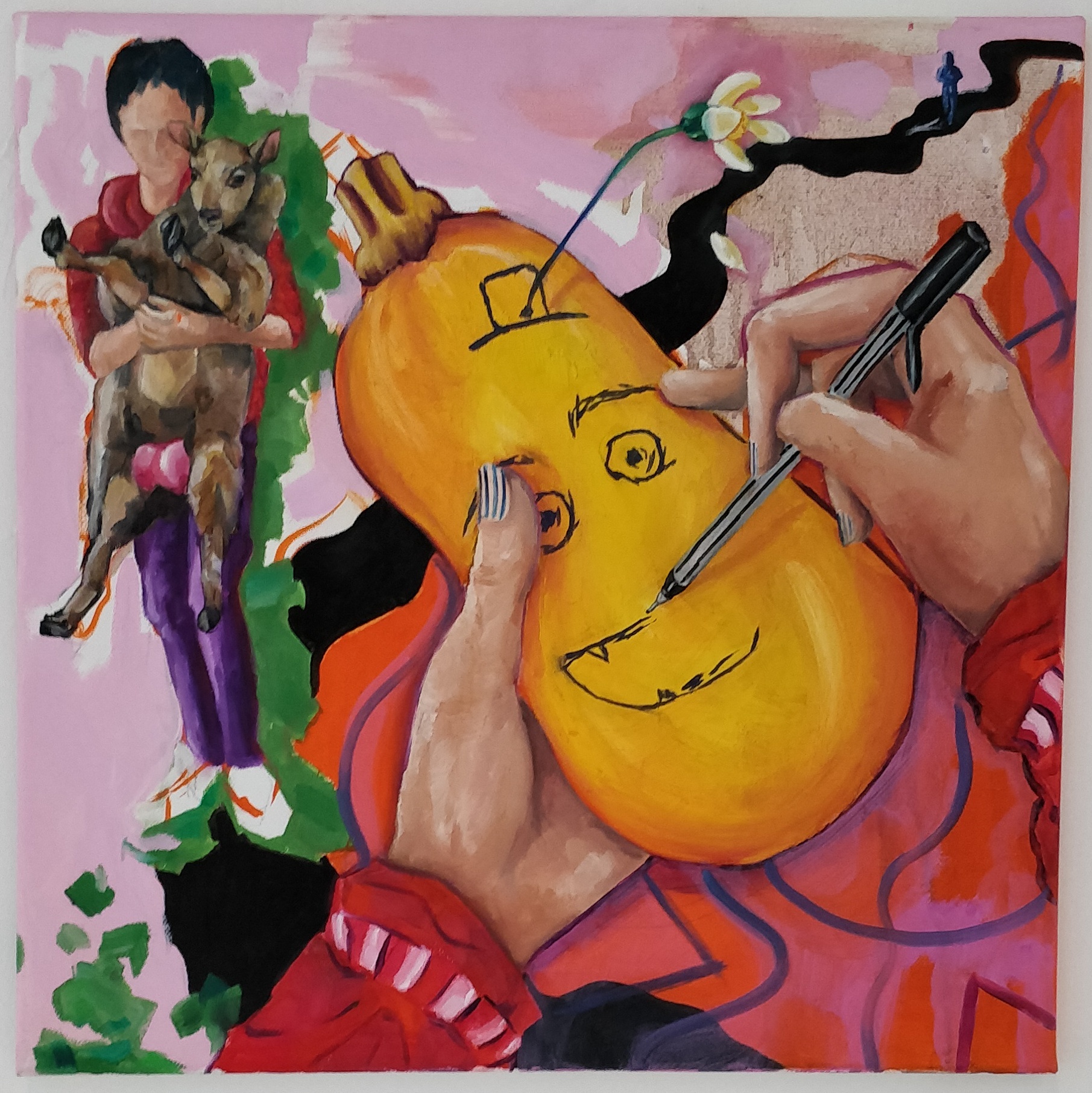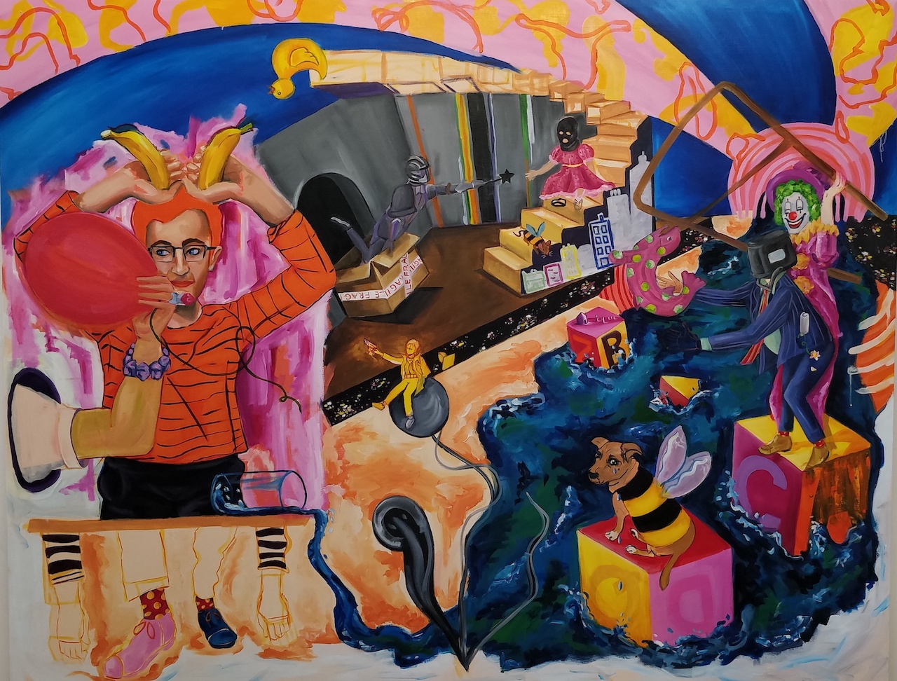 The ability to adopt humour can challenge adversity. The bright themes bring a sarcastic comedic spin to a dark subject matter. The colourful and playful imagery is a satirical illusion of happiness and reflect an inner maternal turmoil. Figures with balaclavas and buckets on their heads reappear throughout the paintings; they serve as a maternal instinct to protect and provide optimism in a rather bleak world.