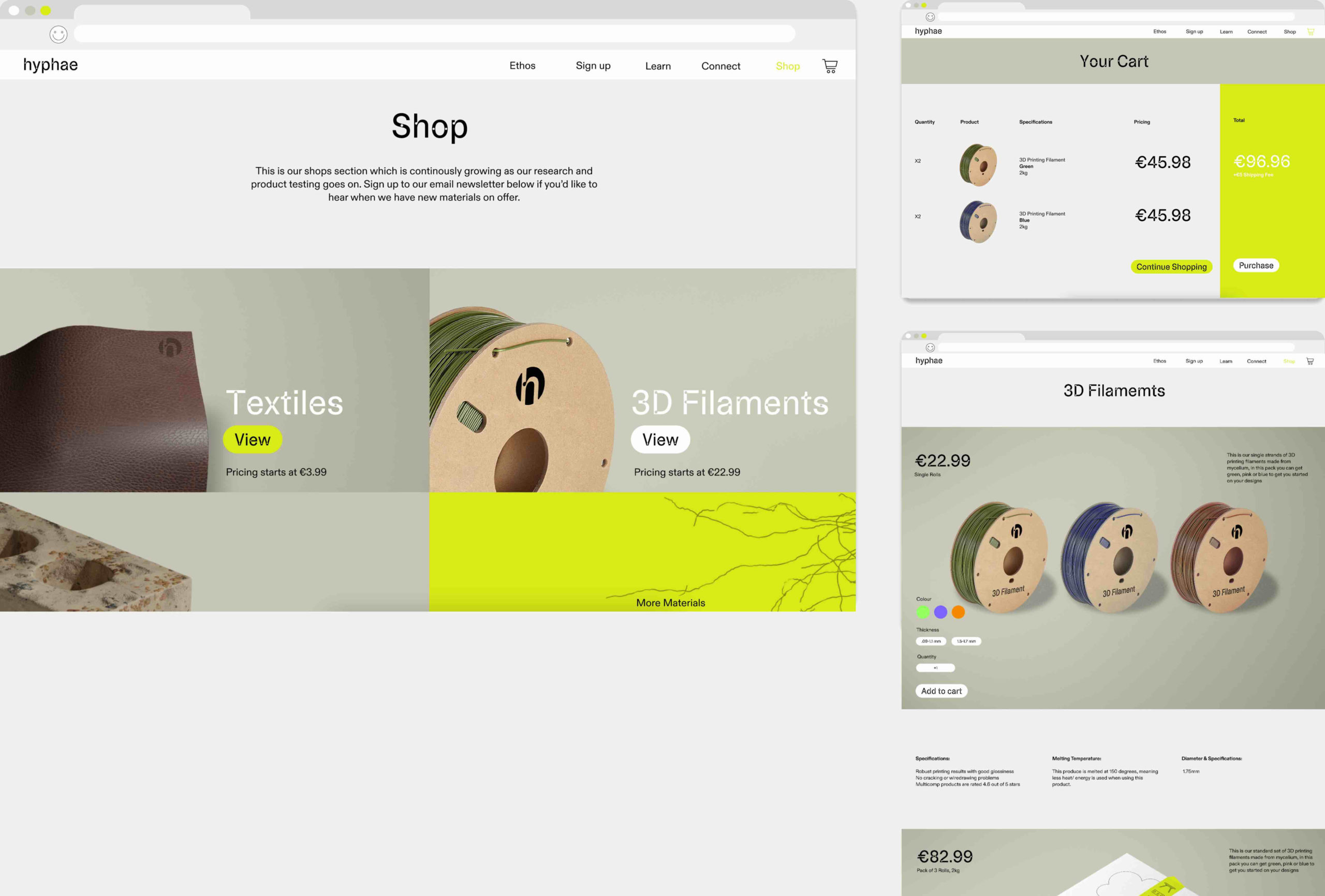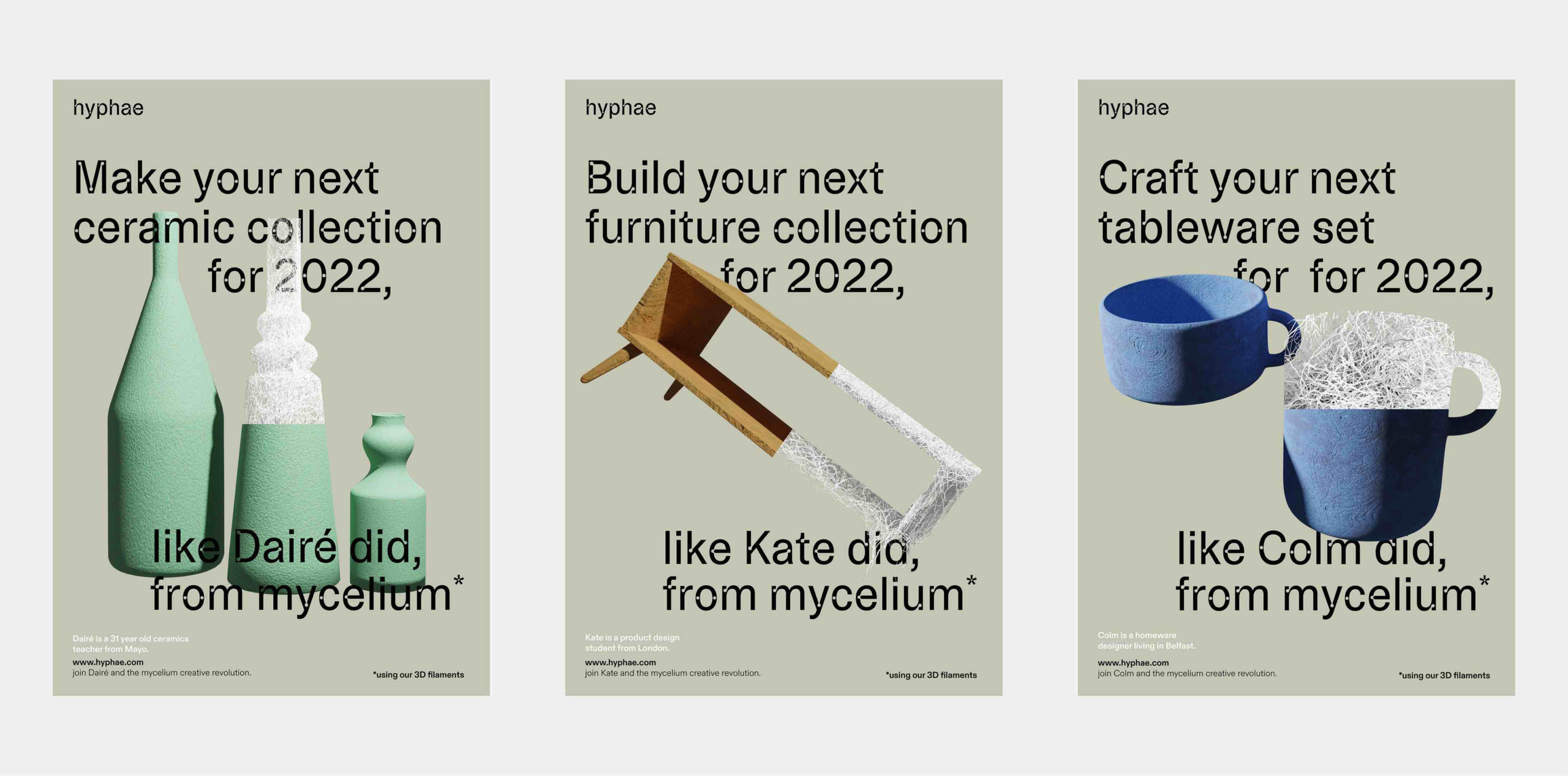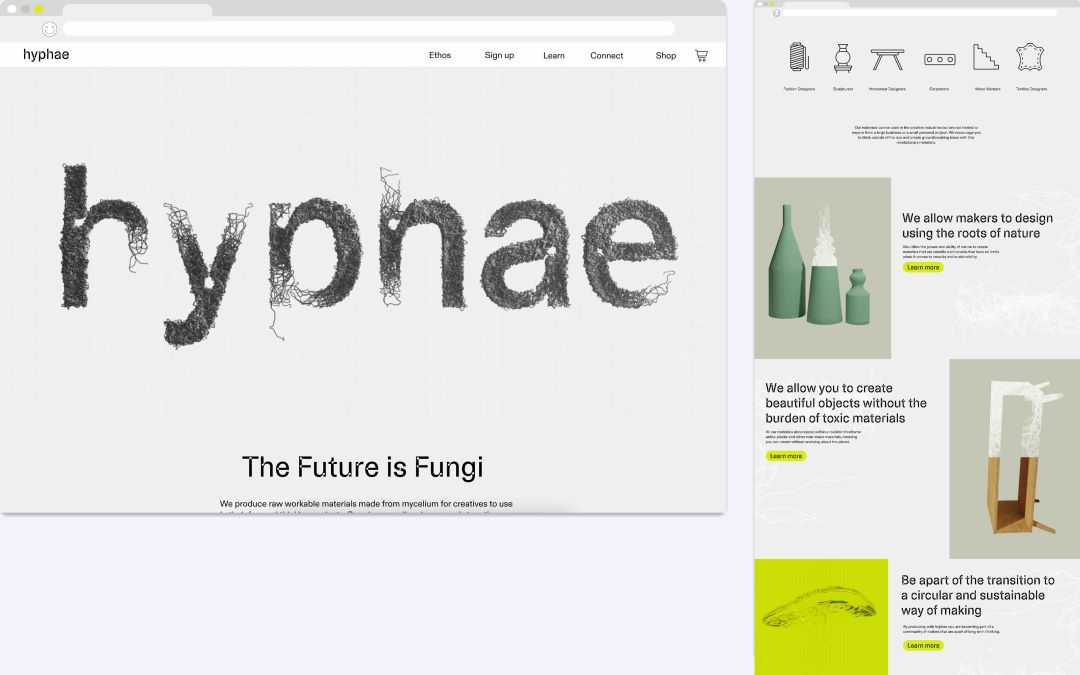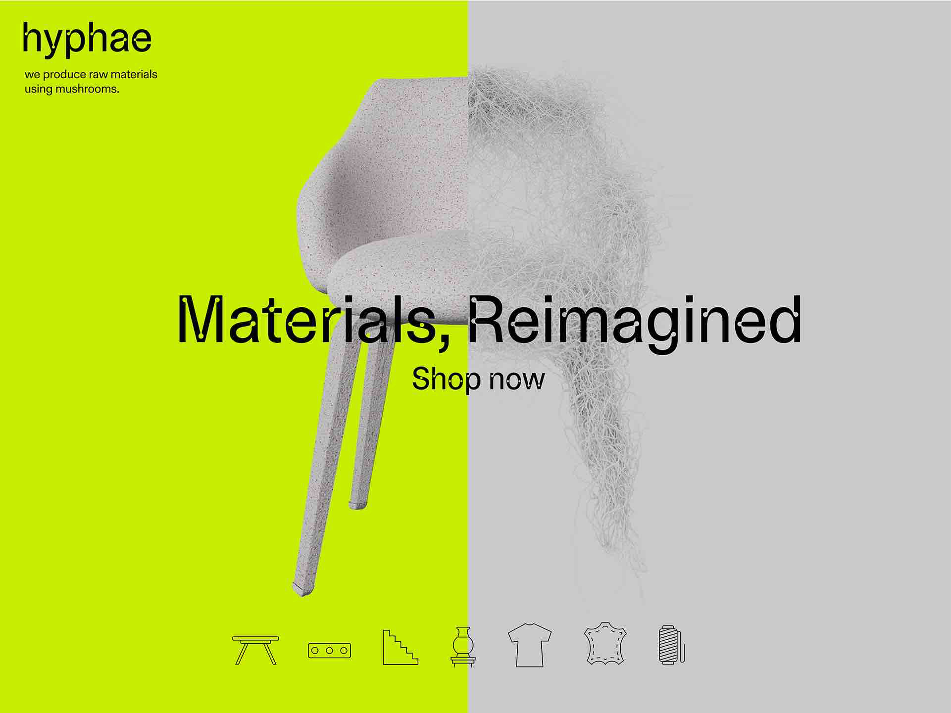 Hyphae aims to utilise the dynamic power of nature to produce materials that biodegrade and are made using minimal resources. Hyphae is a near-future speculative company that sells raw materials made from mycelium (mushrooms) such as textiles, construction materials and alternative 3D printing raw materials. Hyphae acts as more than just a brand of materials but as a community for those making beautiful things from the material to share ideas and creations to help reinforce the greatness of mycelium to new makers.