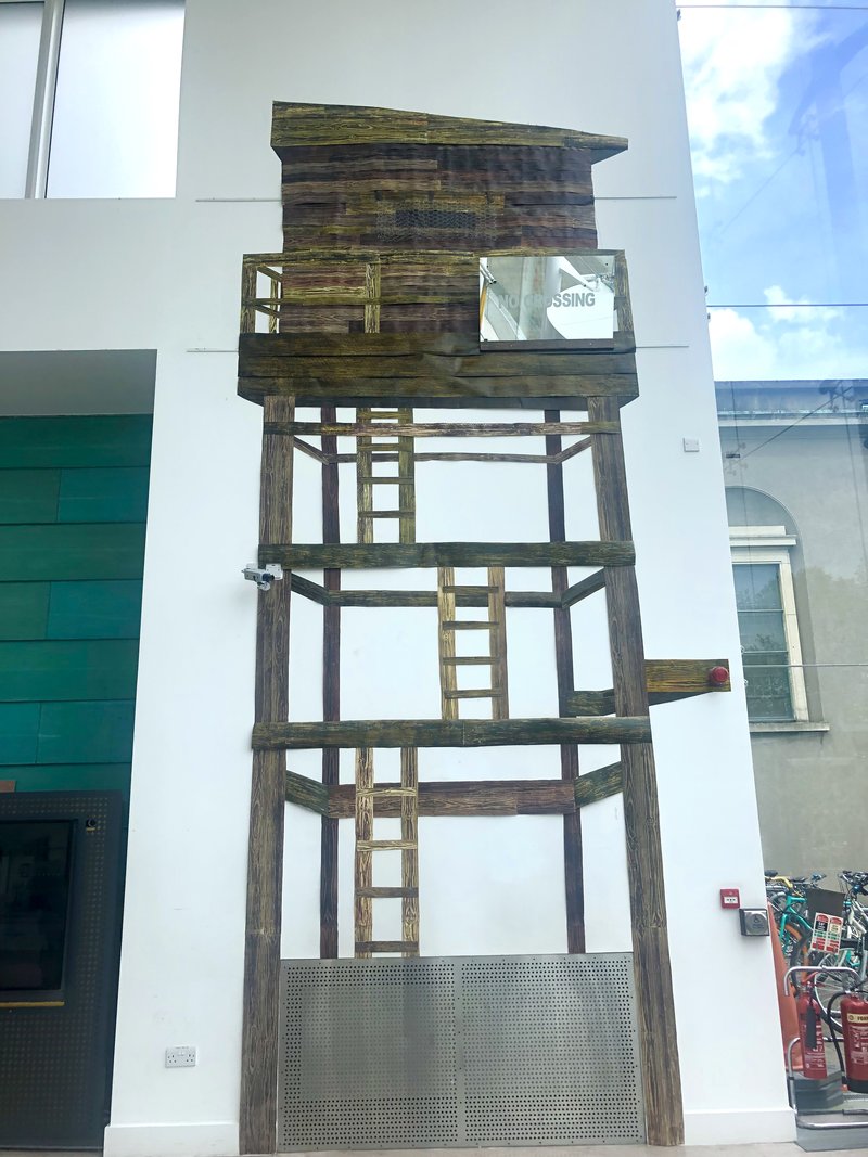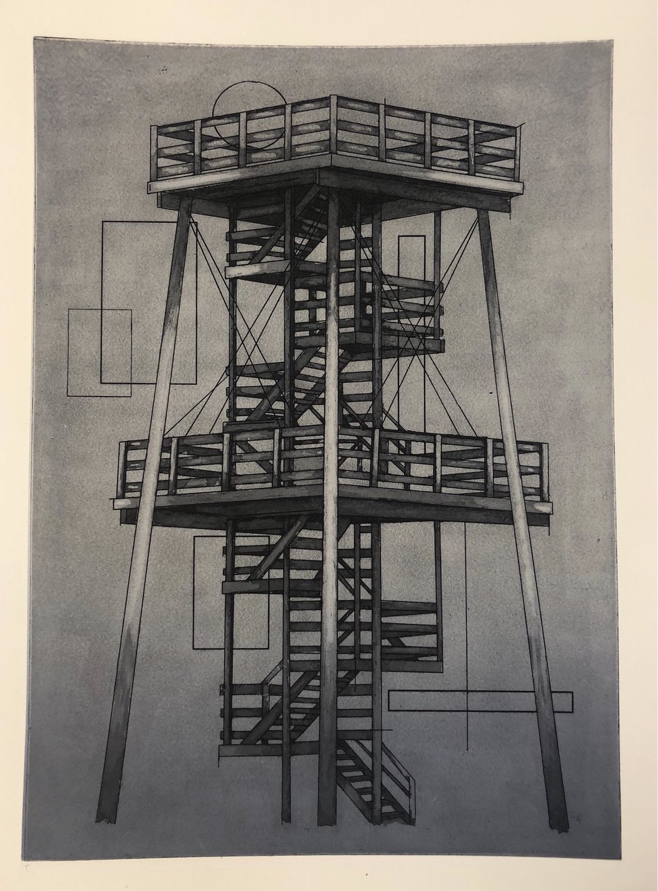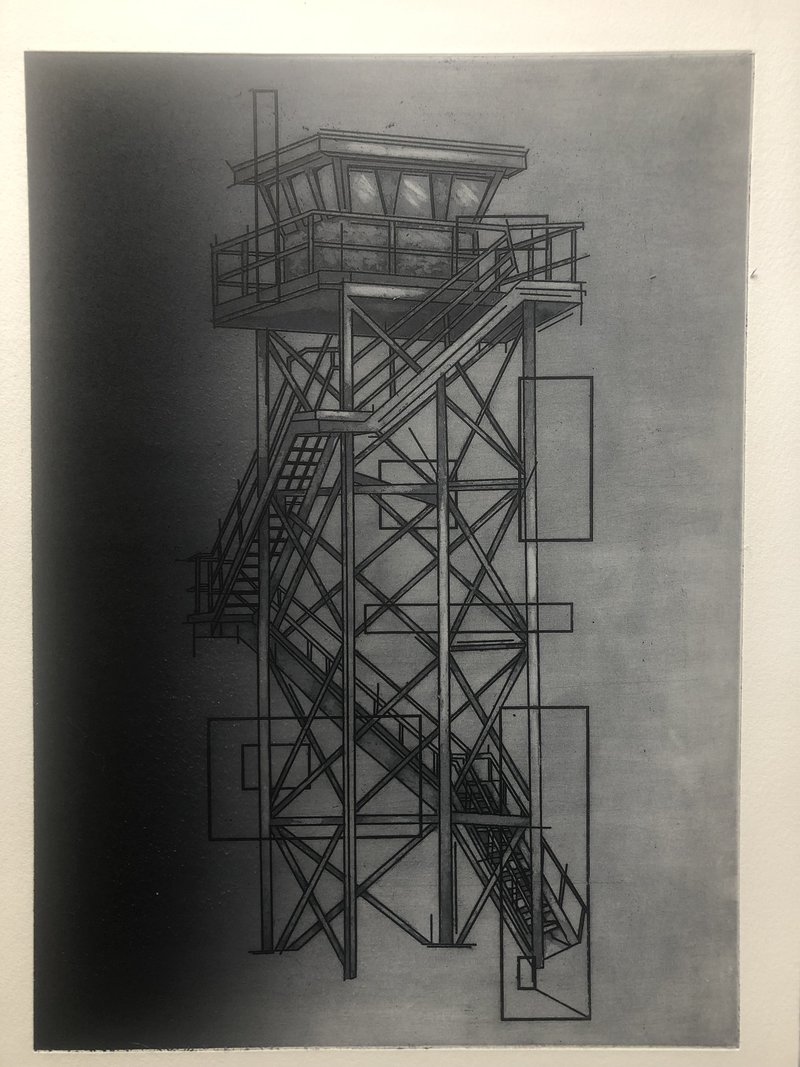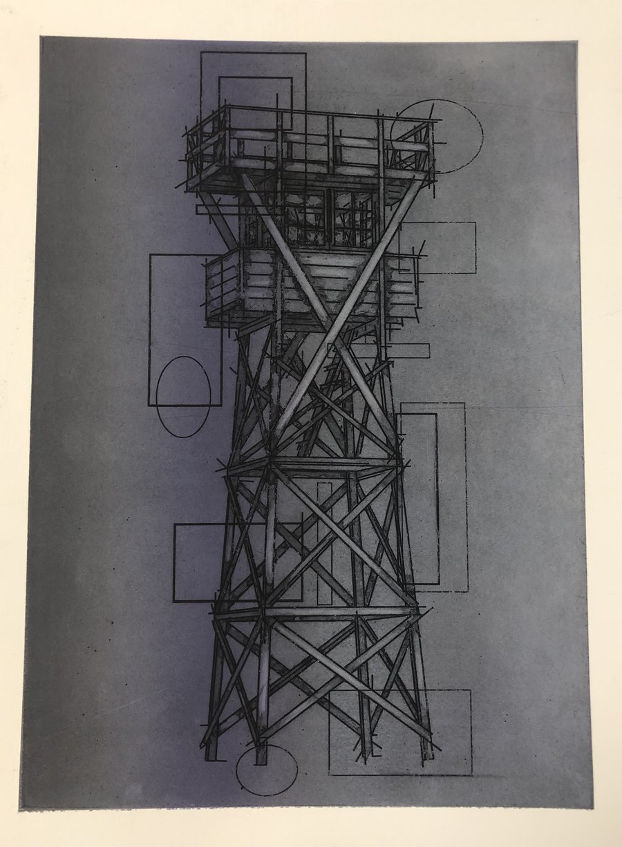 My work is concerned with the idea of Borders. The watchtower became a defining image and symbol of restriction, violence and a lack of freedom. The intricate framework of the watchtower has become a metaphor to explore the idea of boundary, frontier, partition and the dividing line. The repetition of the black line that