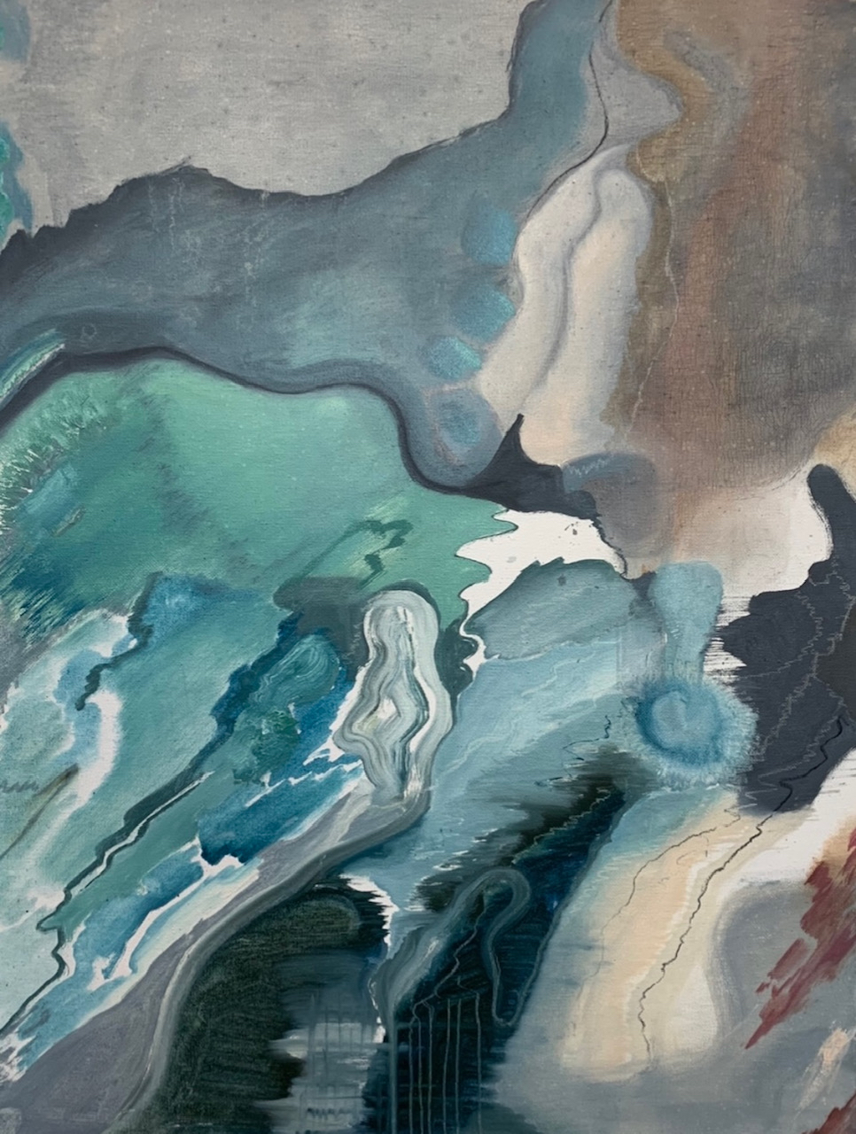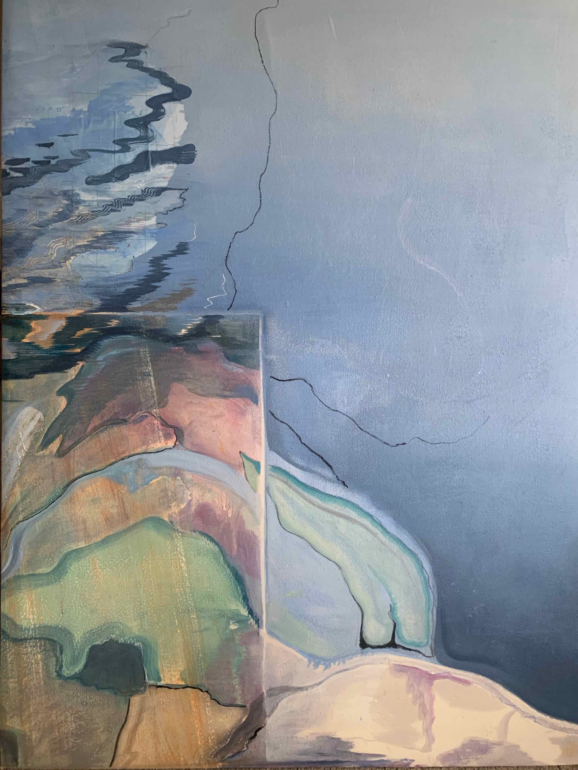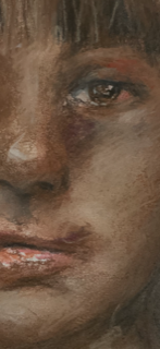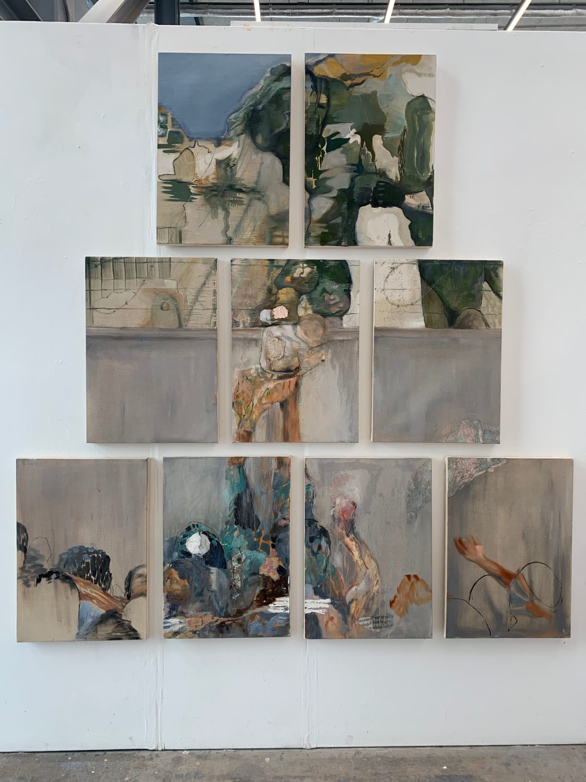 I work mainly in oil, utilising photography, digitally broken-down imagery and collage to create a painting. Exploring how interactions happen between different mediums, I also embed and imprint with carefully chosen materials and sometimes tiny objects. Layering provides depths to be explored. Some collaged elements are buried so deep within the paint that they will never be seen again; some are hidden messages of solidarity or torn fragments of maps to represent a displacement. I often start a project with a clearly sketched plan but, when paint hits canvas it betrays an inner truth, be it joy, fear, menace or despair. I want to evoke a pause for contemplation, to focus, not on any conflict or political agenda, but on the resilience and compassion of the human spirit. Some images have reached out to me, like a hijacking, an insistence that I pay attention.