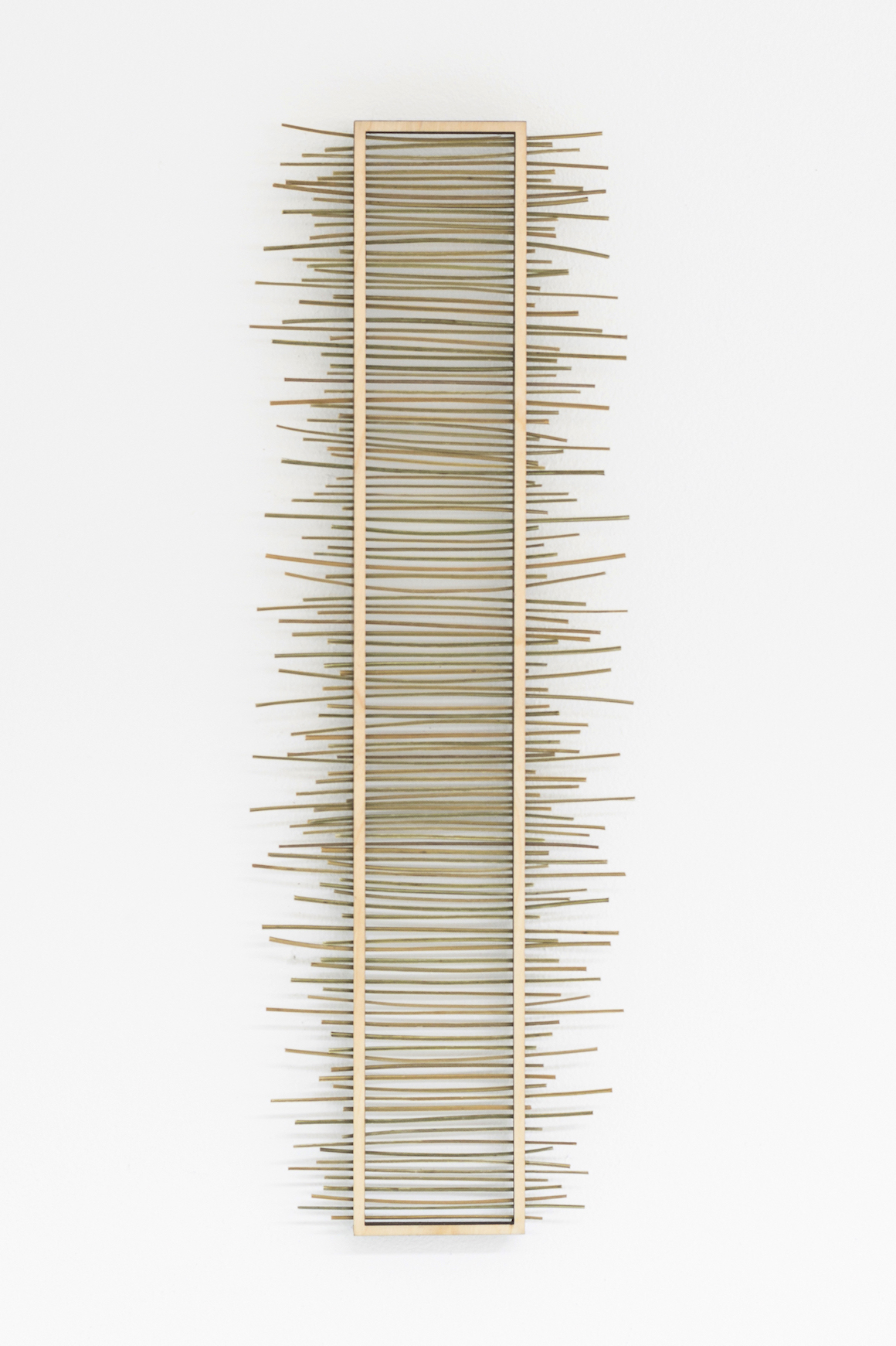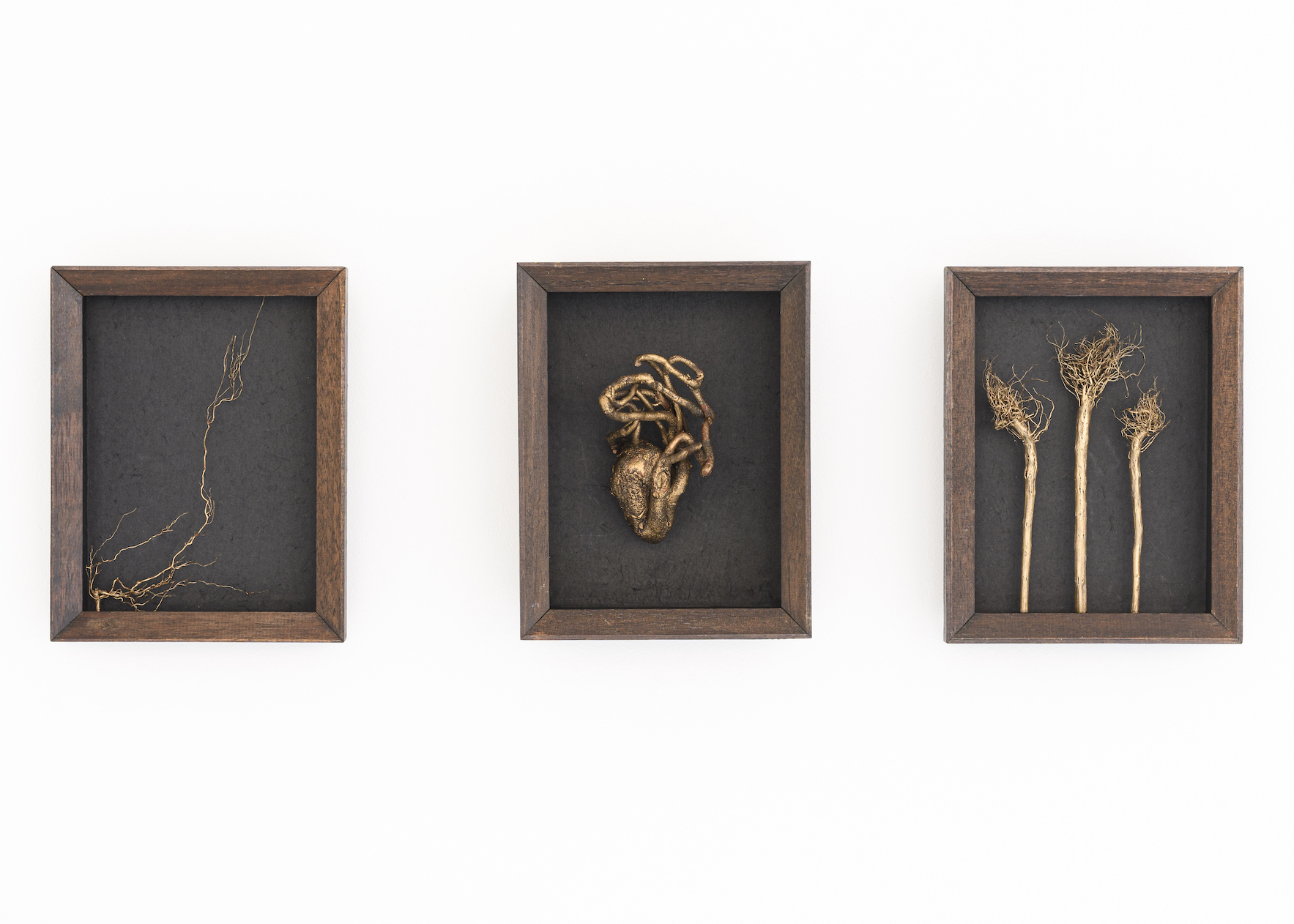 My work seeks to elevate the diversity of botanical elements. The unique form and tone of even the humblest of plants is a source of wonder to me. I find a visually rich resource in the seed heads, stems, leaves and roots of plants. I honour and elevate the plant matter which would normally be disregarded, and often discarded. The works are semi-sculptural, incorporating plant materials which are presented in frames, boxes and stands so that the simplicity and elegance of the subject is enhanced. The pieces showcase the beauty of the botanic world, often in unexpected ways. I utilise specific parts of common plants, such as artichoke, nasturtiums and sycamore. These are presented in arrangements that encourage us to view them in a new way. The minutiae of any plant, whether seed pod, root or stem, is thus made the focus of attention. My concept draws on a lack of connection we have with our natural surroundings and hence a lack of awareness of the diversity of the botanical world. In all my work there is a juxtaposition of the refined regularity of our manufactured world with the wild diversity of the natural. My process begins with the gathering and drying these plant elements. There is an analytical element as I assess the material changes in the plant as it dries—some become too brittle to work with, others reveal new characteristics. I spend studio time arranging and composing how they will be presented. I employ a process of photographing the elements on various backgrounds and in different positions until I find the arrangement that resonates with me. My work as a bookbinder for fourteen years has translated well into my practice. I have an eye for proportion and precision along with an understanding of paper craft techniques. In some work I use a grid formation to present work, this has a gentle taxonomic effect. The diverse, organic nature of each individual element is amplified by its presence in uniform confinement. I mathematically define the proportions to allow space for the plant element to fit evenly within the frame. Delicate elements are attached to fine paper, with gently drawn grids, supported in a laser cut wooden frame. Textured root pieces are enhanced with a touch of gilt wax and presented in custom made black box frames to achieve an air of reverence. Fabric prints are another aspect of my practice. This involves scanning delicate elements in order to enhance and magnify the images. I use black and white to bring into focus to the tonal structural and use a repeat arrangement of the image to create an abstract effect. Sublimation print allows for the transfer of the image directly onto fabric. The use of fabric allows for further manipulation such a fraying. I strive for a sustainable practice. Having an understanding of the negative implications of our wasteful consumerist habits, I avoid the use of virgin materials in my practice as much as possible. My use of plant materials allows me to grow and harvest the elements I use. I also utilise the byproducts of edible plants or the pruning offcuts from decorative plants. The fabric I print on is sourced from second-hand shops and when packaging work I use post consumer card to construct custom made boxes.