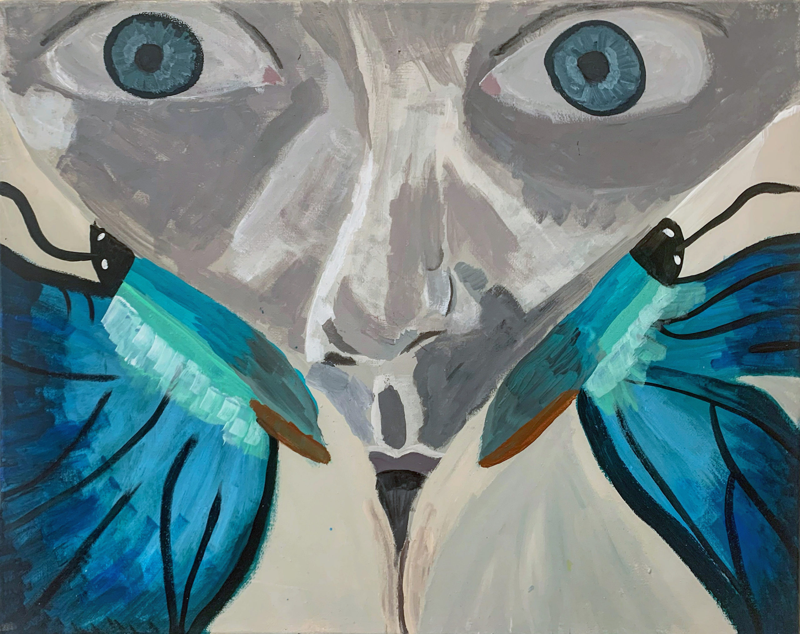 The Flutter Collective develops this methodology. First, I researched the meaning of butterflies, which symbolise rebirth. I then began to select images of butterfly species from across the world. I painted some of these species using make up on my face and documented a performance wearing them. This documentation then evolved into a series of acrylic paintings. In doing this, I hope to evoke a feeling of being a part of another world, escaping reality and creating a fictional narrative that punctuates the stream of daily events to find poetic meaning in everyday life.