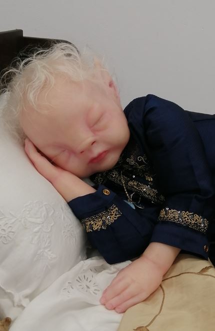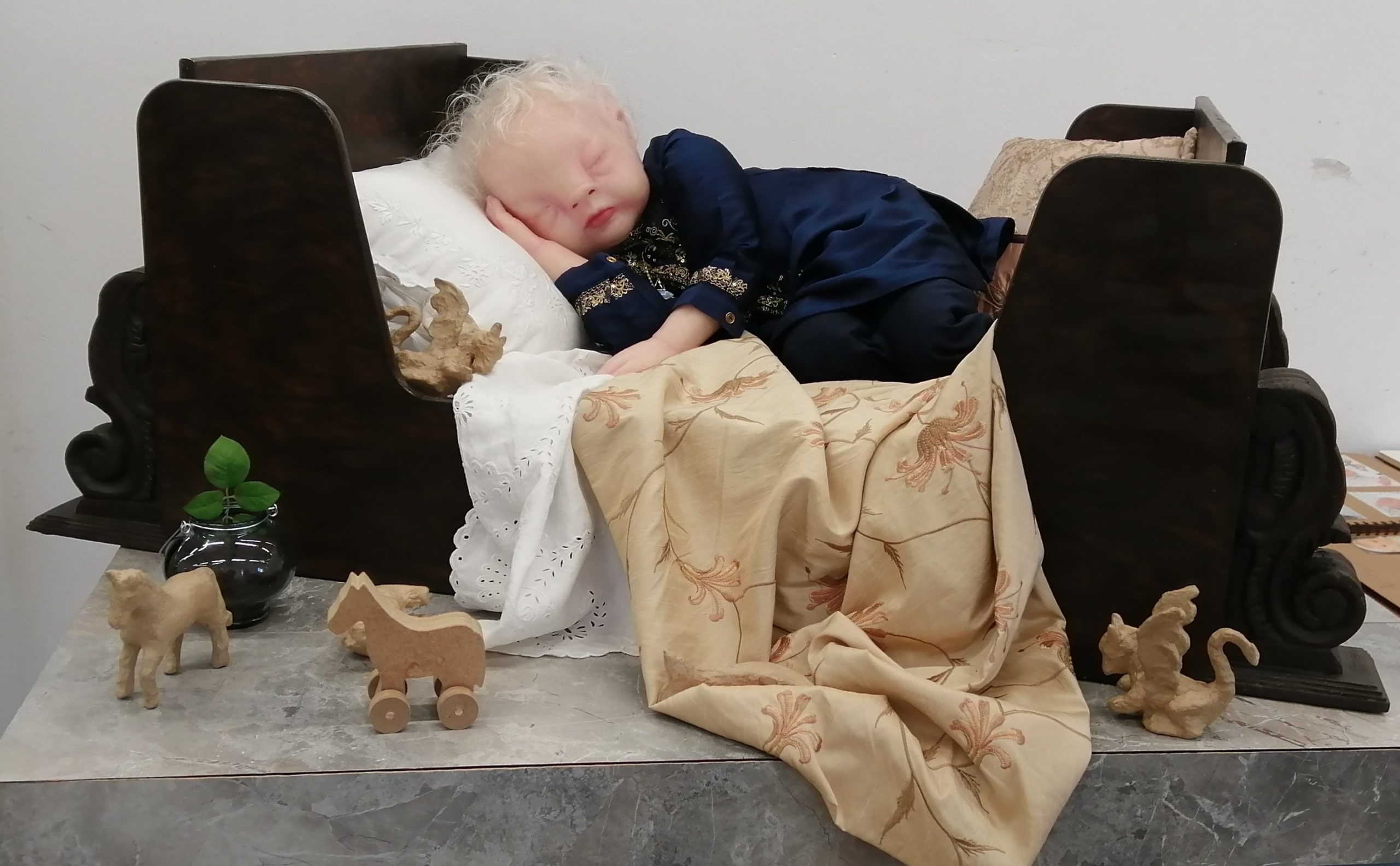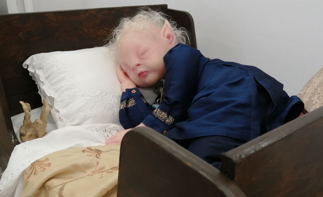 I have always loved fantasy and thoroughly enjoyed sculpting this humanoid elf toddler, I also incorporated a breathing mechanism to give the effect of a natural breathing rhythm as the Elfling sleeps in his bed. I created this bed using an old trundle and drawers. I painted an decorated the bed to give an old world look.