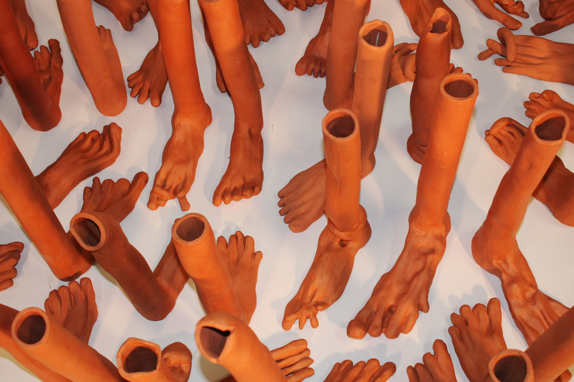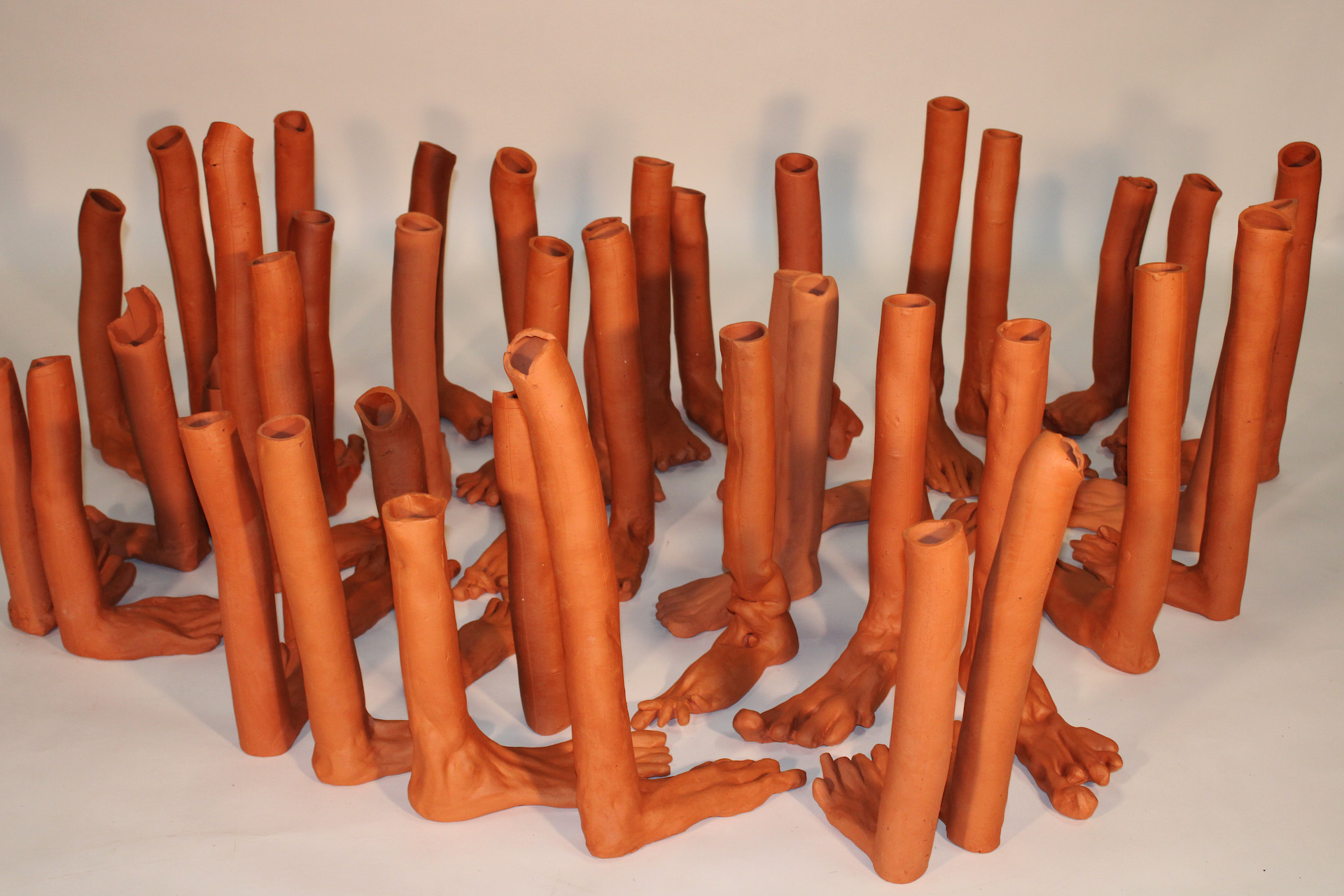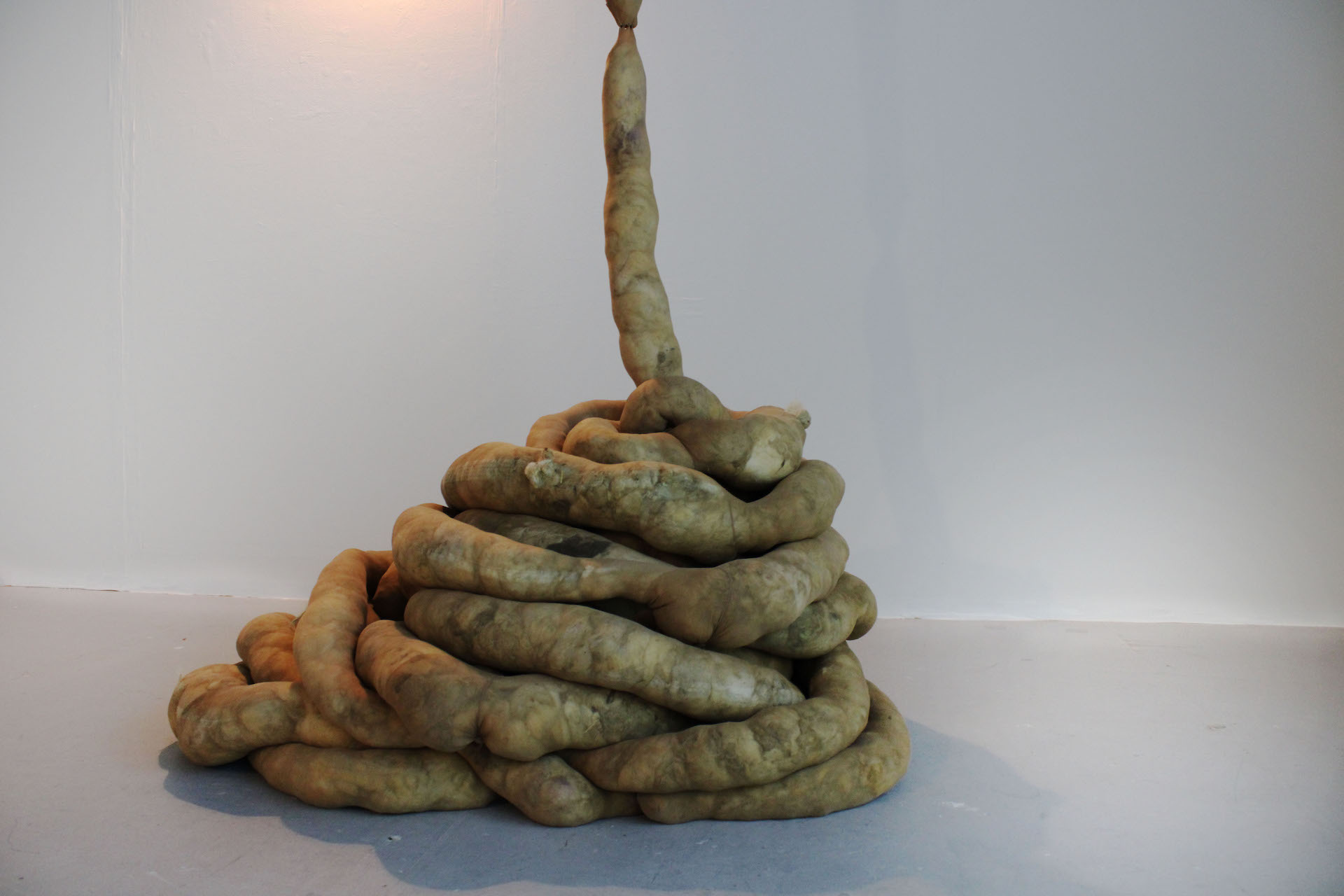 My work combines primordial, ancient and contemporary references to the body and the landscape. I generate disfigured forms and look at how the body can be perceived through time and the condition. Using clay, I make multiple body parts. These body parts are derived from the past and the present and combine realism and surrealism. Their limbs are like anatomical votives. Many cultures throughout history have made and used body parts as votive offerings. These were used to invoke many things- improved luck, health and prosperity. Using video, I visualised how the body transforms under conditions. I imagined how the body would look with the limbs multiplied or contorted. I stuff life into seemingly endless tubular forms which wrap around the body. This figure appears crossing the landscape and drags itself with great burden. I brought the figure to life in an environment that is familiar to me. It made me contemplate the history of the people who transversed this landscape before me.