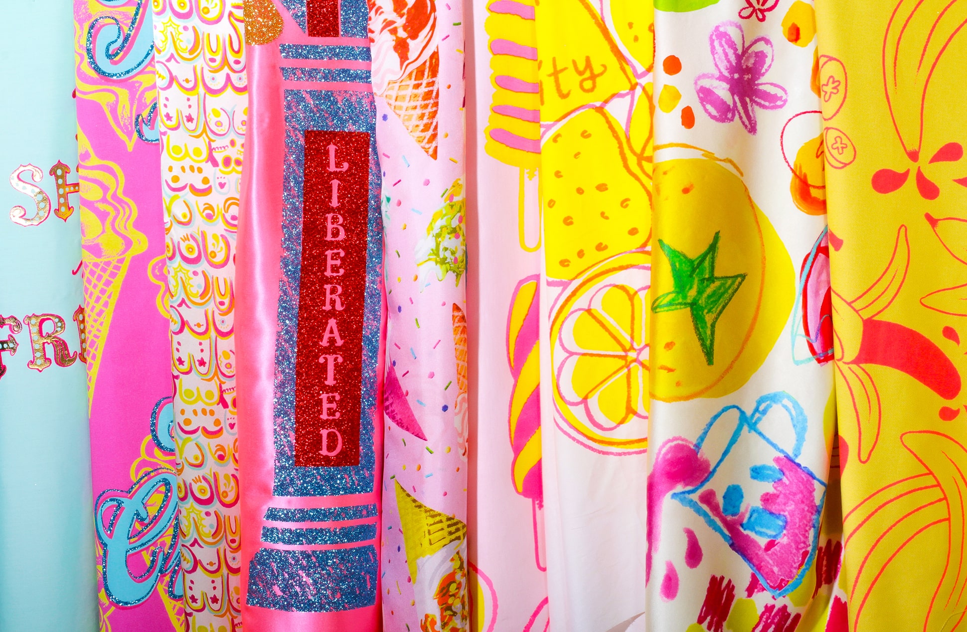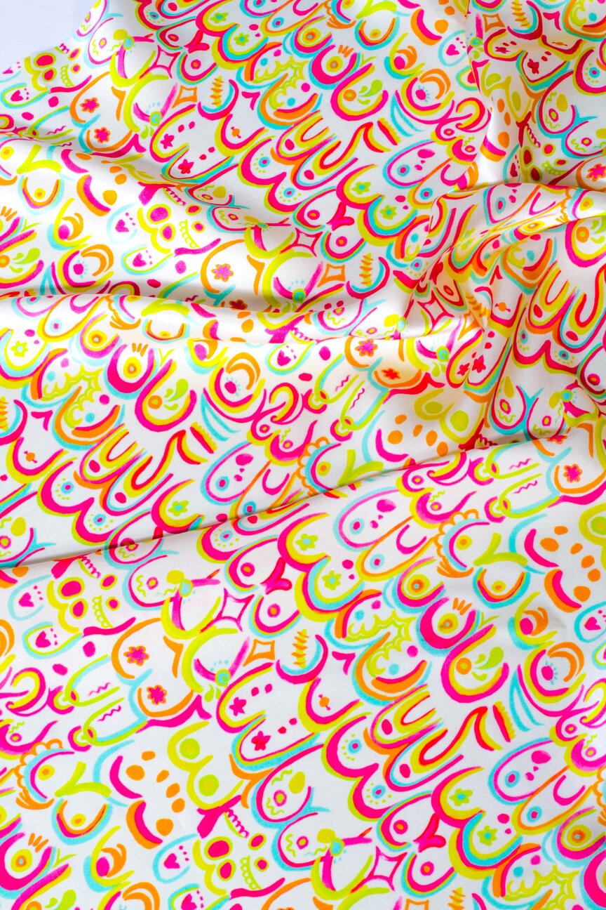 This womenswear collection is about being fearless and bold and giving the middle finger to misogyny through maximalist, playful prints with a tongue-in-cheek attitude. Cheeky slogans have been designed to create humour and debate around societal attitudes towards sex. This serves as a joyful reprieve from a society that has for too long shamed women for their sexuality, and as an impassioned reminder that there is no shame in their freedom.