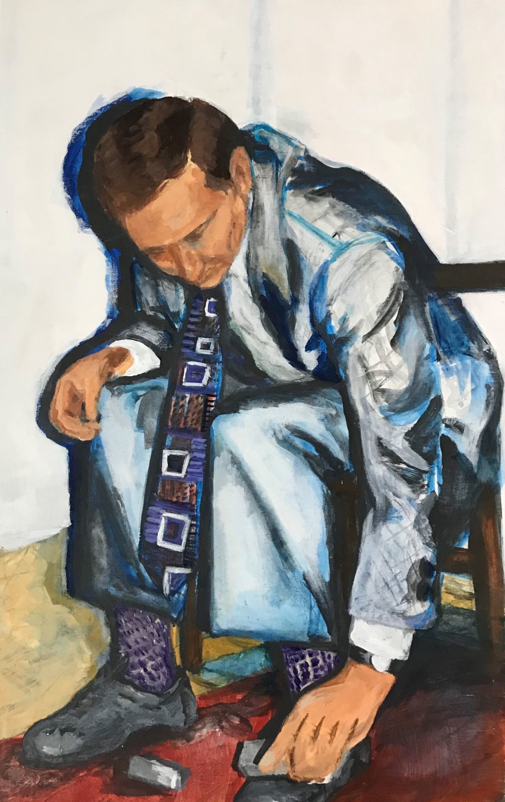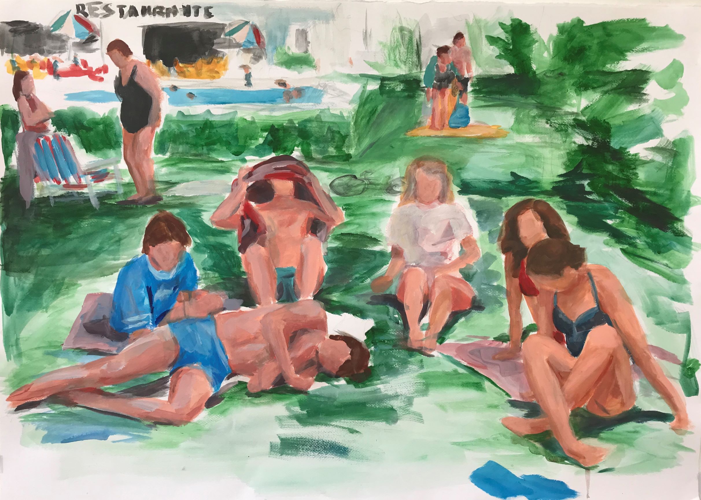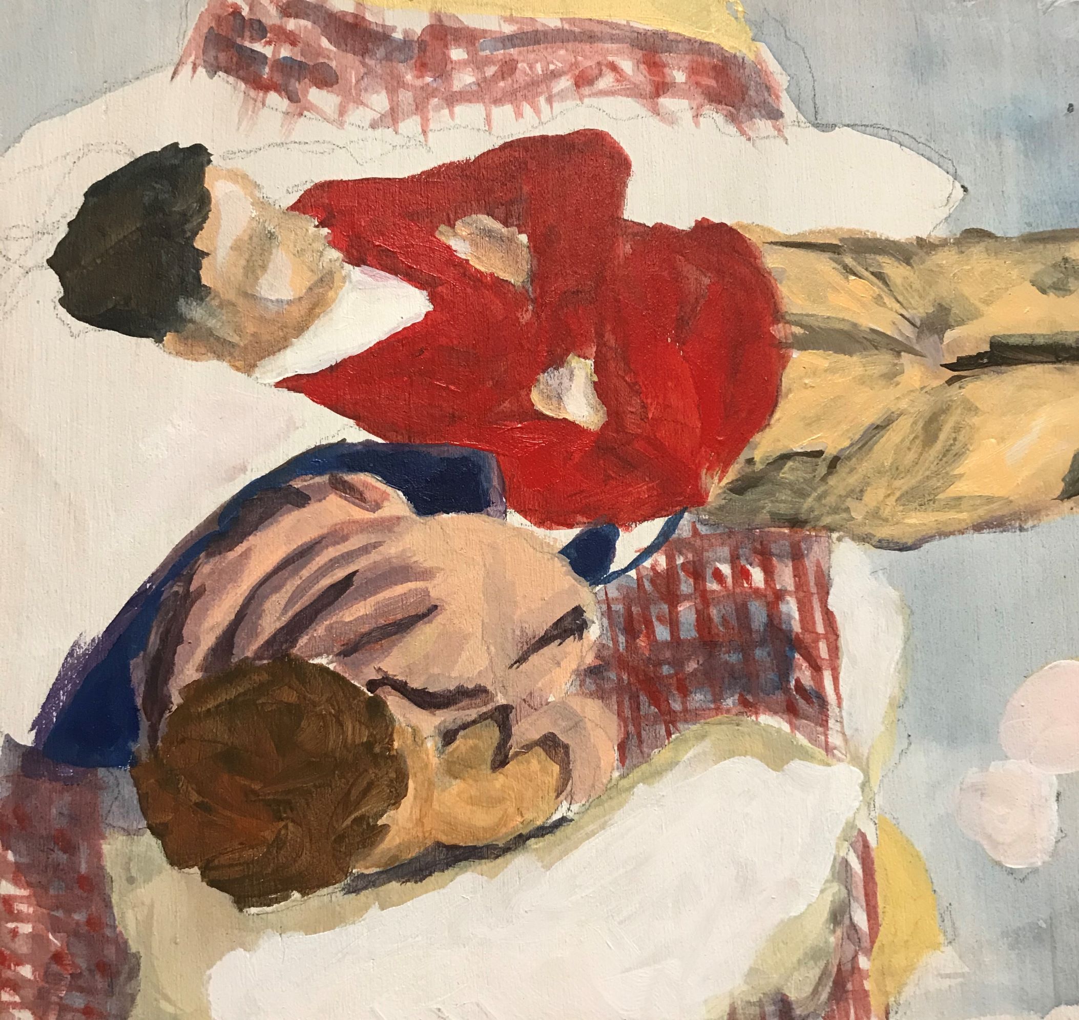 These paintings portray ordinary people engaged in everyday activities. They are figurative pieces painted on primed wood and stretched canvas. I aspire to achieve a sense of intimacy within the relationships depicted. My subject matter focuses on human interactions in social situations, attempting to capture momentary exchanges, showing the close familiarity of friends and family, relaxed and unaware of the viewer’s gaze. I use a lot of colour in my work to make it vibrant and engaging. In these paintings I wanted to reveal those unnoticed moments, capturing instances of casual intimacy in which subjects are unaware of the external viewpoint. The characters in these social settings are anonymous, lending a feeling of both universality and accessibility to the work and perhaps enabling the viewer to place themselves or those they know within these social settings. I enjoy studying and depicting body language and deciphering the untold emotions and thoughts it may convey.