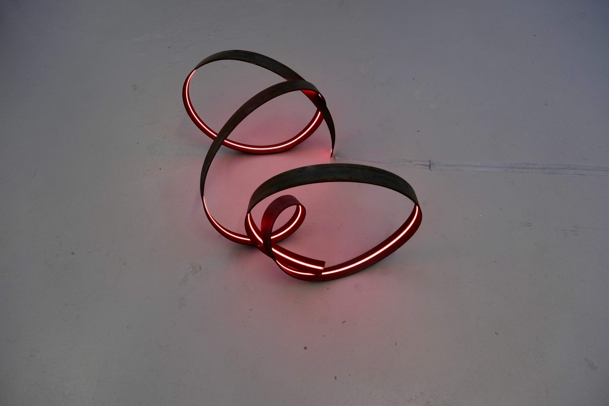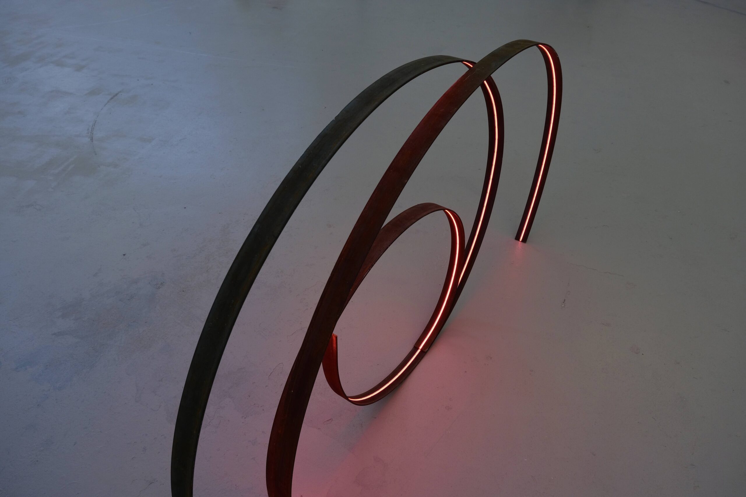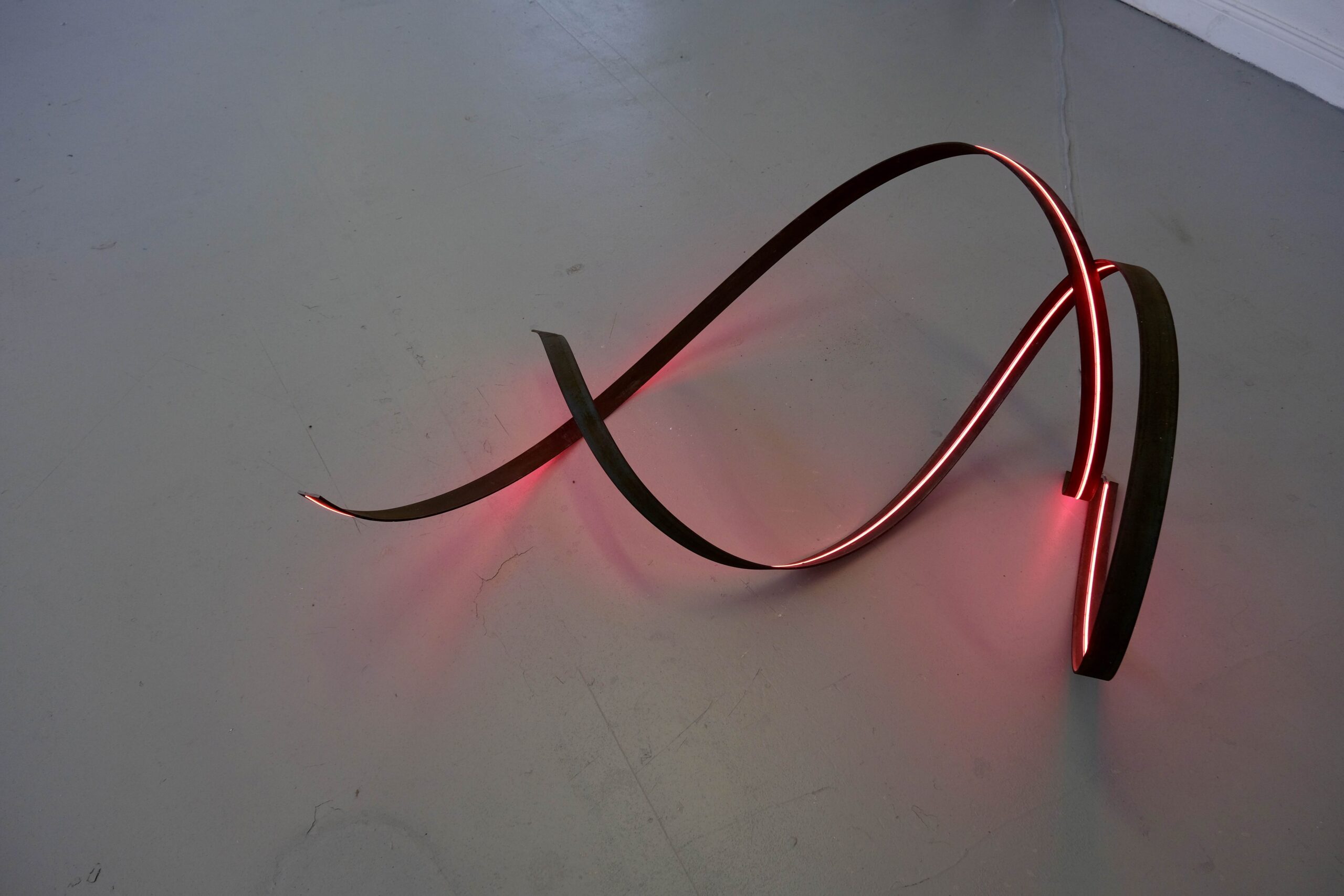 My work utilises geometric bodies, industrial materials and saturated red light to create landscapes of material which engage and activate the space in which they reside.Being the son of a labourer, I grew up on construction sites, unfinished and un-realised spaces. Exposed to an extensive set of construction materials from a young age I naturally garnered an understanding and admiration for this subject matter. My extensive use of steel and geometric forms derive themselves from this upbringing.These materials morph into ideas around fluidity and movement which conflicts with their intrinsic values. Large bars of metal contort to bothsoft, and elaborate curves which flow throughout the space it occupies. This allows us to rethink these materials as perhaps forms which hold potential as hosts for creative input and not simply as products for structure and integrity.I fuse these steel bodies with deep red light which acts as a tool to paint the spaces and forms which it comes in contact with. The red hue allows itself to separate from its surrounding and engage with the steel on which it flows upon creating a beautiful cursive scene.This pairing of the tangible and intangible to unveil these landscapes of light and steel creates a beautifully symbiotic partnership between these two heavily contrasting bodies of material that are now bound to each other within these sculptures.