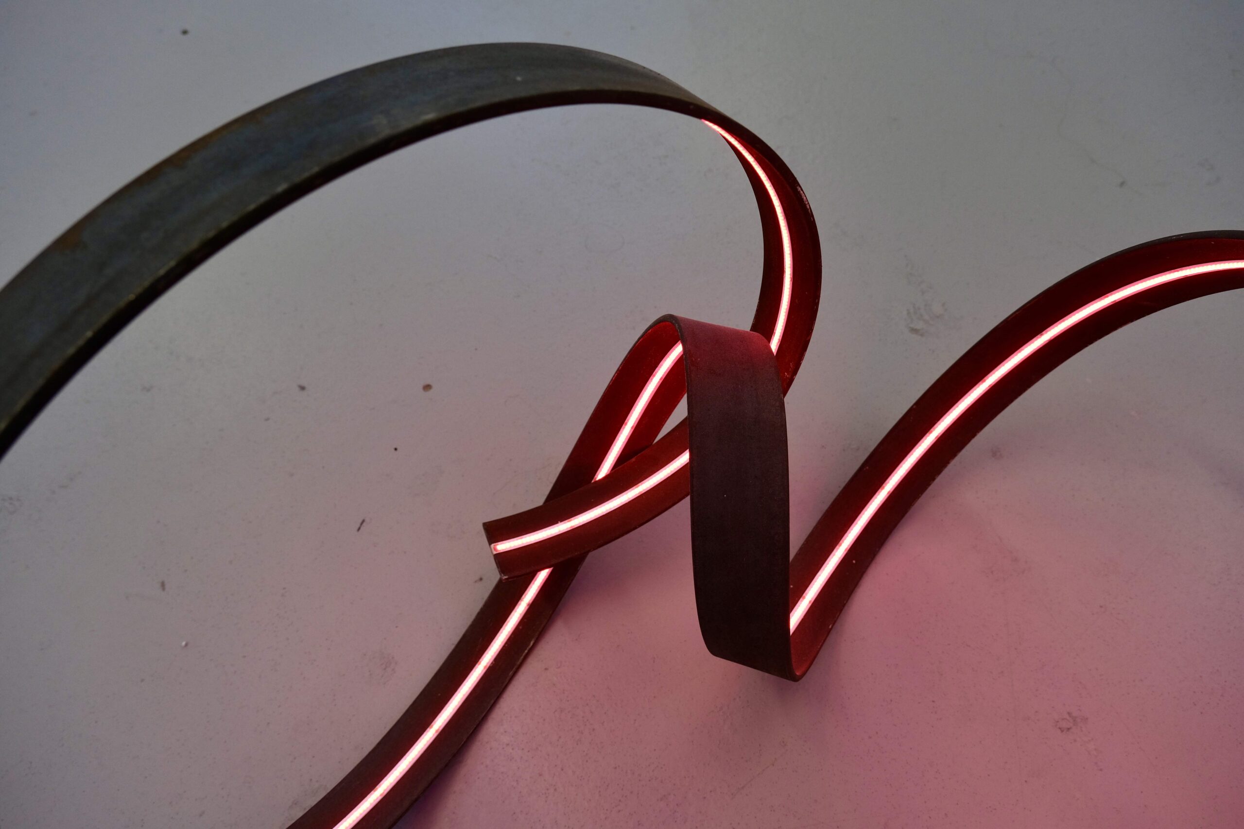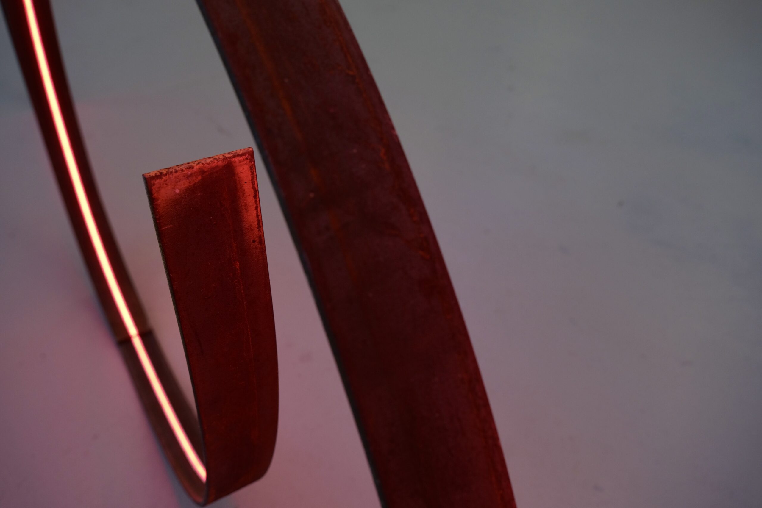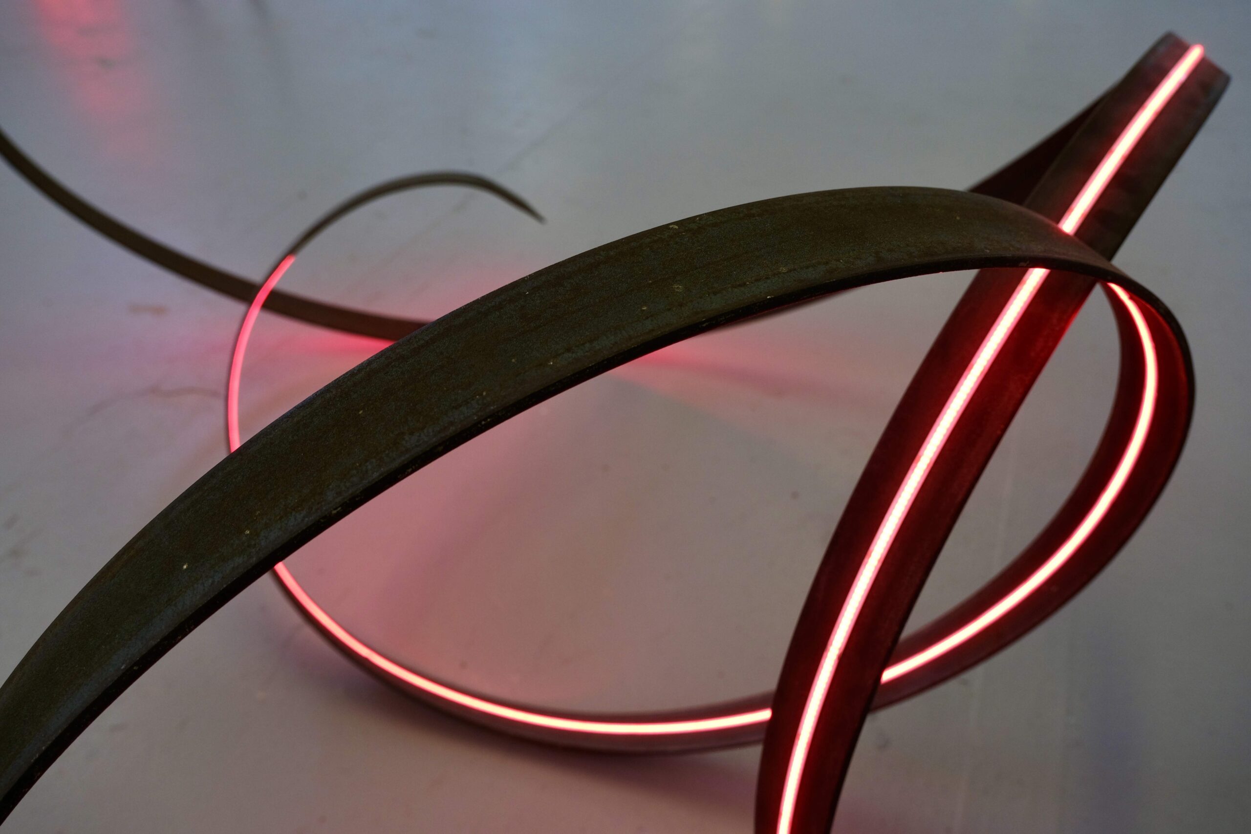 My work utilises geometric bodies, industrial materials and saturated red light to create landscapes of material which engage and activate the space in which they reside.Being the son of a labourer, I grew up on construction sites, unfinished and un-realised spaces. Exposed to an extensive set of construction materials from a young age I naturally garnered an understanding and admiration for this subject matter. My extensive use of steel and geometric forms derive themselves from this upbringing.These materials morph into ideas around fluidity and movement which conflicts with their intrinsic values. Large bars of metal contort to bothsoft, and elaborate curves which flow throughout the space it occupies. This allows us to rethink these materials as perhaps forms which hold potential as hosts for creative input and not simply as products for structure and integrity.I fuse these steel bodies with deep red light which acts as a tool to paint the spaces and forms which it comes in contact with. The red hue allows itself to separate from its surrounding and engage with the steel on which it flows upon creating a beautiful cursive scene.This pairing of the tangible and intangible to unveil these landscapes of light and steel creates a beautifully symbiotic partnership between these two heavily contrasting bodies of material that are now bound to each other within these sculptures.