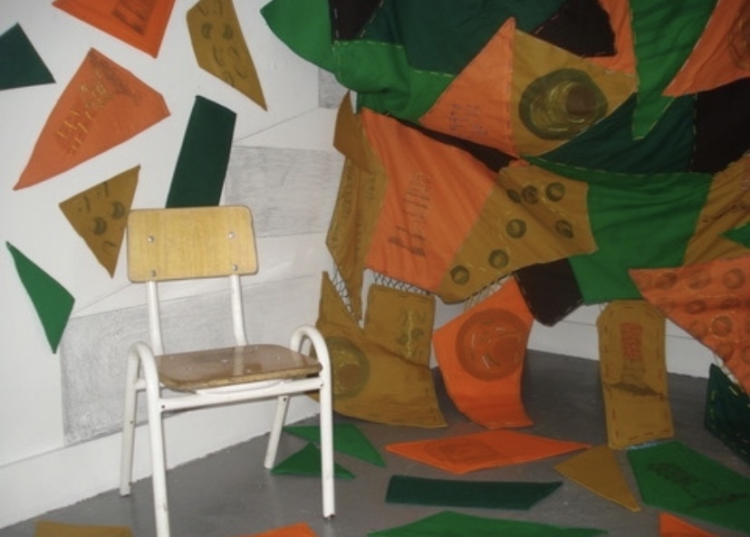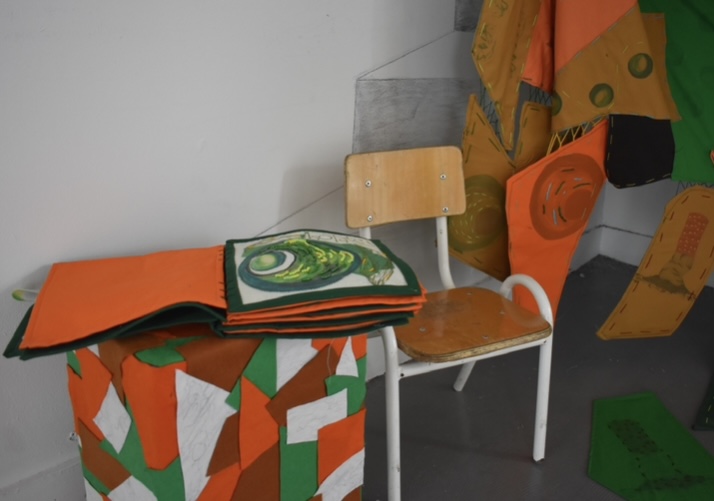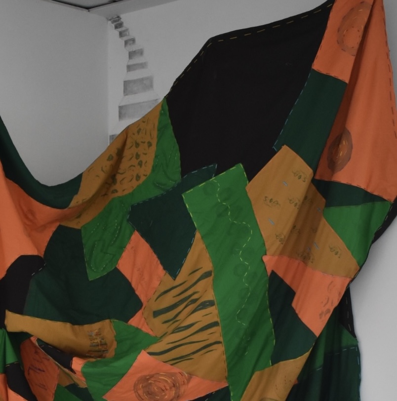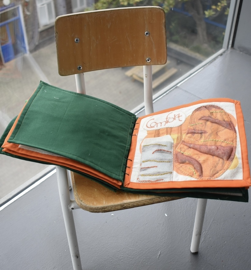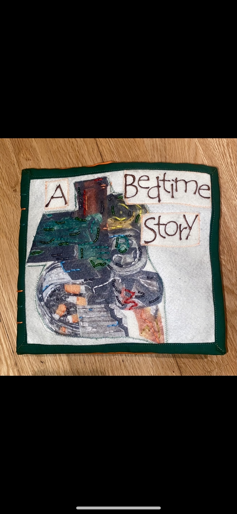 My starting point for this project was to brainstorm words associated withmy childhood experiences and memories, growing up in a household with an alcoholic. These words attempt to interpret and make visual connections to my experience, such as ‘isolate’, ‘lost time/gaps in time’ ‘danger/safety’, ‘euphoria/depression’ and most prevalently ‘unravel’. Visualising these words has resulted from selecting objects that act as a metaphor or communicator for these feelings and experiences. I equally want to explore the use of objects associated with alcohol in the home, the destructive duplicity of the hidden bottles and empty glasses and cans to physically break these down /to pulverize these objects. This imagery is contrasted with personal comforts from my childhood, such as my teddy, and displayed on objects typically associated with childhood, to represent the jarring reality of seeing alcoholism through the eyes of a child. I used textile materials and processes for my final outcome to create a book and quilt/ wall hanging.