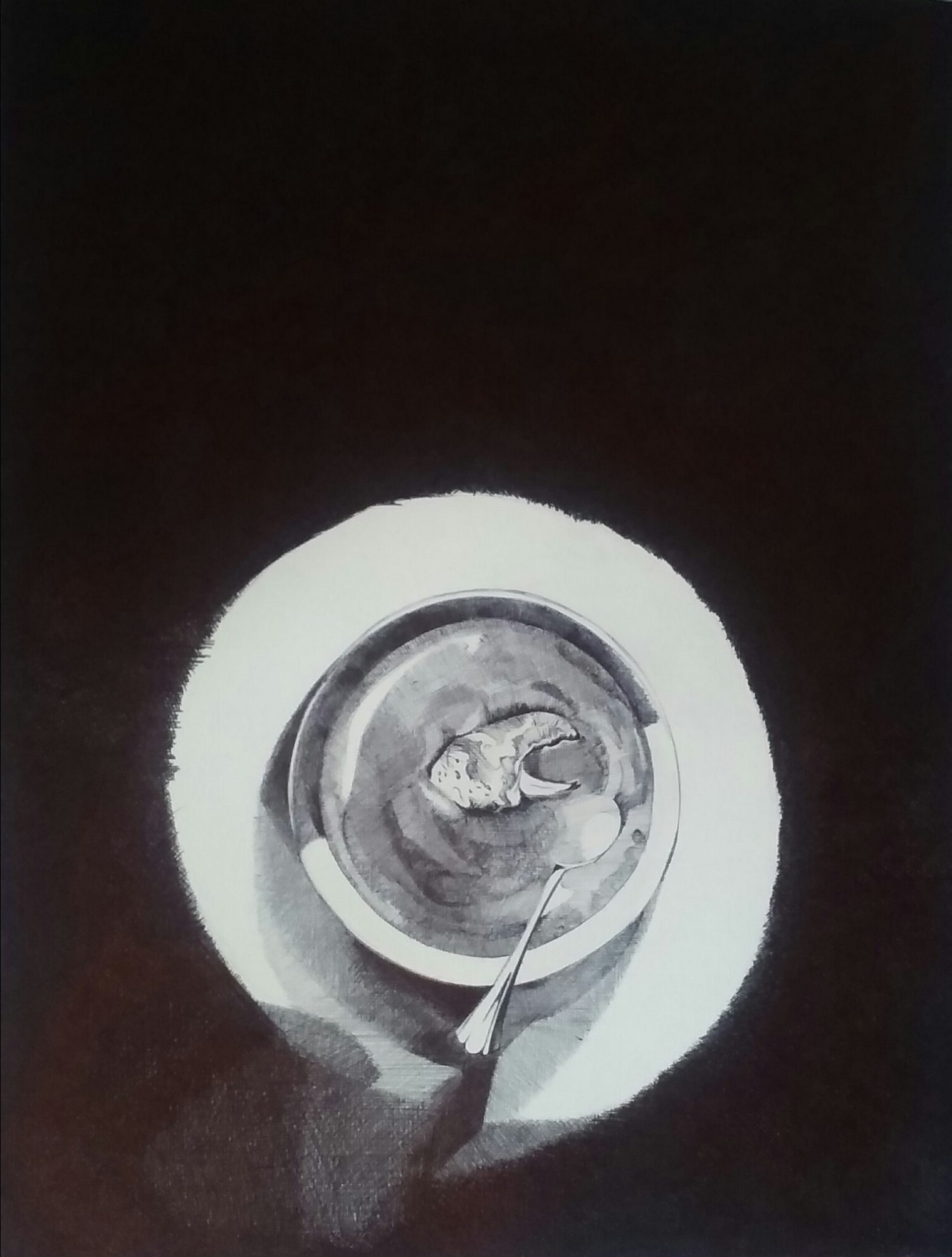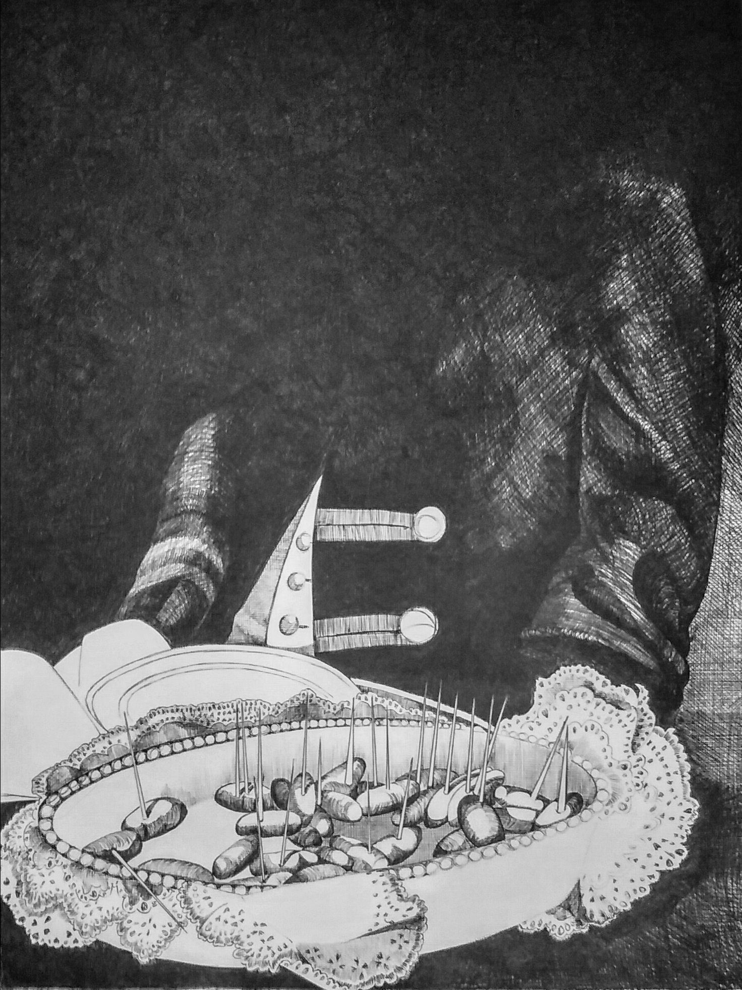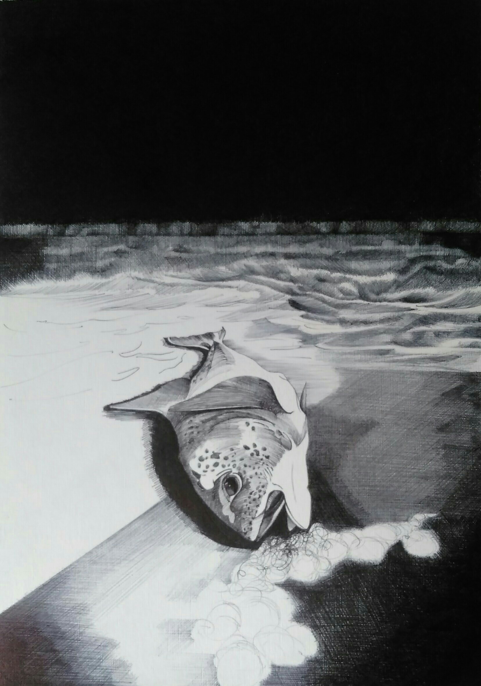 I have selected black biro and paired it with artist quality canvas textured paper. Working with biro brings its own constraints and rules. The biro is unyielding and once a line is drawn, it cannot be erased. The extensive areas of blackness, where the pen has expended itself onto the page, shift and fall like a velvet curtain. The paper is not fully saturated, tiny white points like dust motes float as if in an atmosphere charged room. In these apparently banal images, there are parallels with the acceptance of the mania for killing during WW2 and the mania for slaughter to satisfy consumerism today. This series consists of 28 Drawings on canvas textured paper, size A3. My article printed in the Irish Times 09/07/2021 explains the exciting history of this humble tool, the common biro.