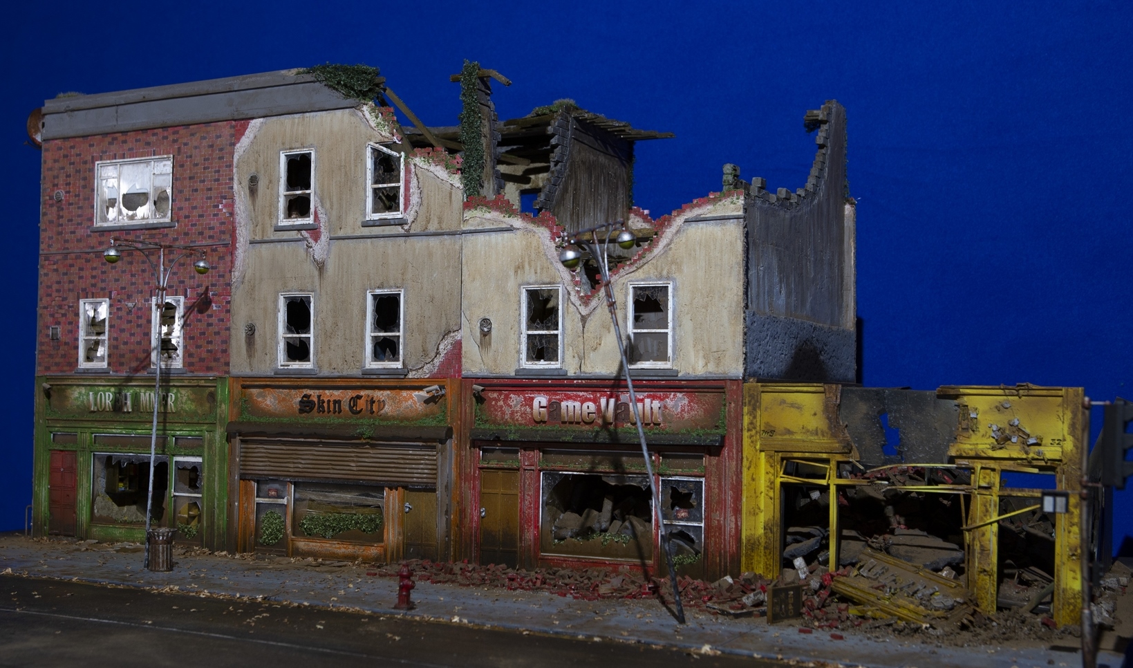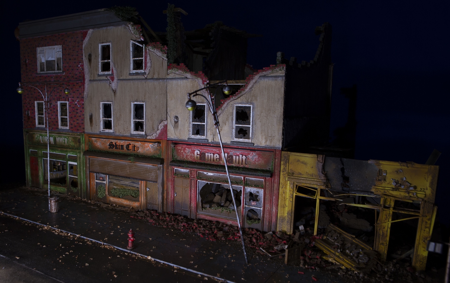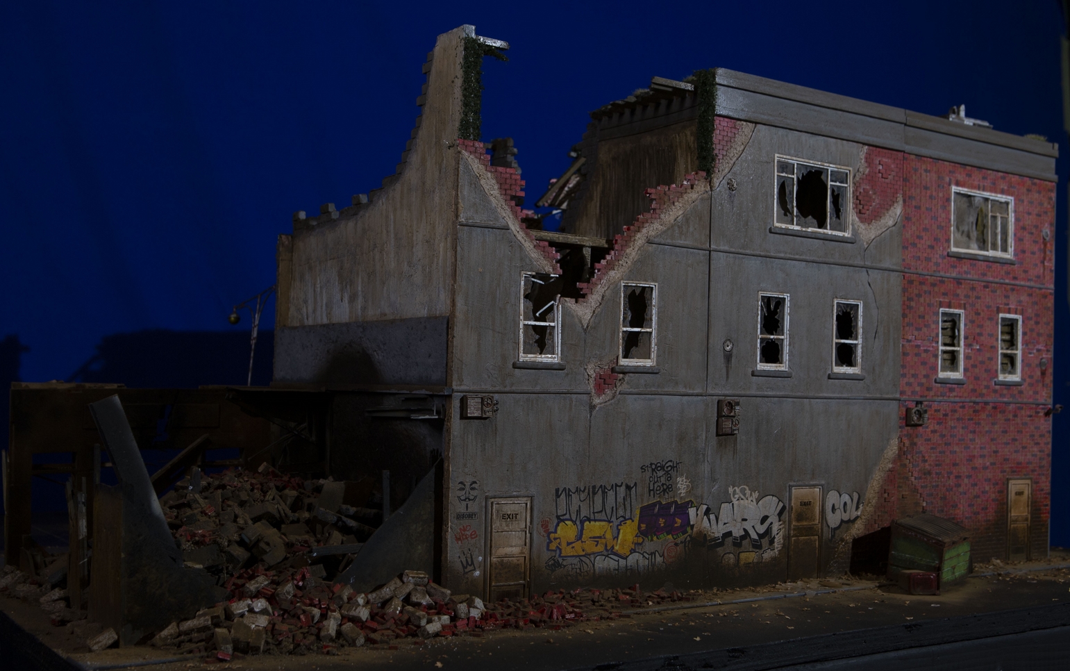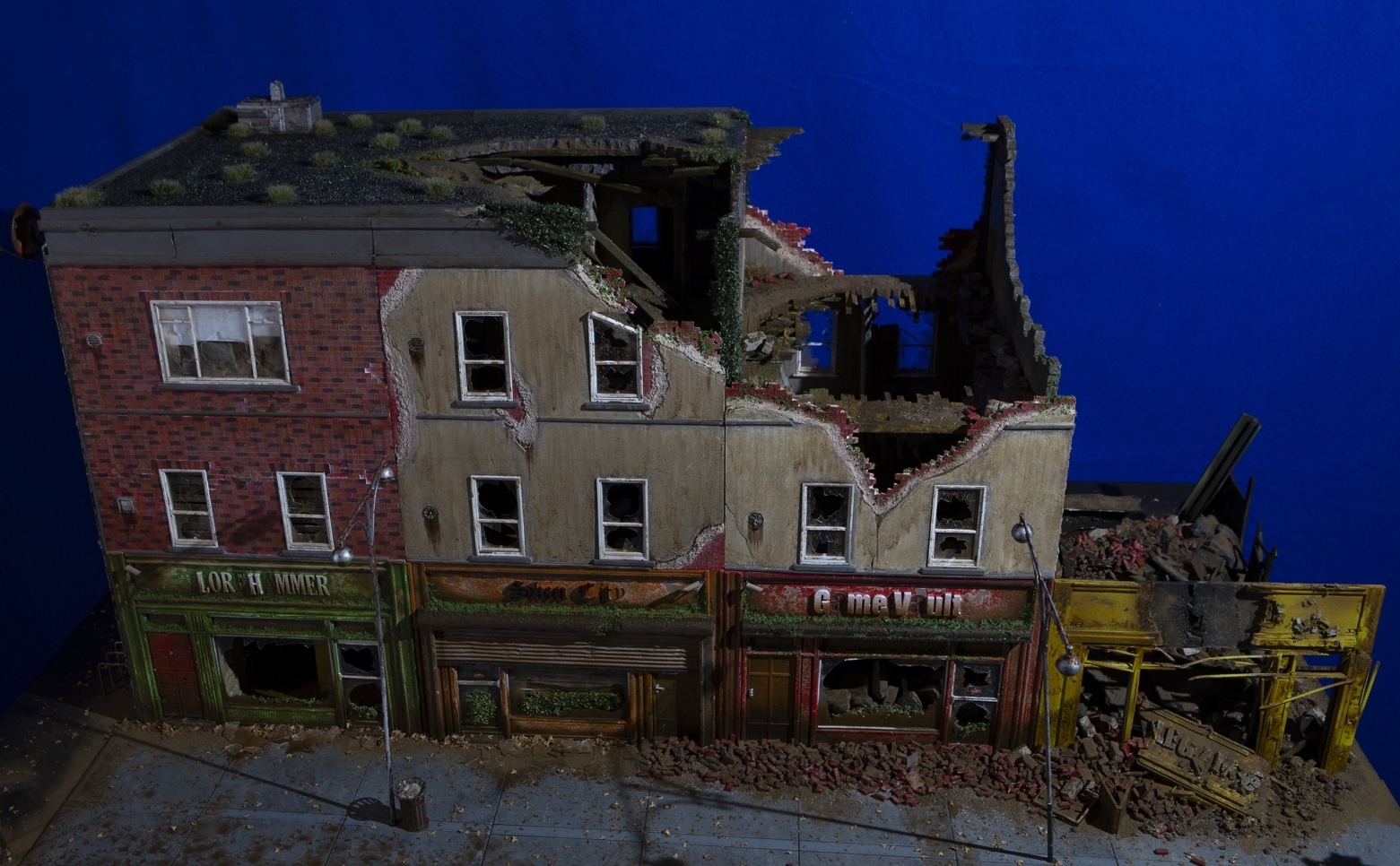 My name is Garrett Kavanagh from Gorey Co Wexford and this was my final project for 3D Design Modelmaking + Digital Art at IADT. I was interested in this course as I wanted to create movie props for film but as the years went by I rediscovered my passion for miniature models. The model was built to be a shooting miniature but is more in line with a display model/diorama due to the amount of detail. The model is built to 1:28th scale sitting on a 100cm x 71cm base. The building takes inspiration from structures in New York, combined with some elements from Irish architecture. The idea I had for the setting of this world was post apocalyptic. A devastating war that had taken place 10 years prior leaving only 30% of the world population alive. This would be in line with the theme of a film or TV show based on that setting so that a model like this could be used in as a shooting miniature.