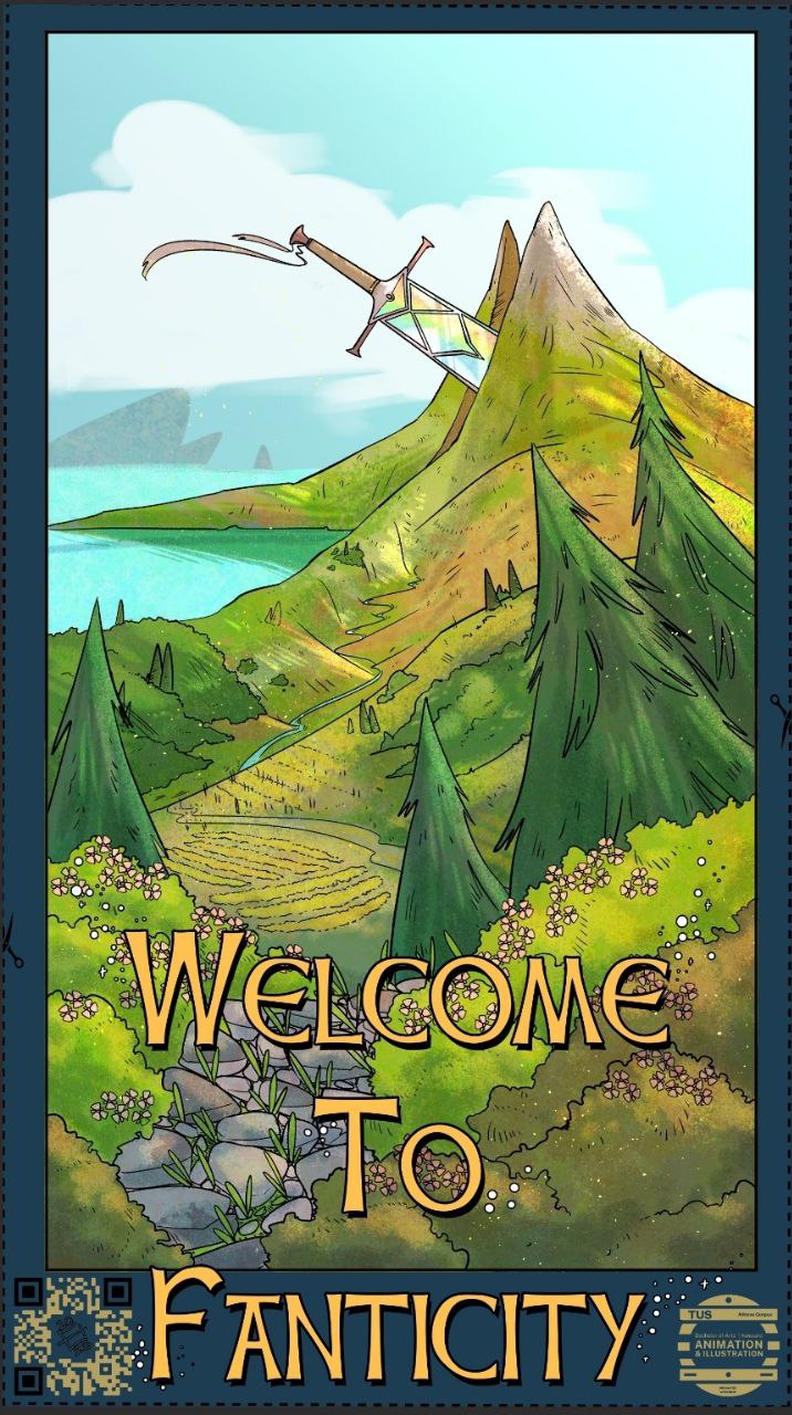Welcome to Fanti-City is an environmental storyteling animation with emphasis on backgroundenvironments in the form of a tourism videoI created this film to explore a fantasy environment based on a world I plan on using for TTRPGs such asDungeons and Dragons. It's an outlet for world building and exploration into story telling. This film evokeswonder and awe to explore a fantasy world as you would explore a real-world place. This is highly inspiredby many of Irelands old and new travel advertsThis project is a 2-minute 2D digital ilustrated animation made using segmented layered ilustration in a 3-dimensional space to create a sense of expanse and openness, using paralaxing effects to achieve it.
